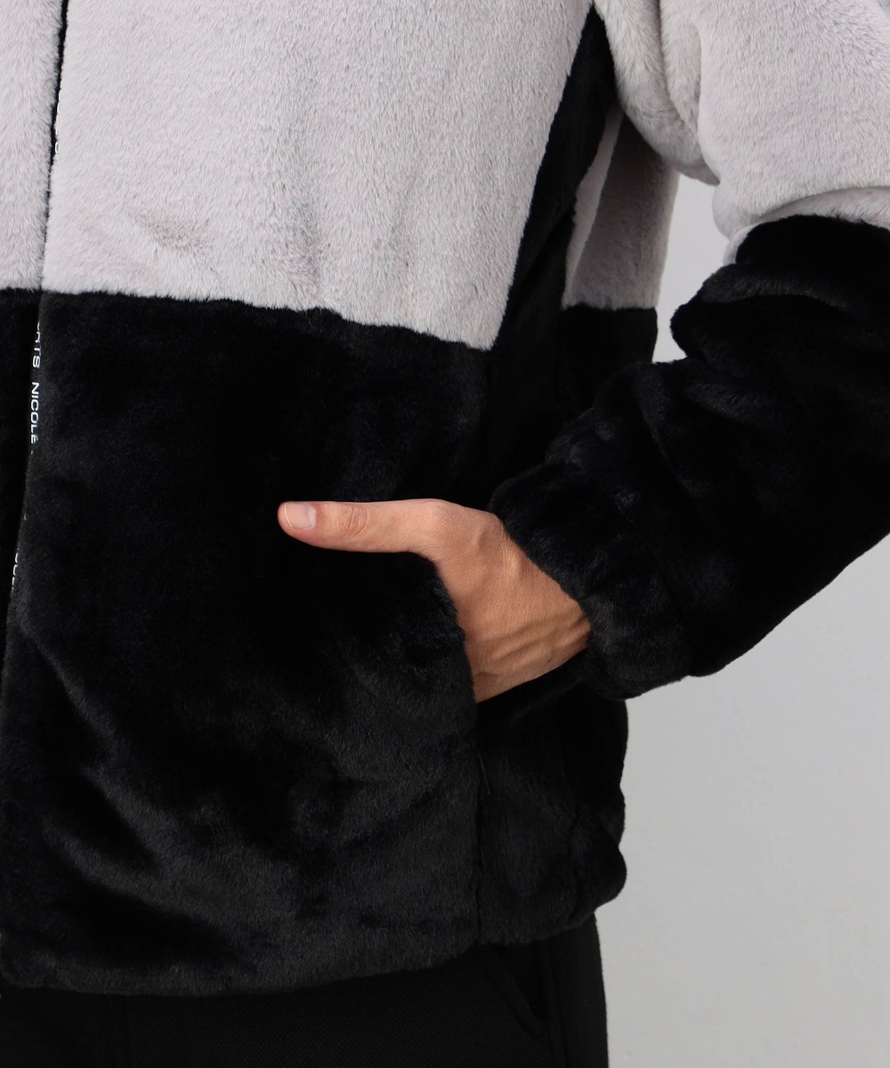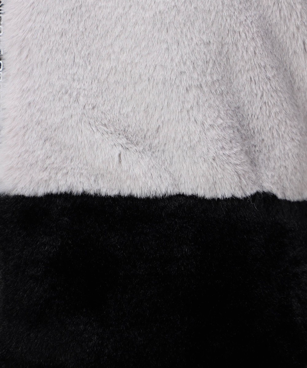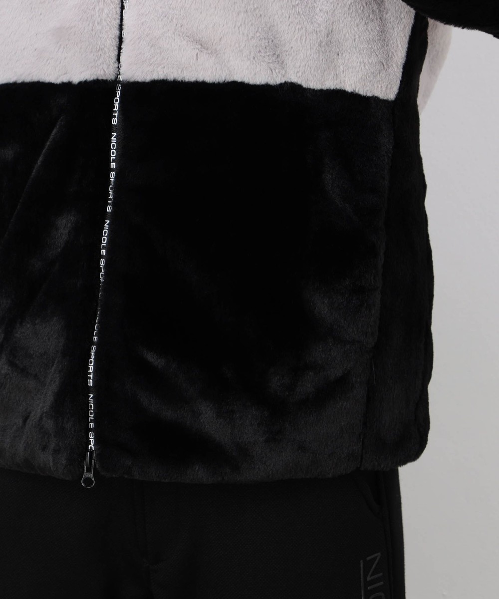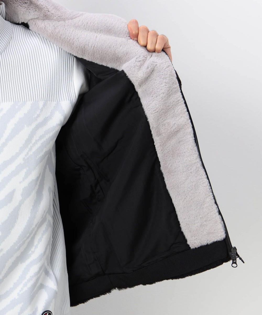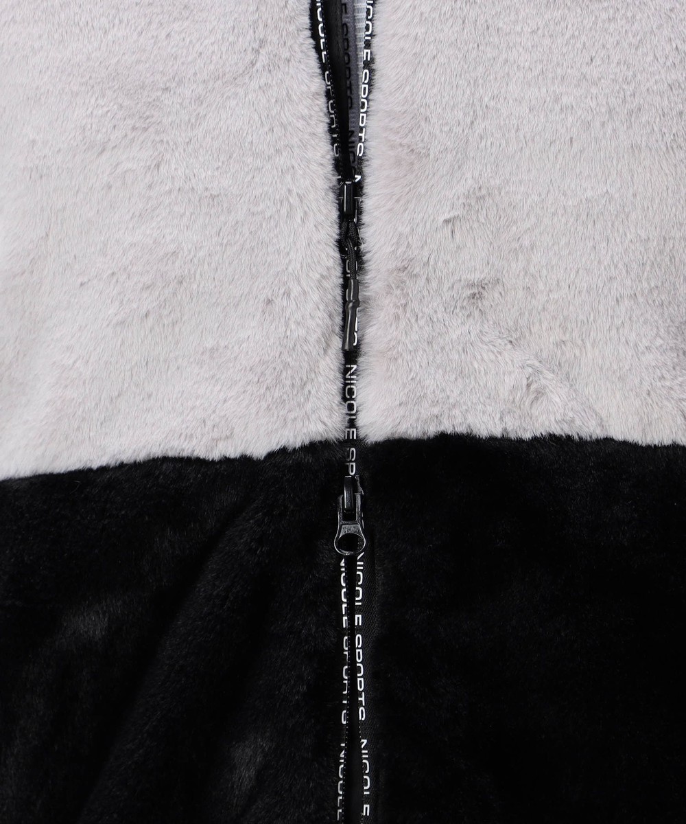 スタンドカラーのファーブルゾン。袖のバランスとウエスト~裾廻りを少しシェイプさせ、野暮ったいシルエットにならない様に調整しています。切り替えを利用した配色デザインと、その切り替えを利用してシルエットを作っています。後身から右袖にまたがせたパッチワークロゴ刺繍をアクセントにしています。裾裏にはしっかりとした不織布タイプの芯地を貼った別生地仕様、袖口には平ゴムを仕込み防風性を高めています。厚手のポリエステル別布を使用して厚み解消やファスナー噛みの防止の持ち出しを作っています。