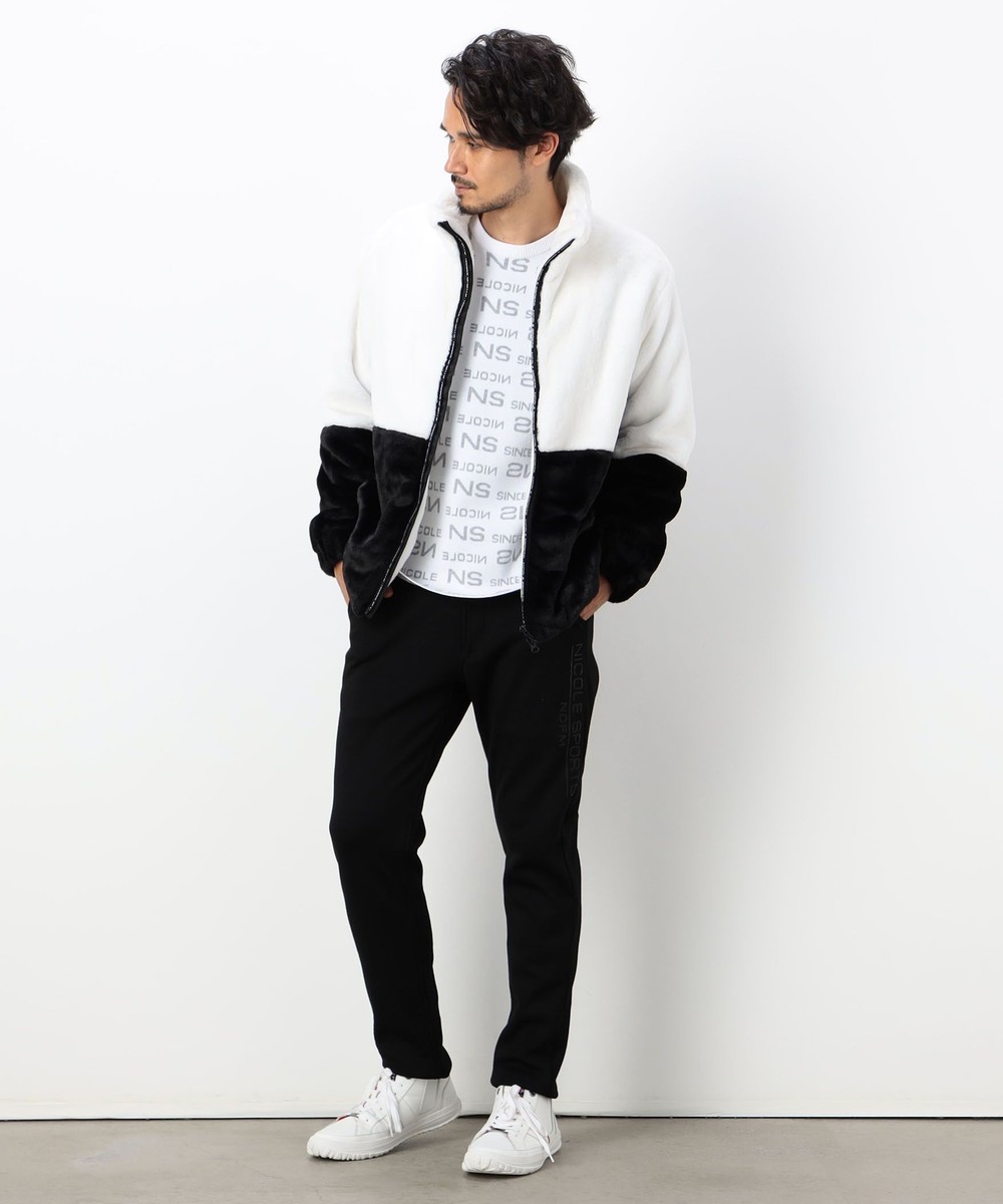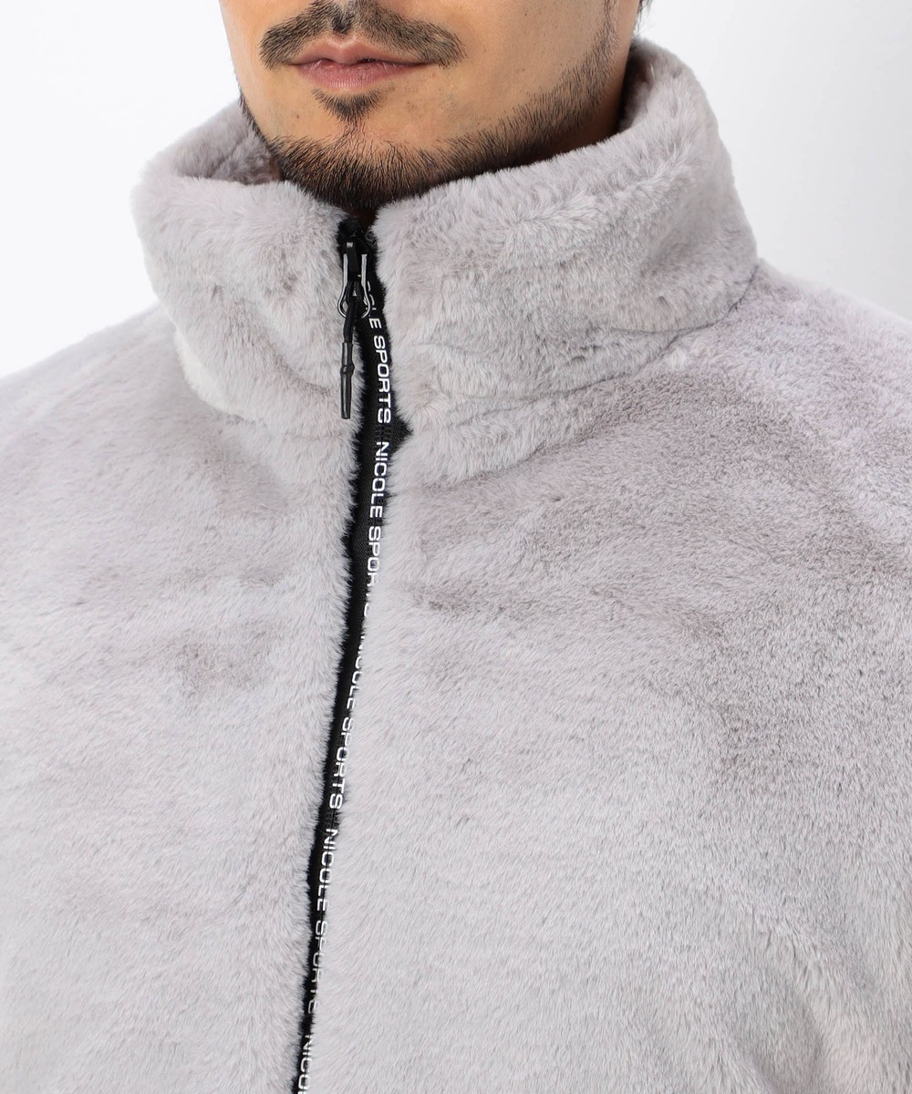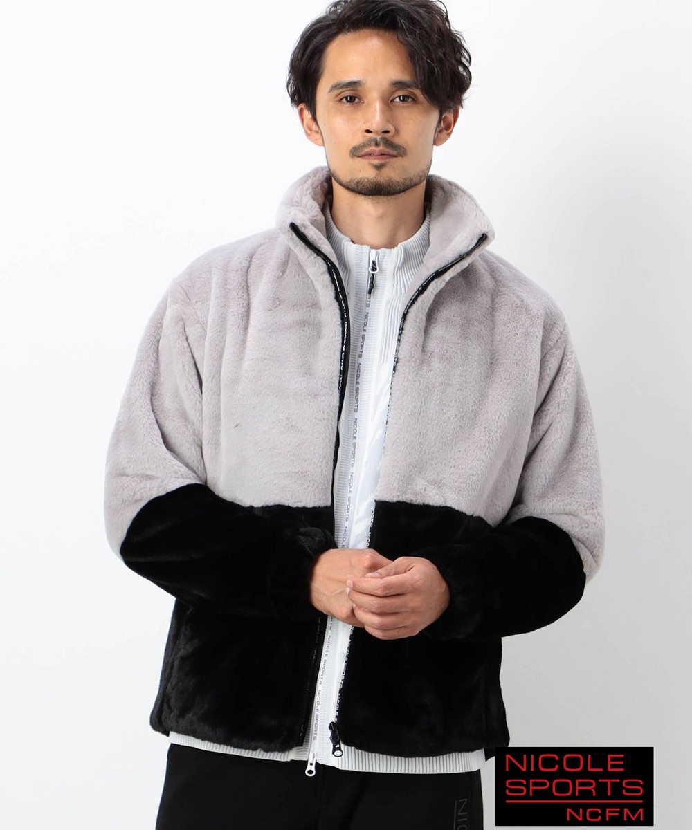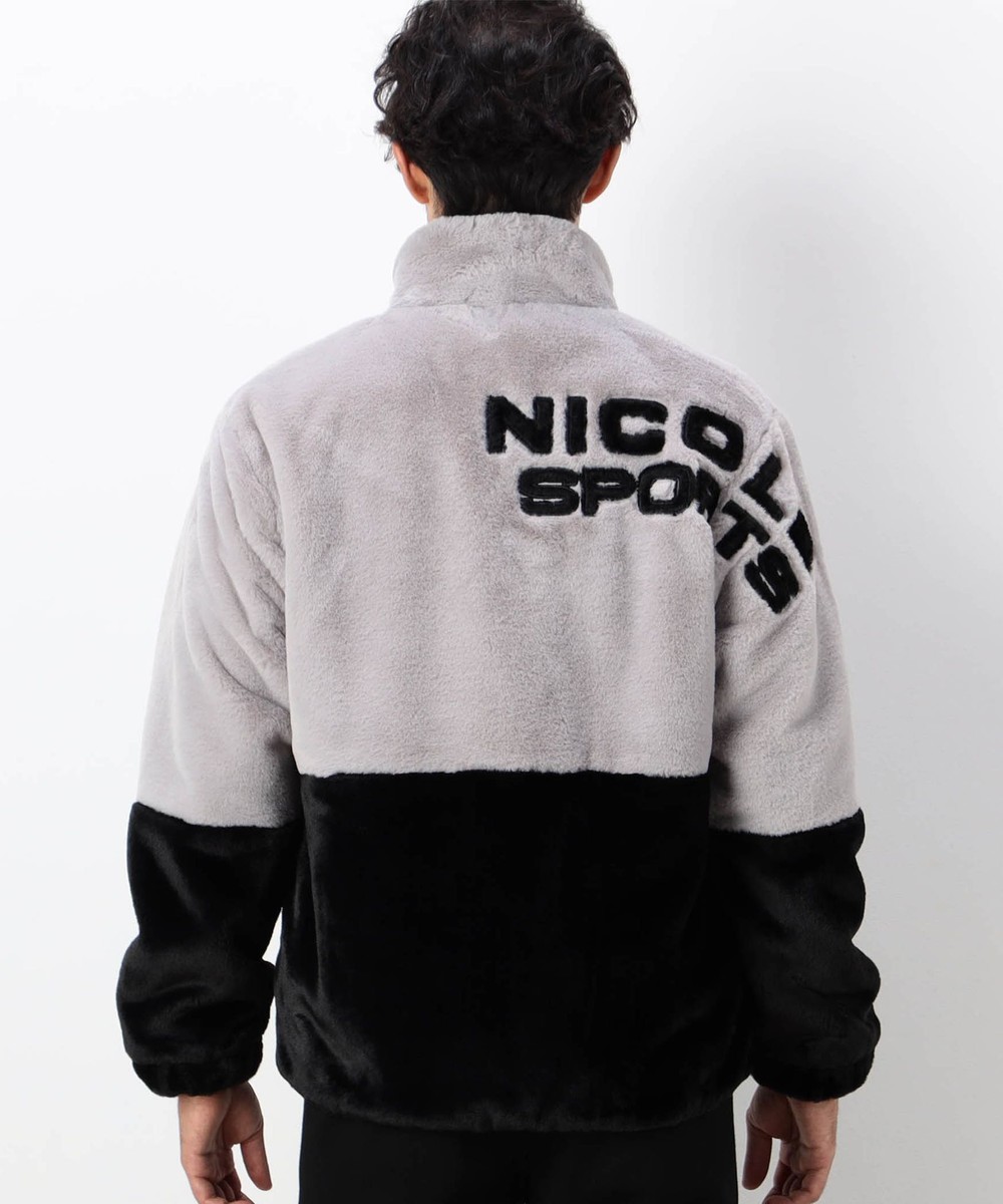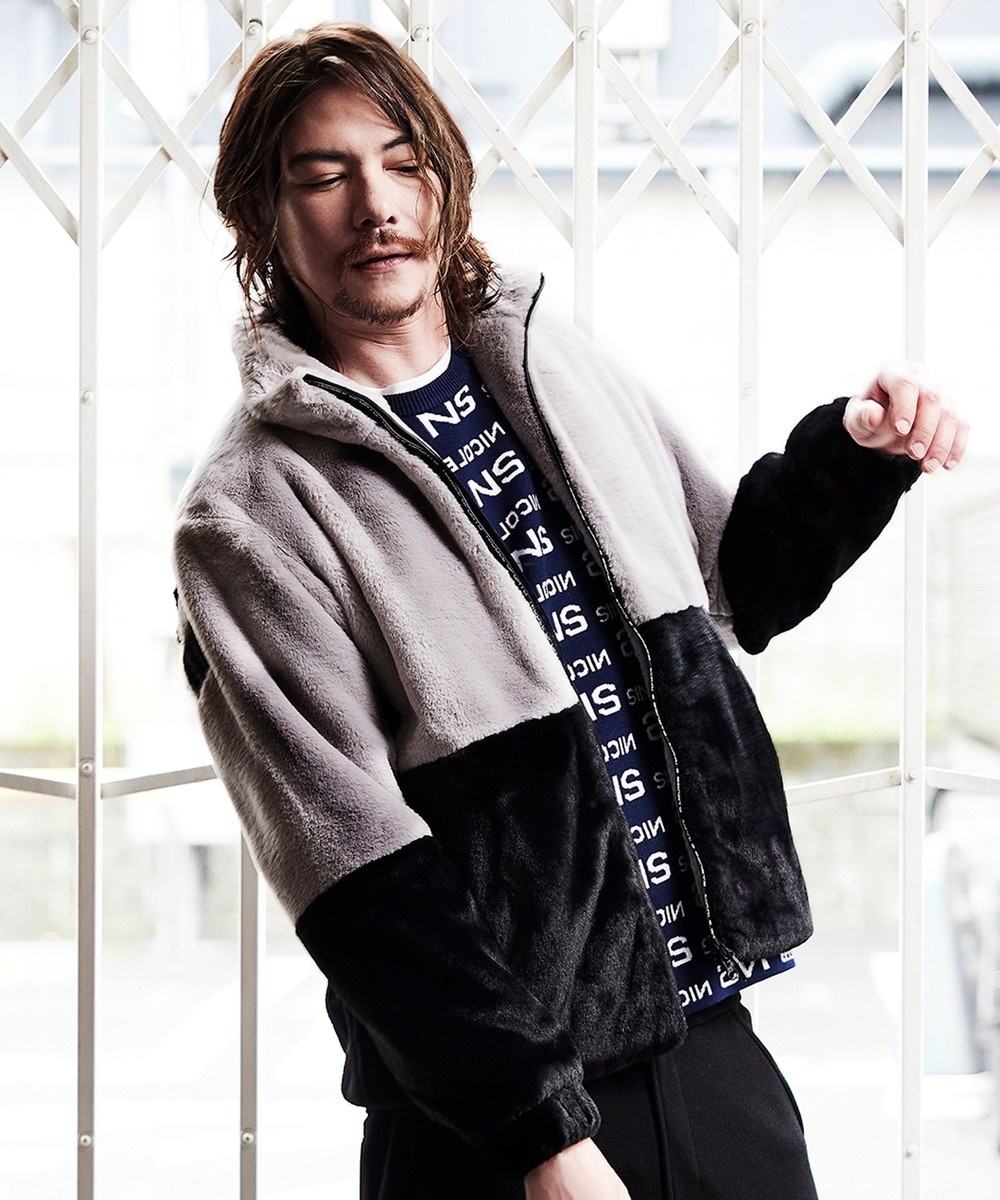スタンドカラーのファーブルゾン。袖のバランスとウエスト~裾廻りを少しシェイプさせ、野暮ったいシルエットにならない様に調整しています。切り替えを利用した配色デザインと、その切り替えを利用してシルエットを作っています。後身から右袖にまたがせたパッチワークロゴ刺繍をアクセントにしています。裾裏にはしっかりとした不織布タイプの芯地を貼った別生地仕様、袖口には平ゴムを仕込み防風性を高めています。厚手のポリエステル別布を使用して厚み解消やファスナー噛みの防止の持ち出しを作っています。