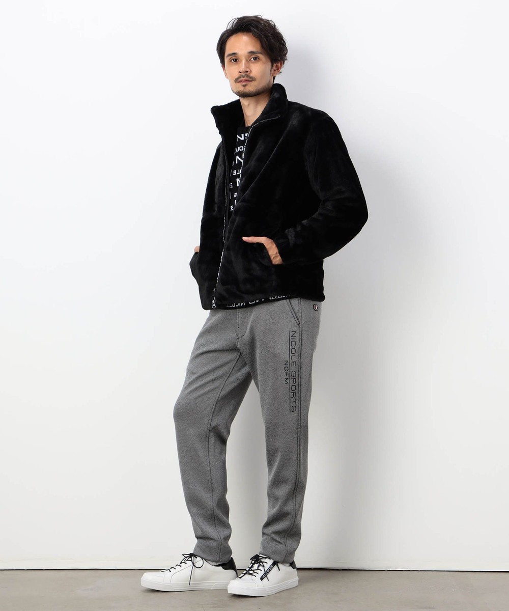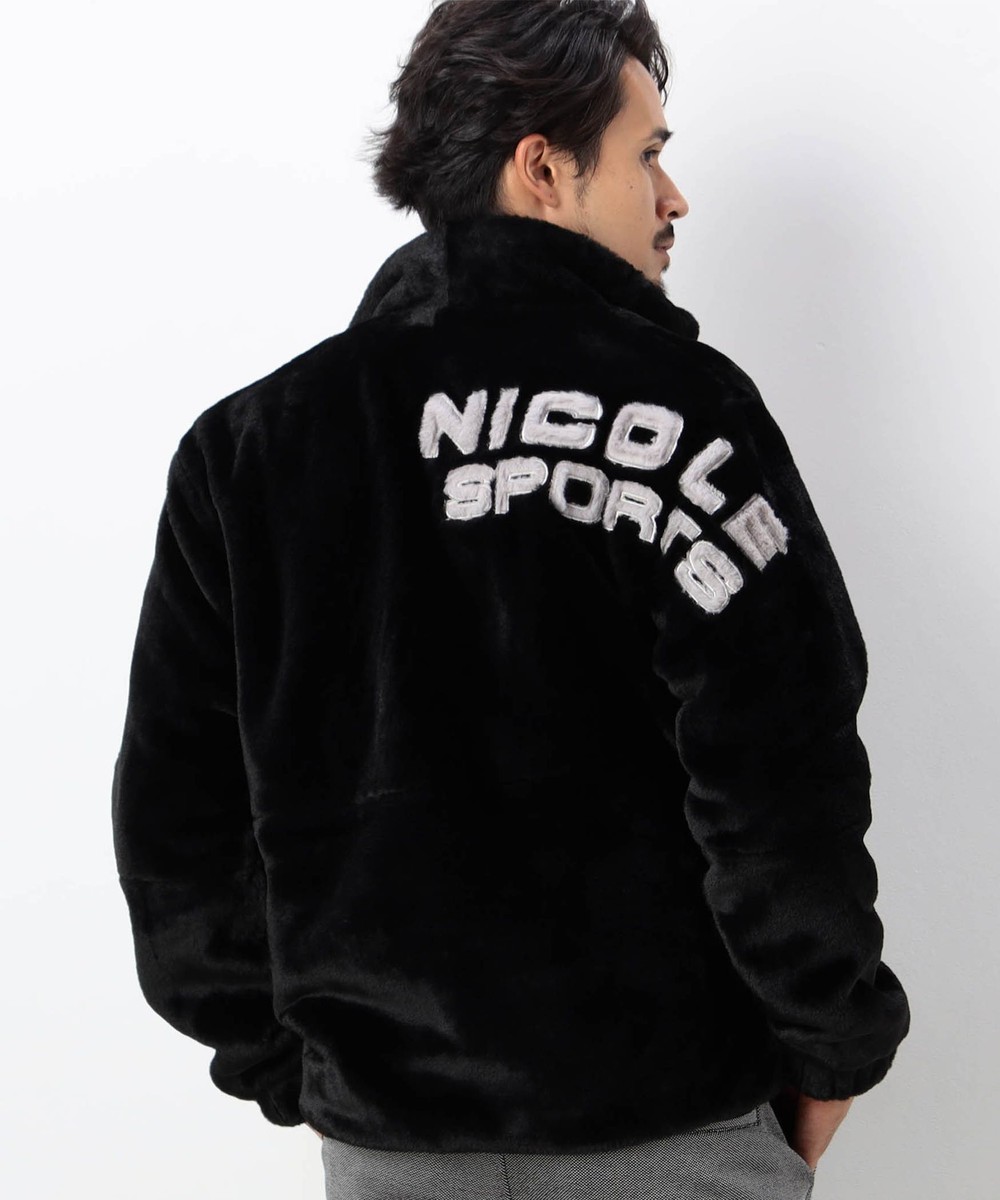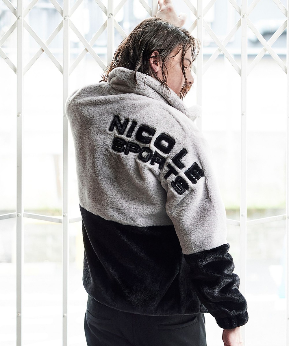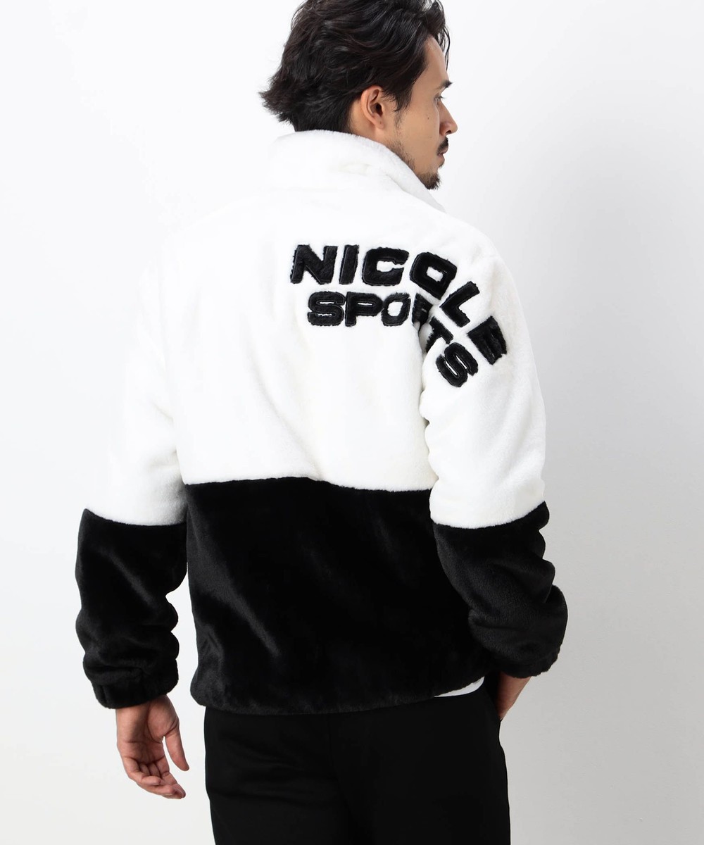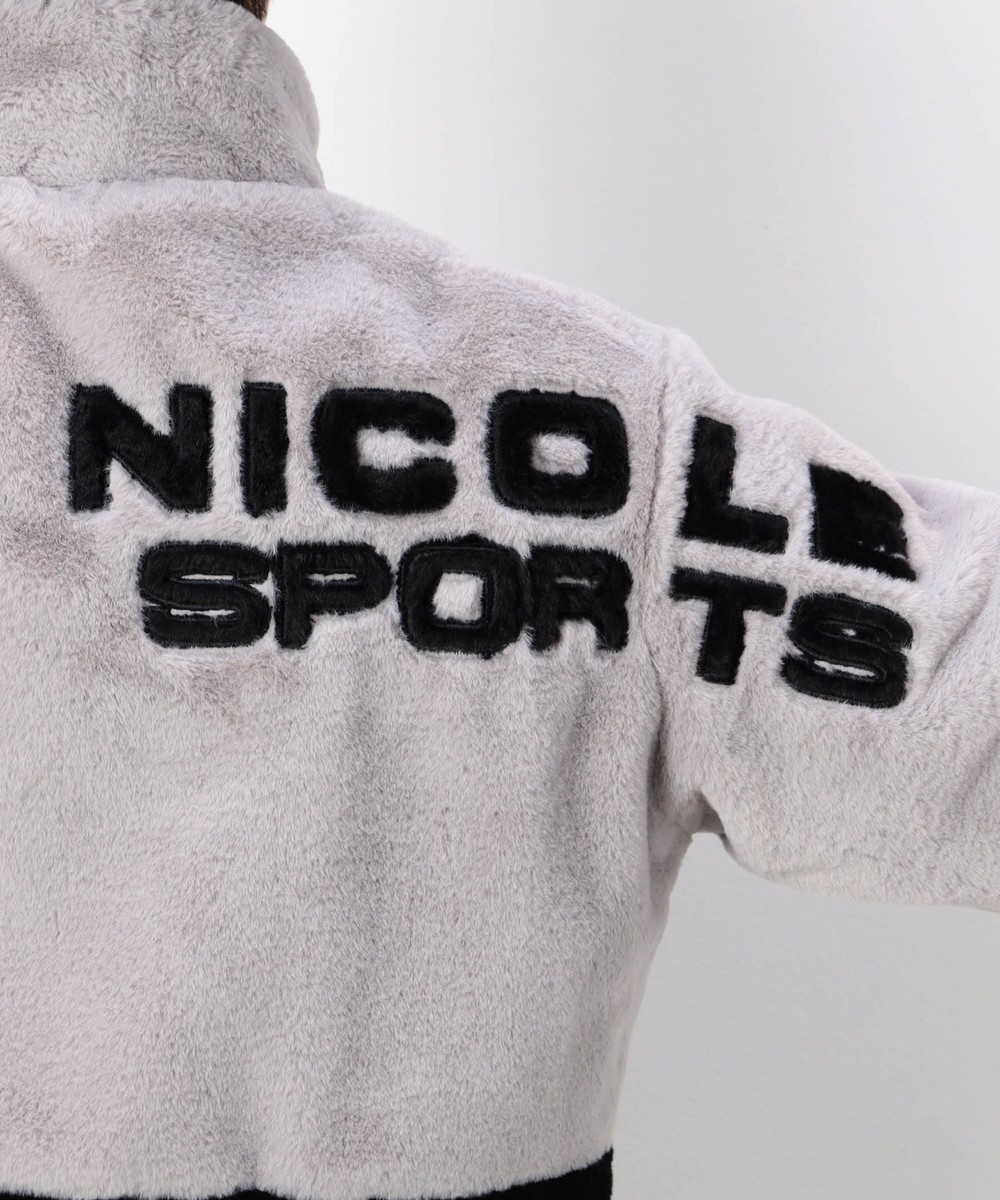 スタンドカラーのファーブルゾン。袖のバランスとウエスト~裾廻りを少しシェイプさせ、野暮ったいシルエットにならない様に調整しています。切り替えを利用した配色デザインと、その切り替えを利用してシルエットを作っています。後身から右袖にまたがせたパッチワークロゴ刺繍をアクセントにしています。裾裏にはしっかりとした不織布タイプの芯地を貼った別生地仕様、袖口には平ゴムを仕込み防風性を高めています。厚手のポリエステル別布を使用して厚み解消やファスナー噛みの防止の持ち出しを作っています。