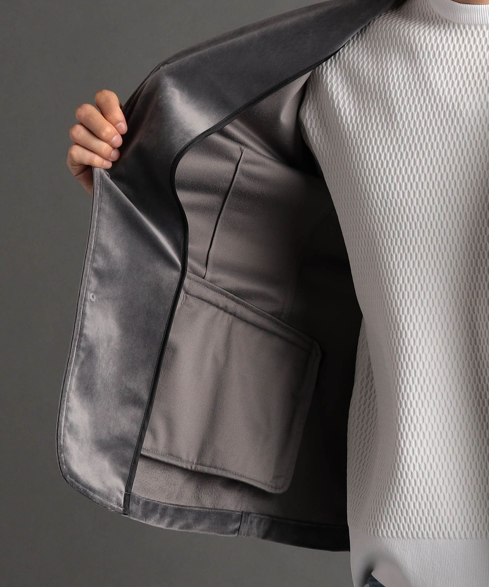 襟回りのプラスティックワイヤーで自在なスタンドカラースタイルが可能なブルゾンです。