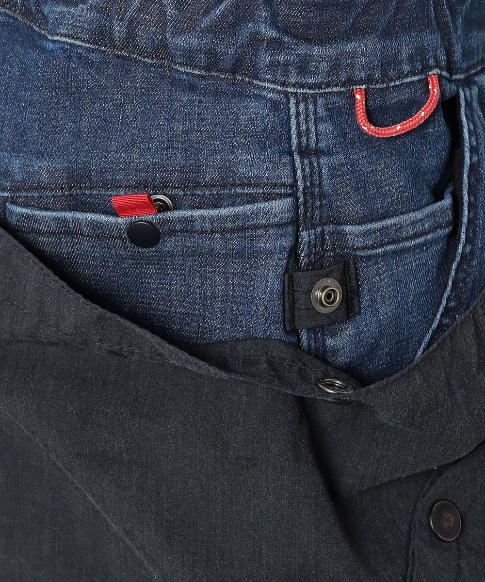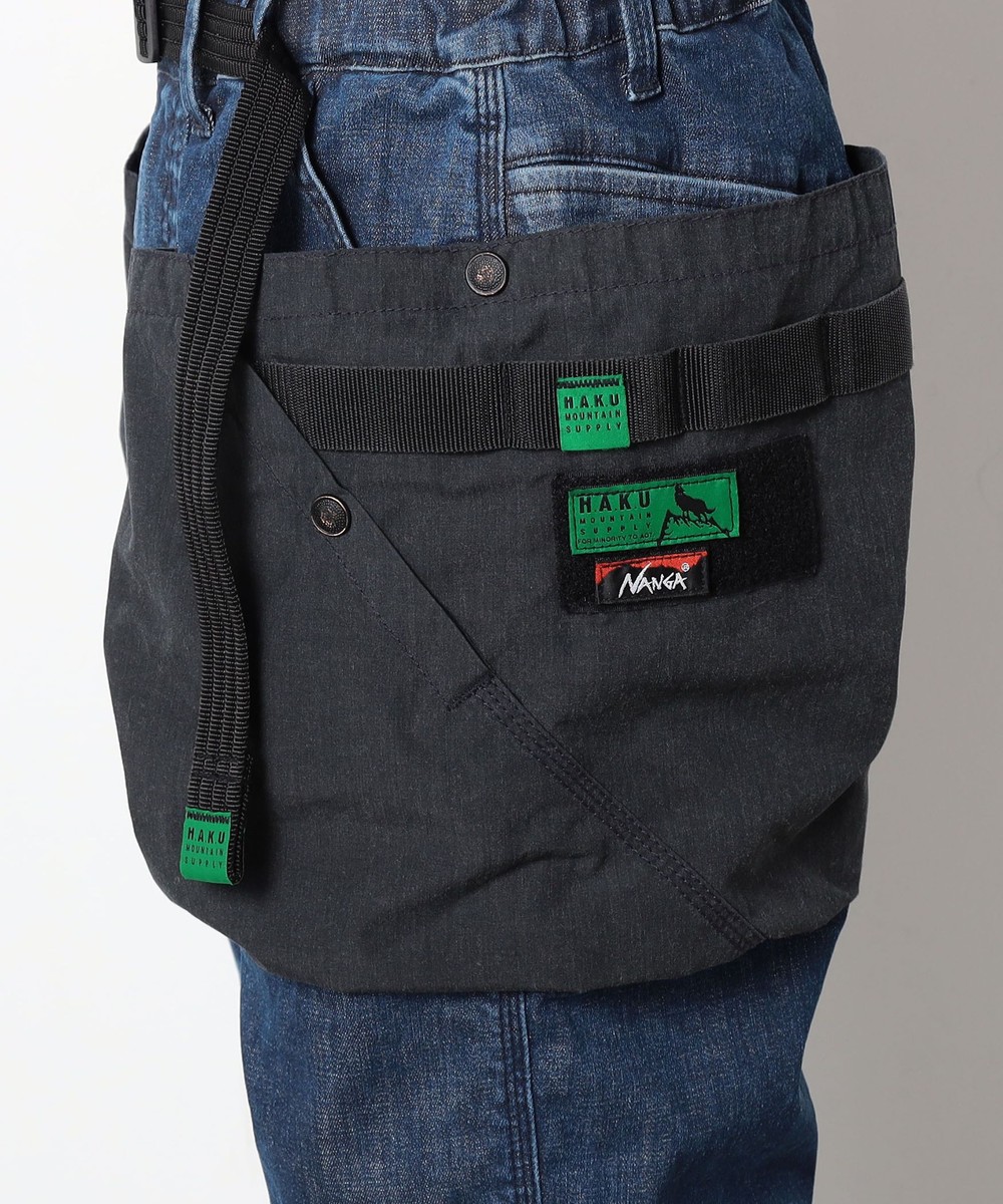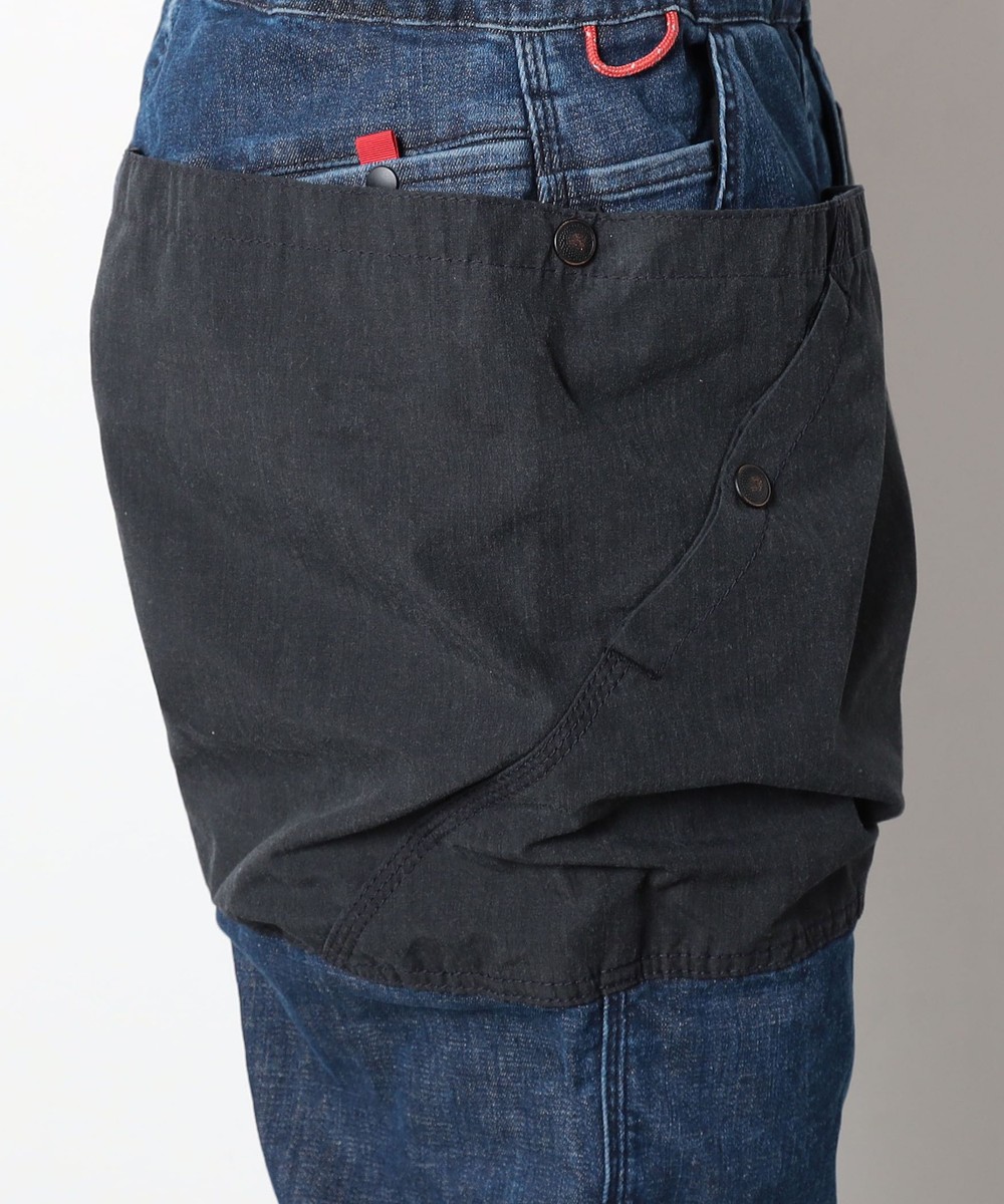大きなIPADの様なデバイスや、農作業中の収穫した野菜や道具だってガシガシ入れられる。もちろん釣り上げた獲物だって入れられる。濡れたり泥で汚れたりしても気にしない。左側にはデイジーチェーンなんでも引っ掛けてガシガシ使える。まるでウェアラブルバッグ=「カバンを穿いているかの様な収納力」そんなオーバースペックを楽しむディテールです。