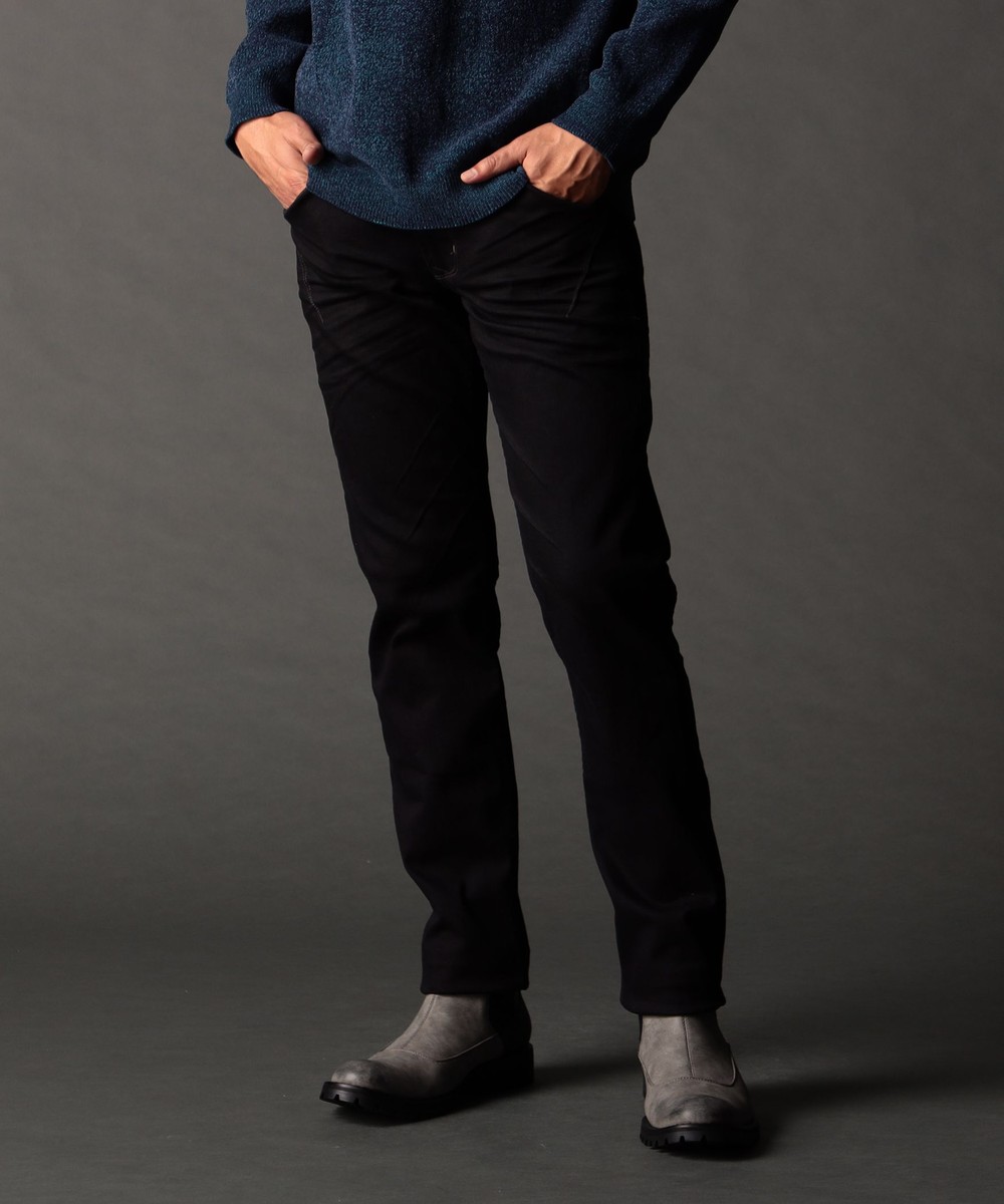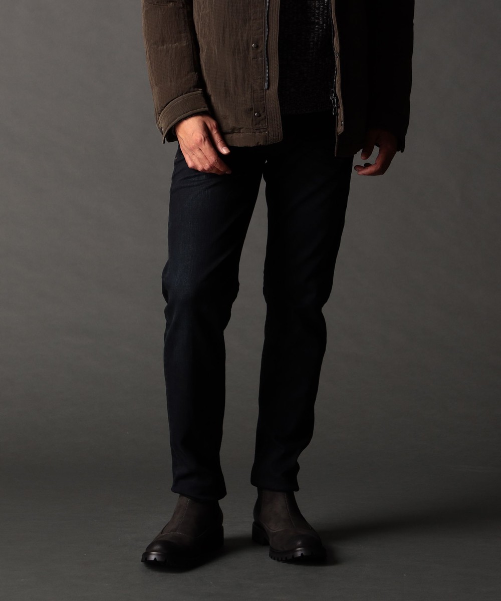 膝から裾口にかけて少しゆとりを出した程良いスリムストレートシルエットの細身の綺麗なラインです。股下はフルレングスなので裾上げして調整してください。