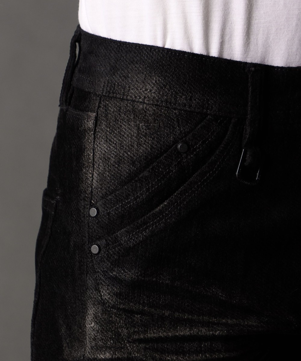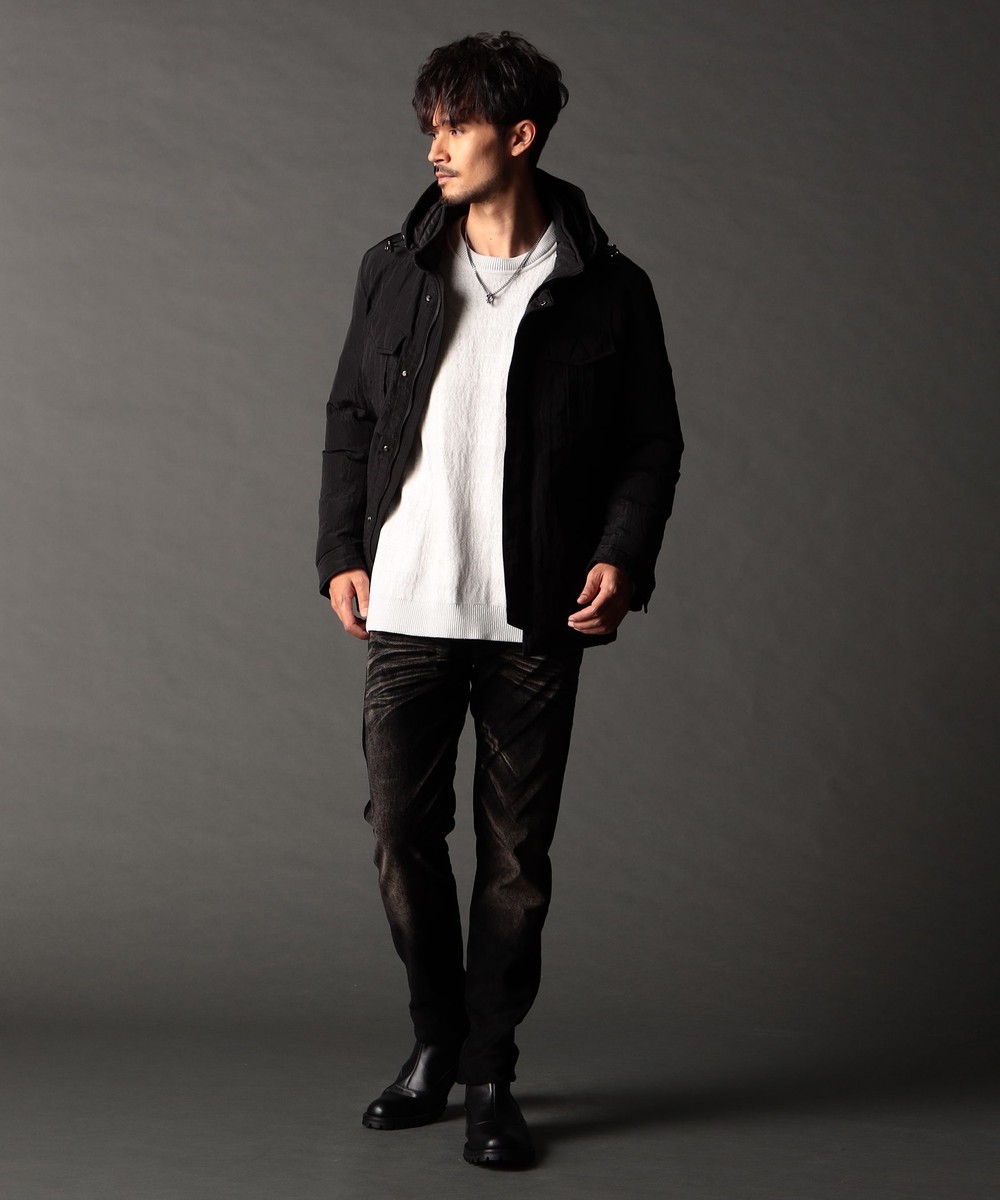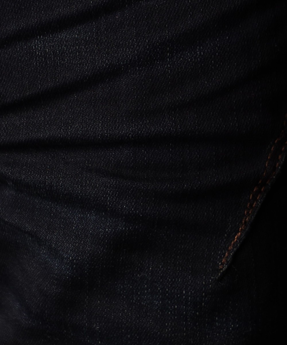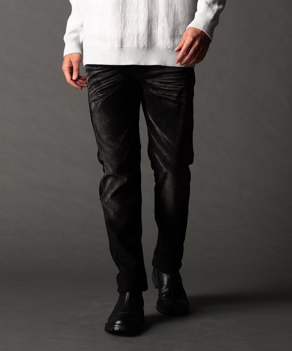 91その他2は、インディゴデニムをベースにワンウォッシュ程度の洗い加工をしてから、3Dシワ加工と顔料吹き付け加工を施しています。リジットデニムの様な濃色で綺麗めなスタイルでも合わせられるイメージに仕上げています。