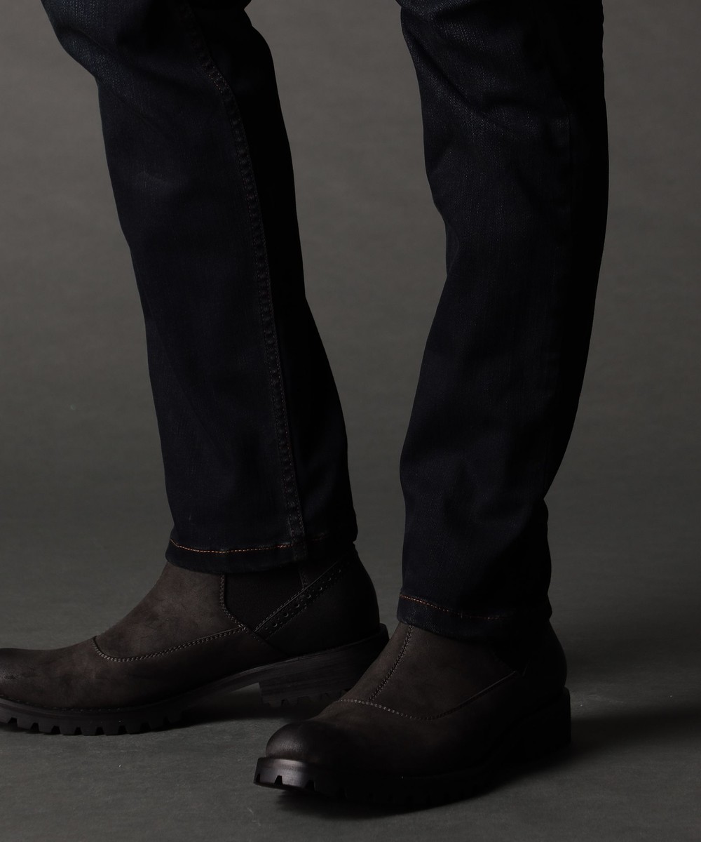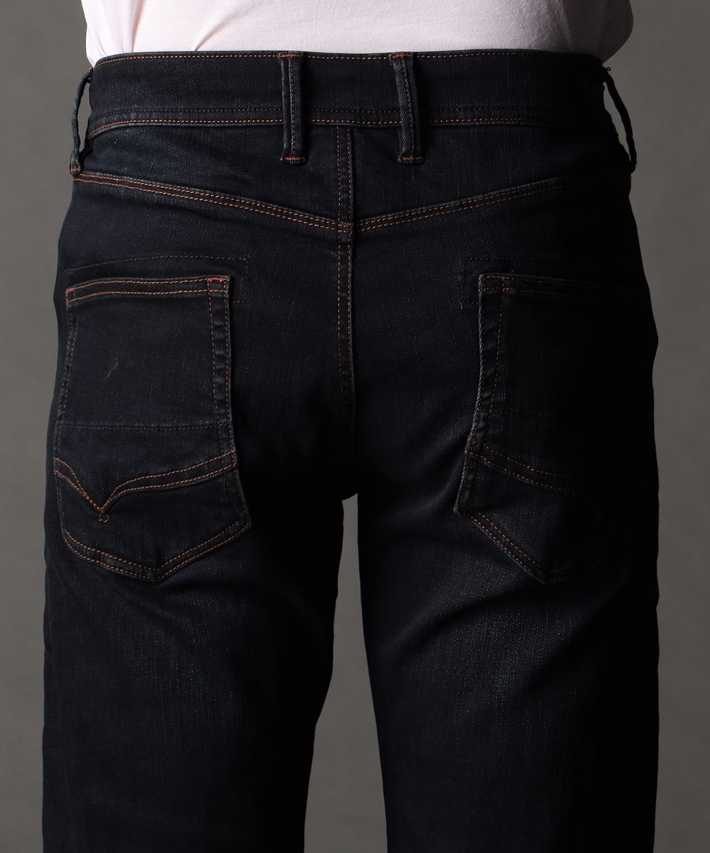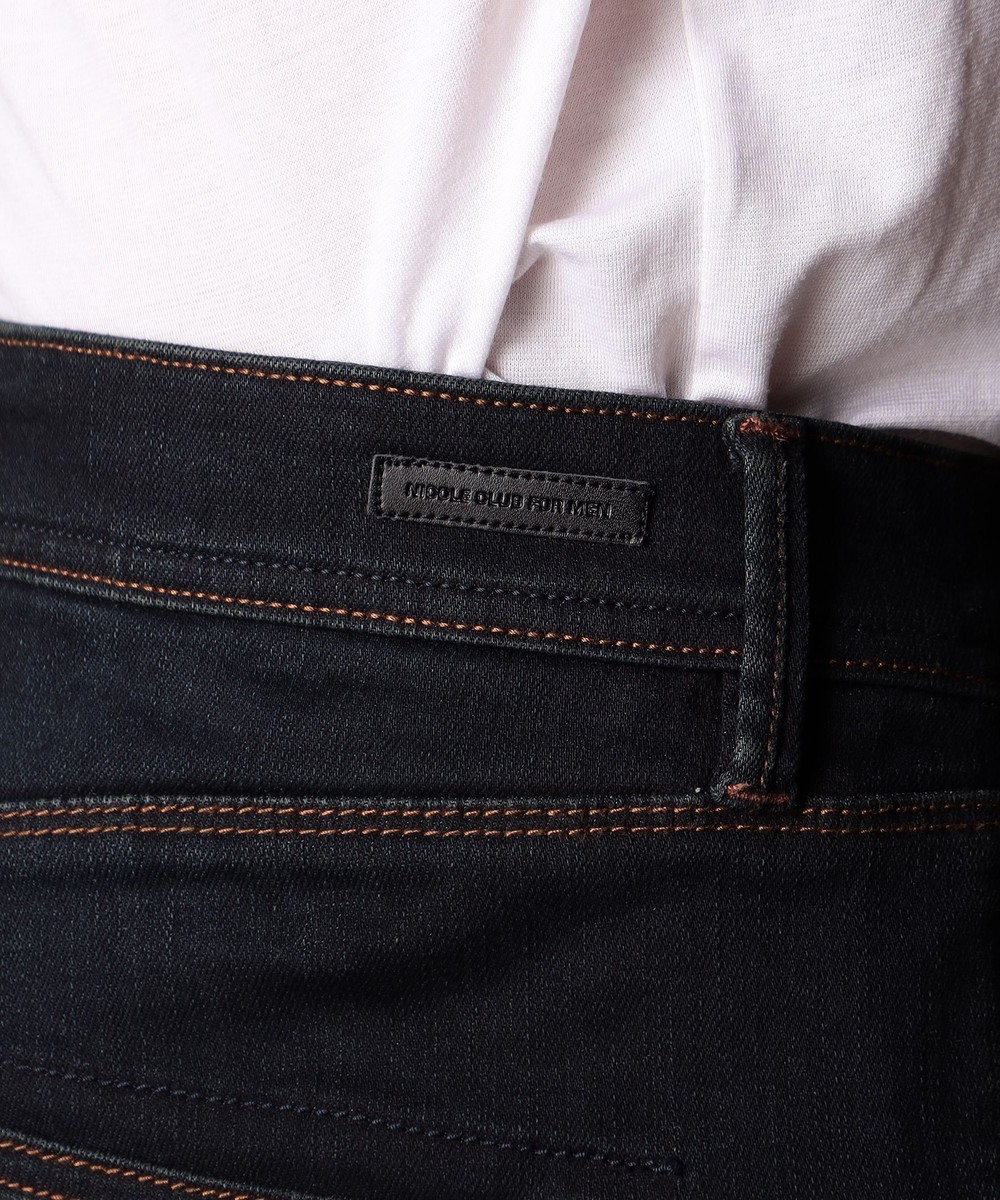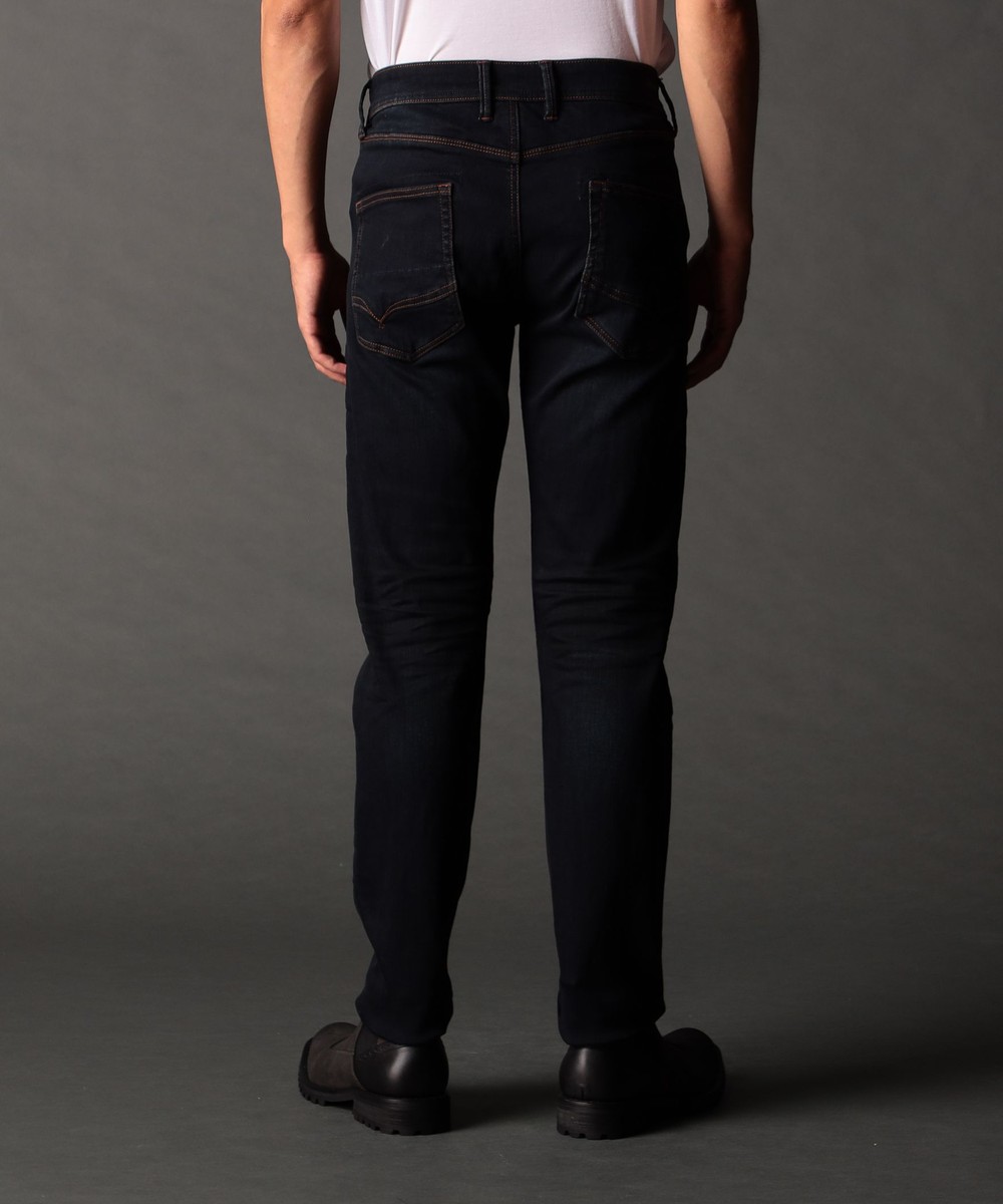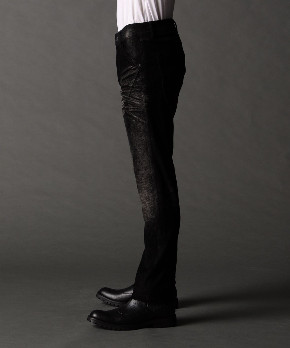 91その他2は、インディゴデニムをベースにワンウォッシュ程度の洗い加工をしてから、3Dシワ加工と顔料吹き付け加工を施しています。リジットデニムの様な濃色で綺麗めなスタイルでも合わせられるイメージに仕上げています。