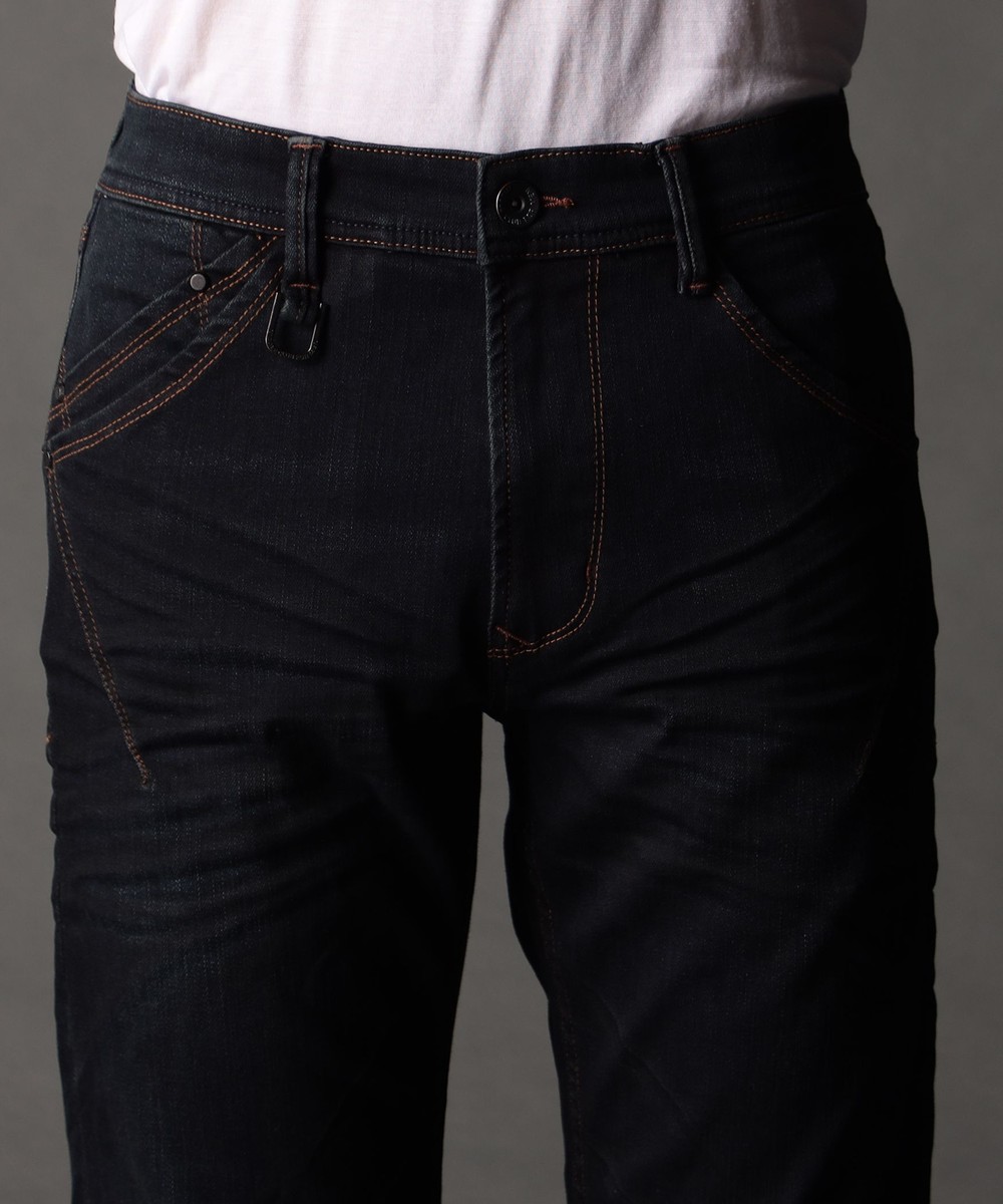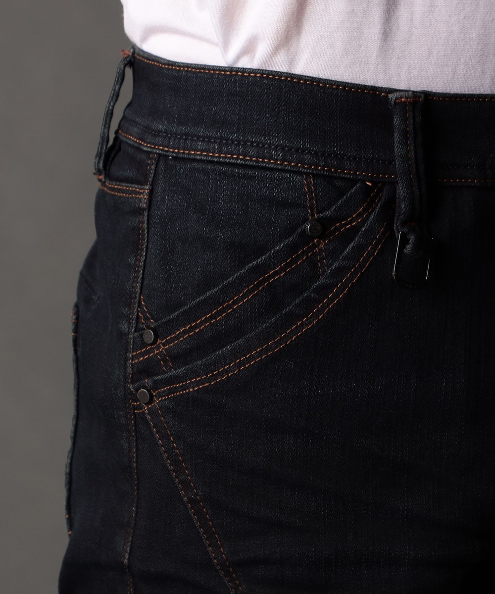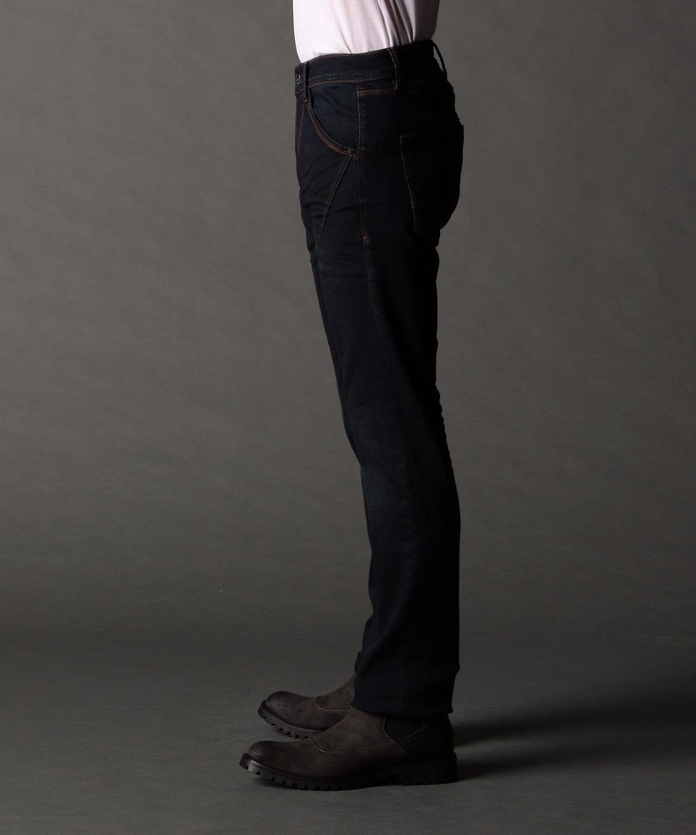 アクセントに前ポケット脇から膝に向けてダーツを入れたデザイン5ポケットパンツ。素材のストレッチ性にあわせてウエストベルトも伸びる様に縫製、別布もストレッチ裏地を使用していますので穿き着心地も抜群です。革ネームやオリジナルのボタン、Dカンを使用、腰裏の刺繍や後パッチポケットのオリジナル切り替えデザインを特徴にしています。
