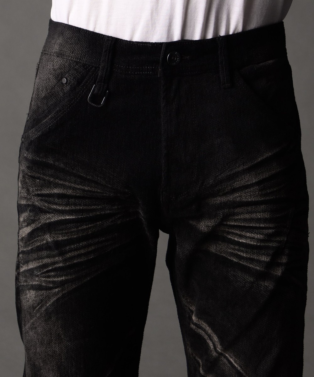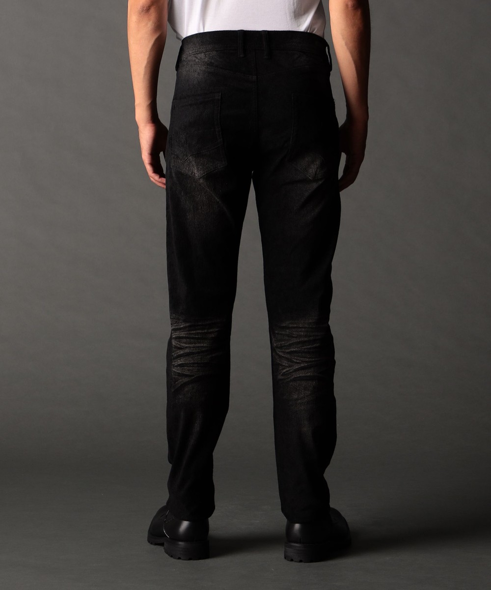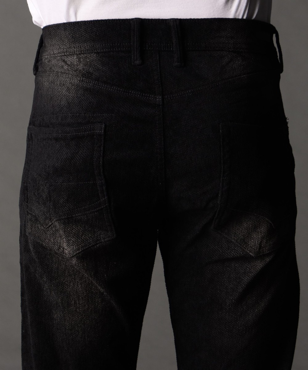 92その他3は、黒の硫化染めしたコーデュロイ素材でブラストと削りを少し強めに入れて当たり感を出し、3Dシワ加工と顔料吹き付け加工を施しています。(詳細画像12~18)