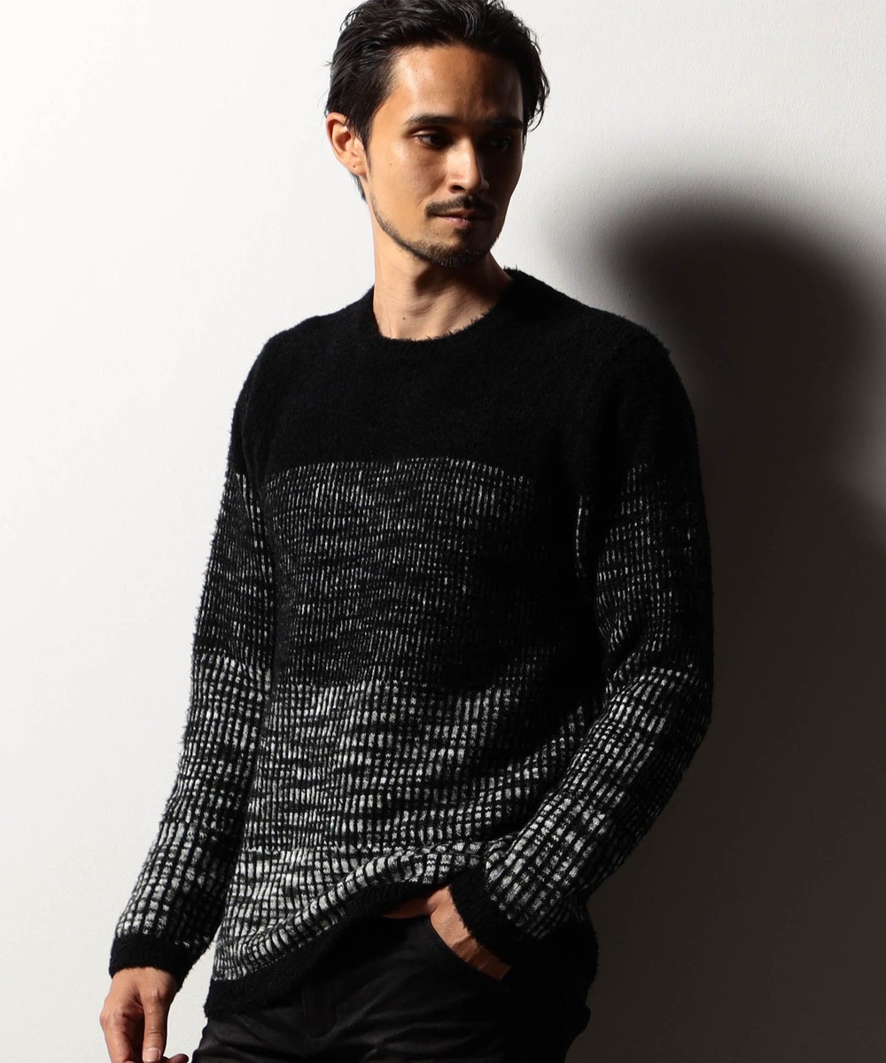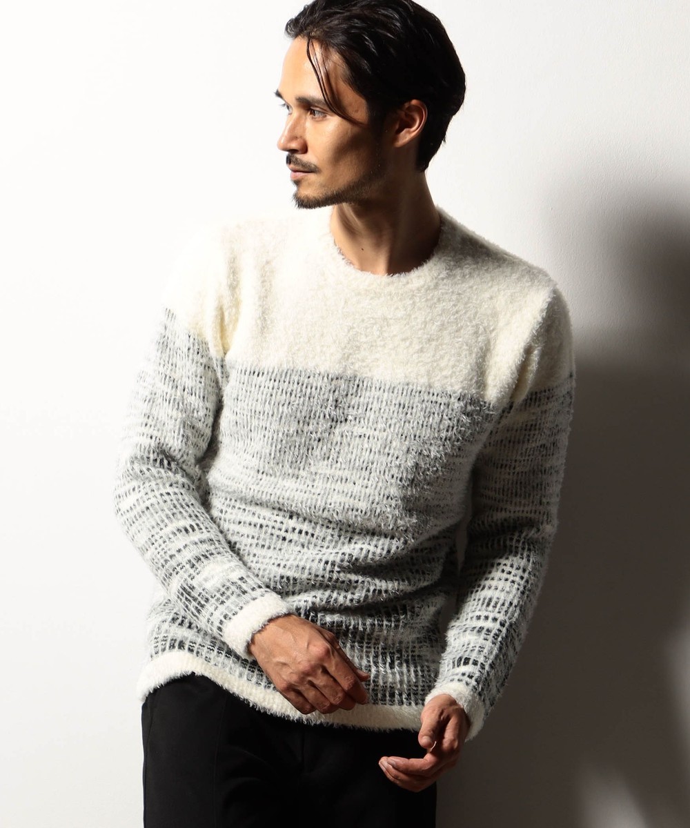 ピッチアレンジを加えたグラデーション調ストライプ柄が目を惹くクルーネックプルオーバーニット。身頃と袖は柄合わせをして存在感のある一枚に仕上げました。柔らかな触り心地で着心地に優れ、滑らかな毛並みと光沢、段染め糸のムラ感が大人ラグジュアリーな雰囲気を演出してくれます。脇下には消臭抗菌テープを入れて機能性もプラスしたこだわりの仕上がりです。
