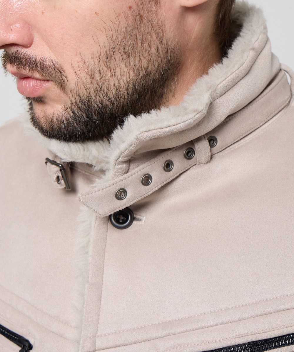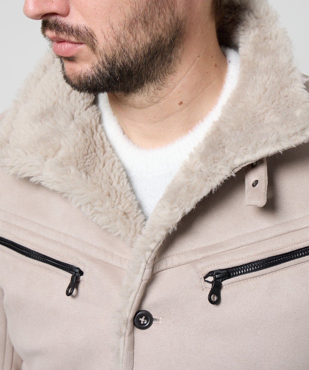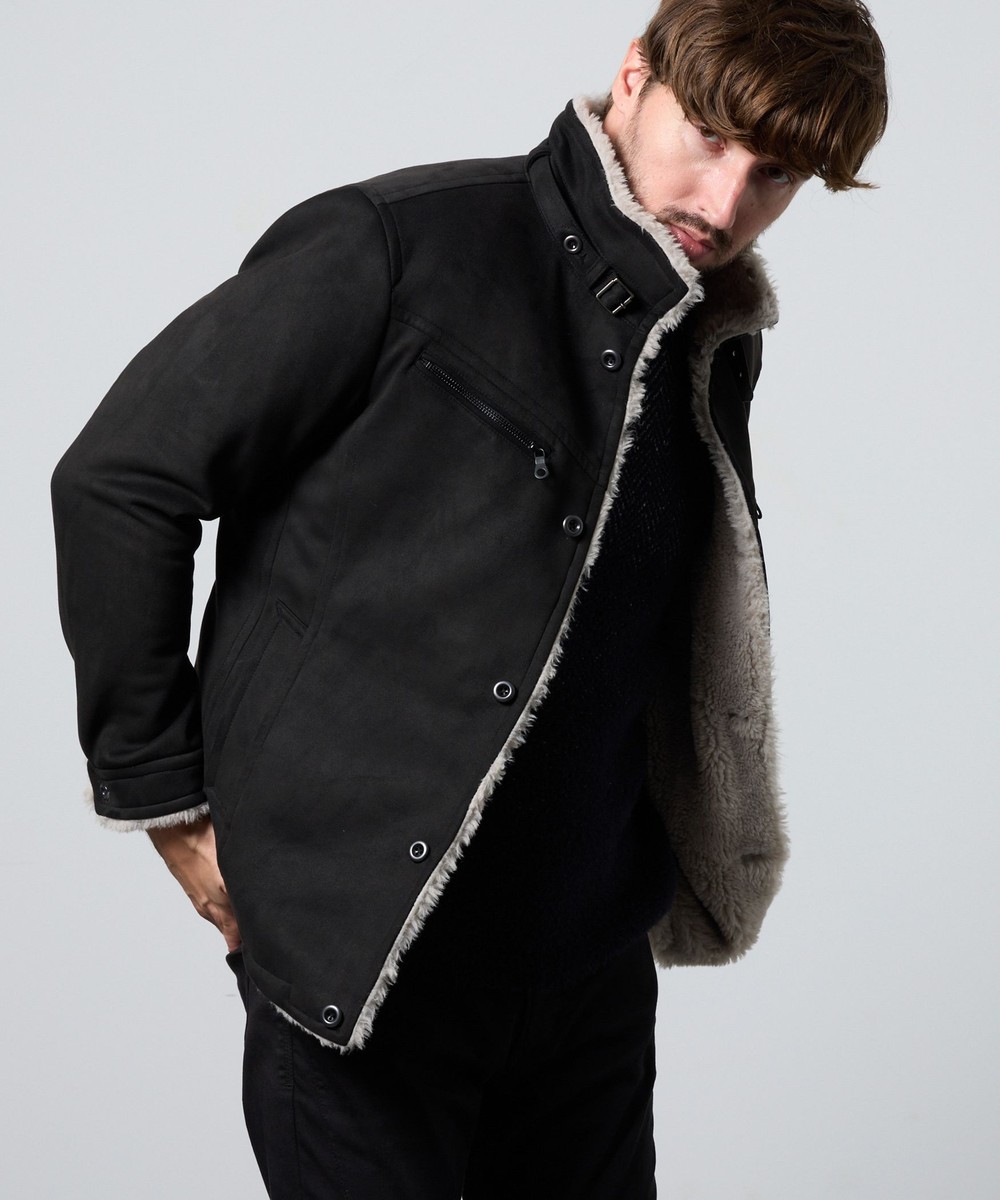 スウェードポンチ素材を表地を使用し、身頃裏全面にファーを配したデザインブルゾン。