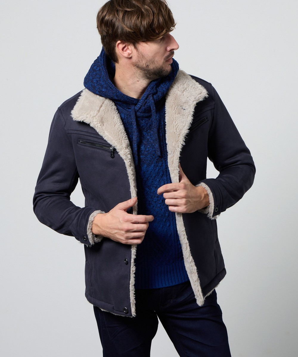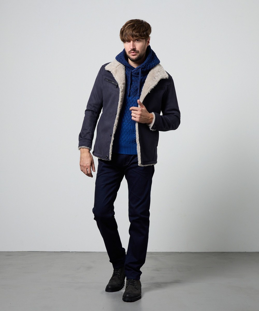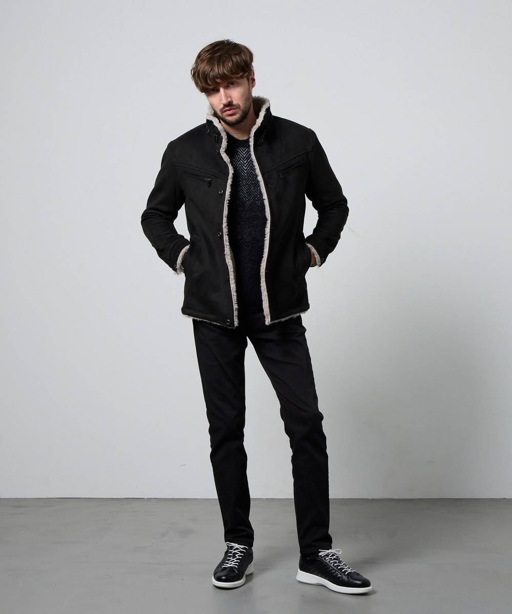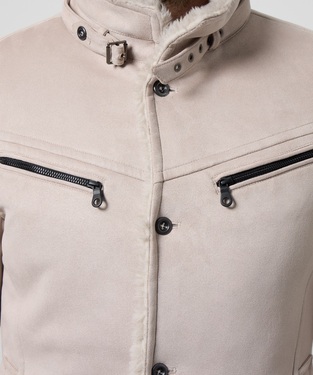 スウェードポンチ素材を表地を使用し、身頃裏全面にファーを配したデザインブルゾン。