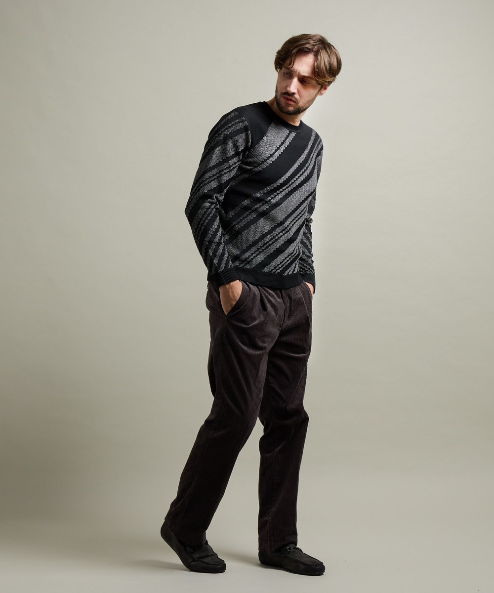 インパクトのあるバイヤス柄が目を惹く、リンクスジャカードクルーネックニットになります。
