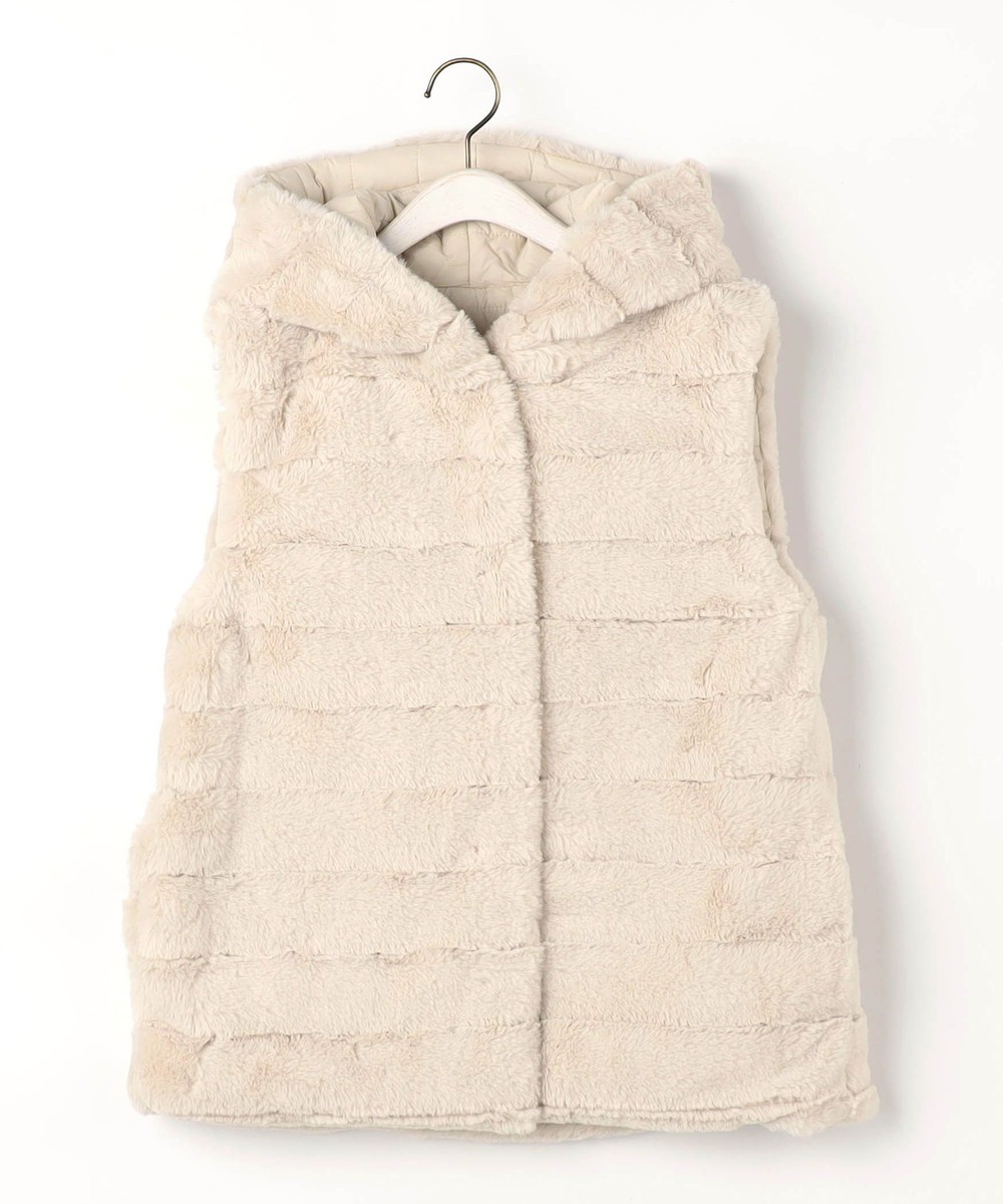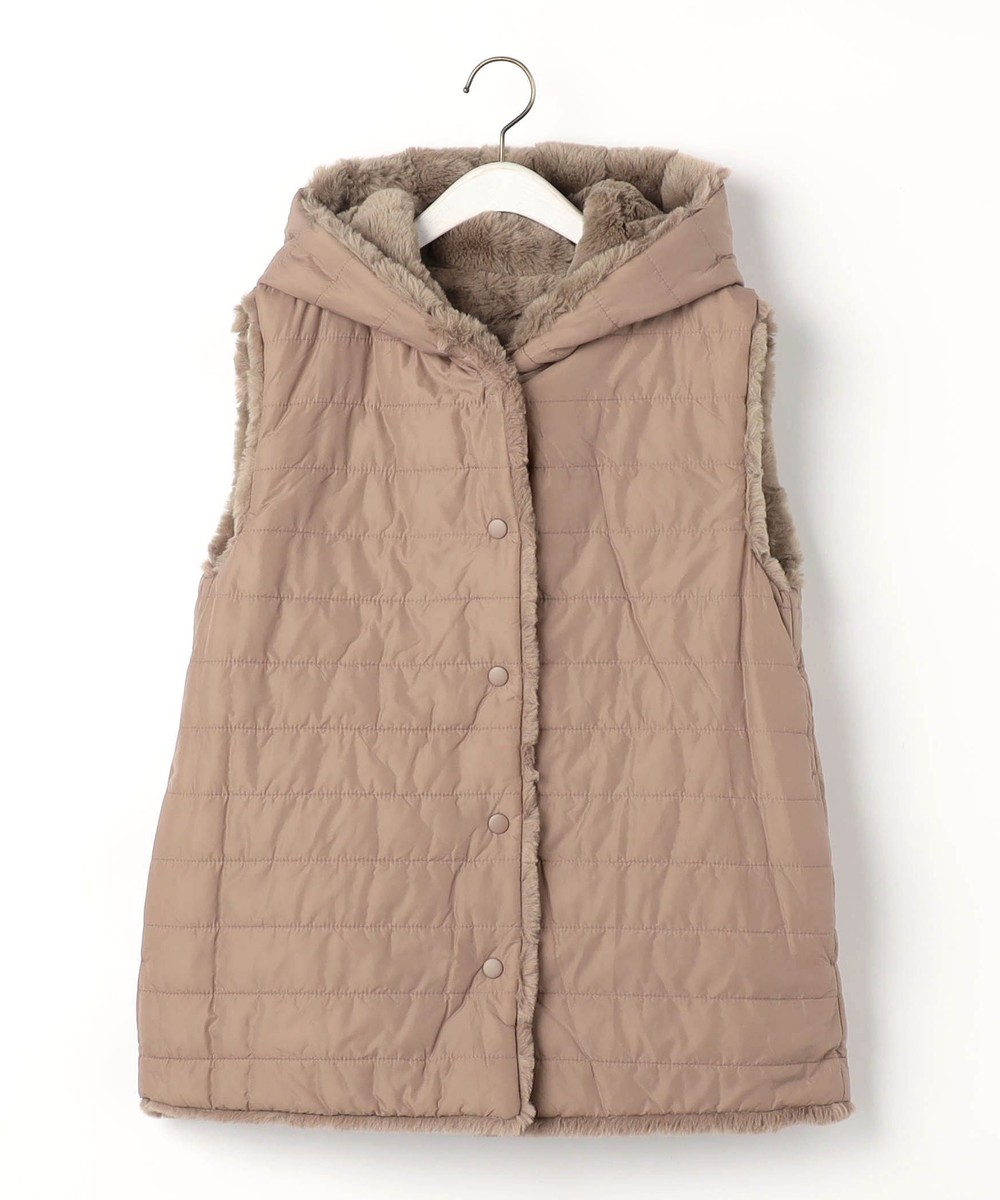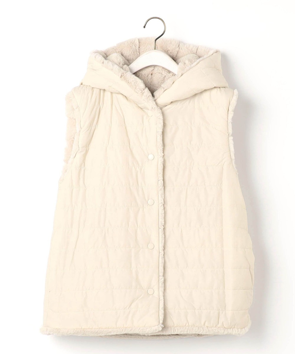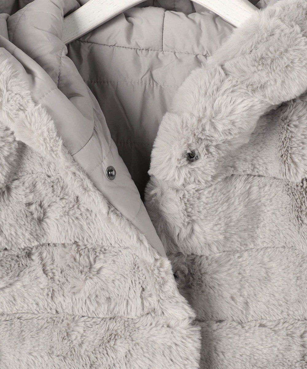 触りごごち抜群のフェイクファーと、タフタ素材のリバーシブル仕様。フード付きで可愛らしい印象に。
