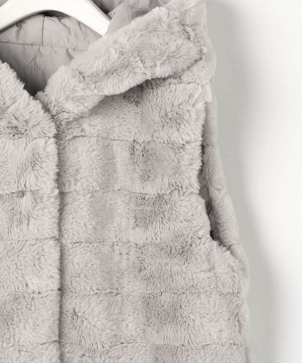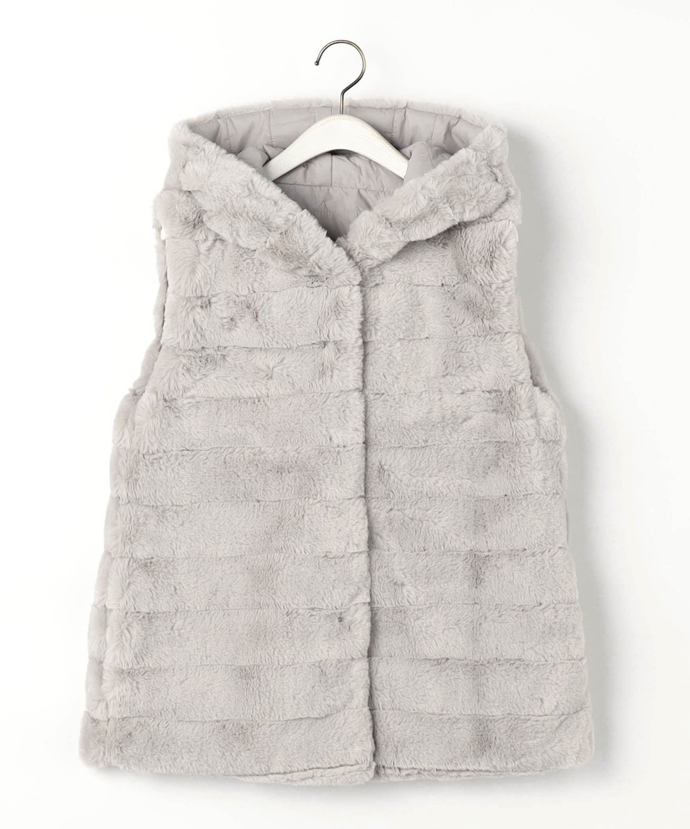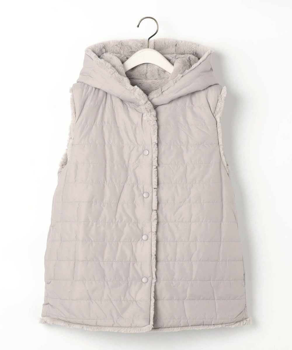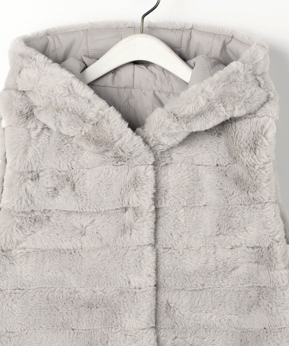 触りごごち抜群のフェイクファーと、タフタ素材のリバーシブル仕様。フード付きで可愛らしい印象に。