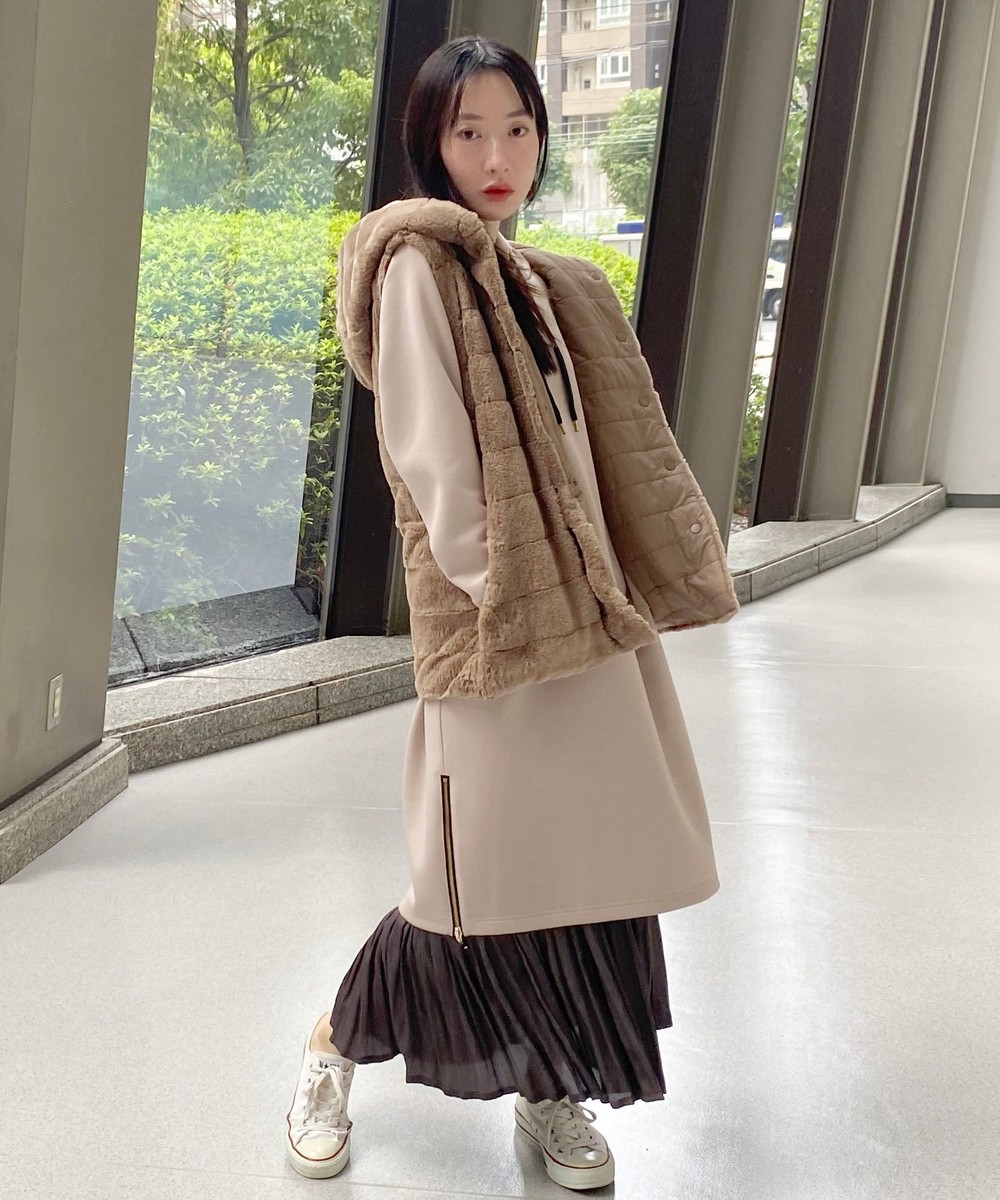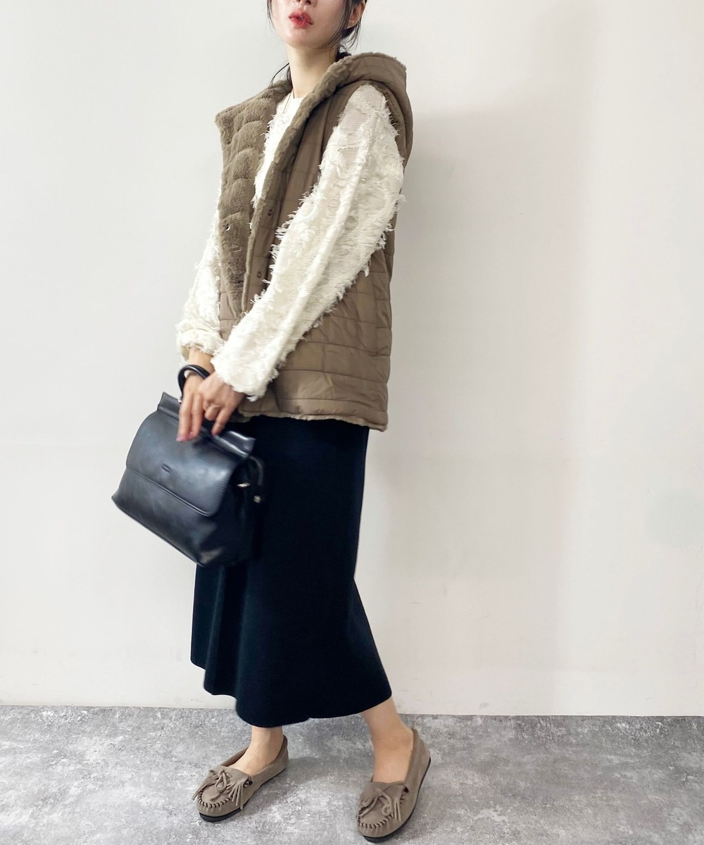スカートからパンツまで幅広くバランスを取りやすい丈感は、シンプルなワンピースやシアーTEEなどにファーベストを羽織るだけで、今年らしい秋スタイルに。