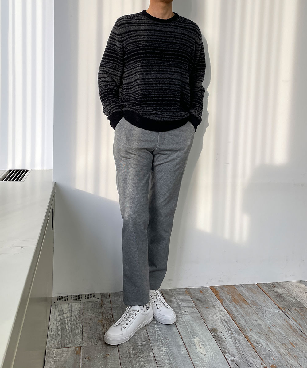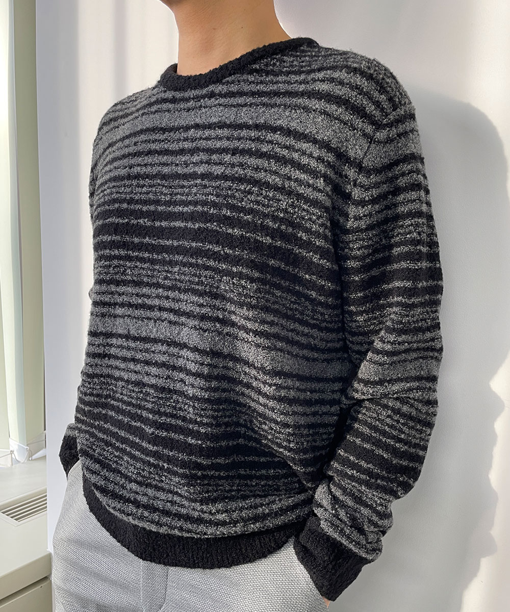 フェードボーダーのクルーネックニット。緩いグラデーションが都会的なモード感を演出。