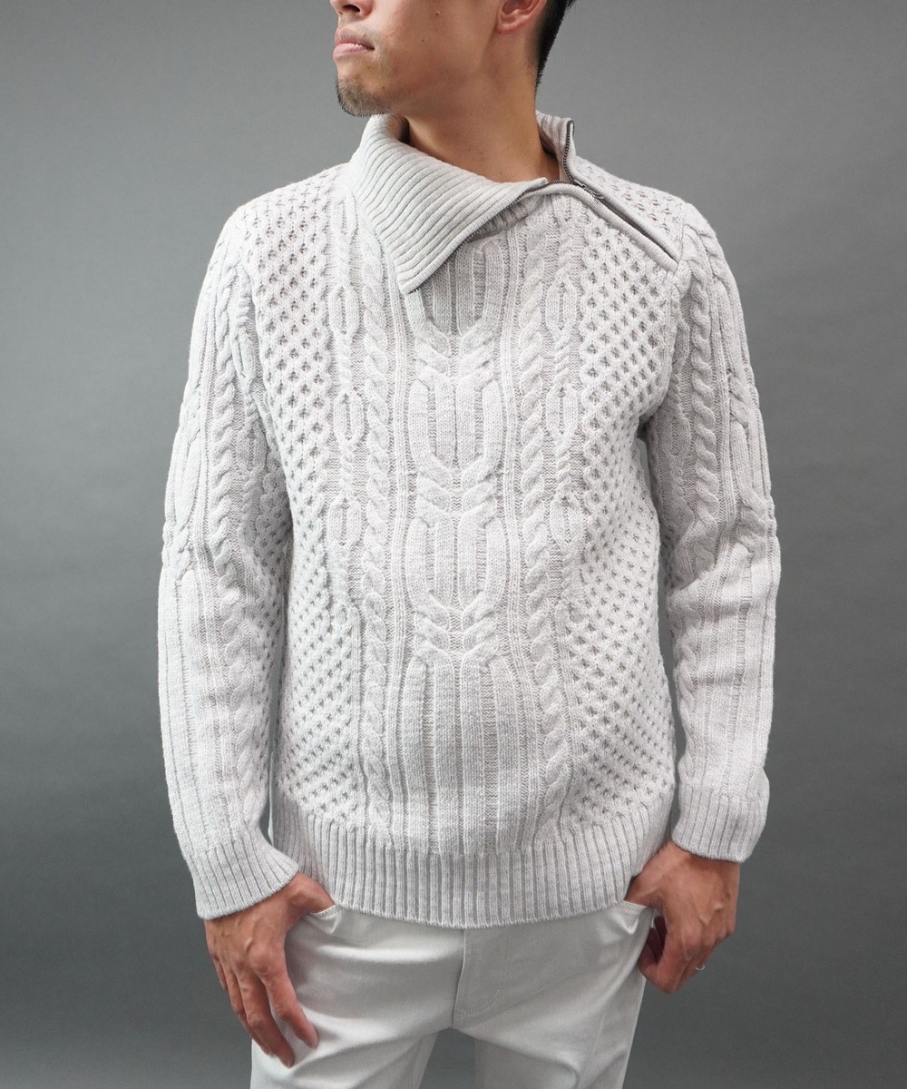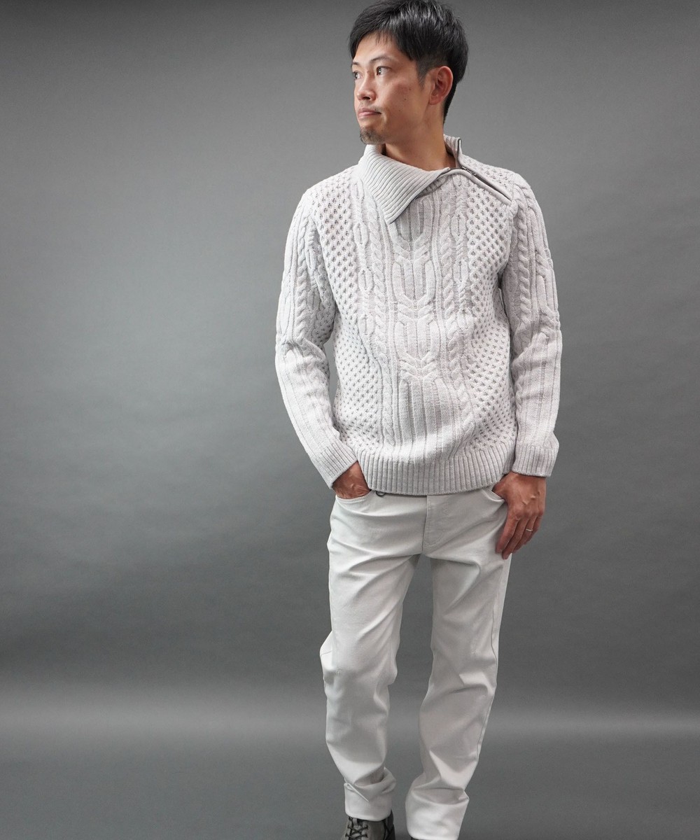 肩先から衿にかけてのファスナ-使いがデザインポイントのプルオーバーニットになります。