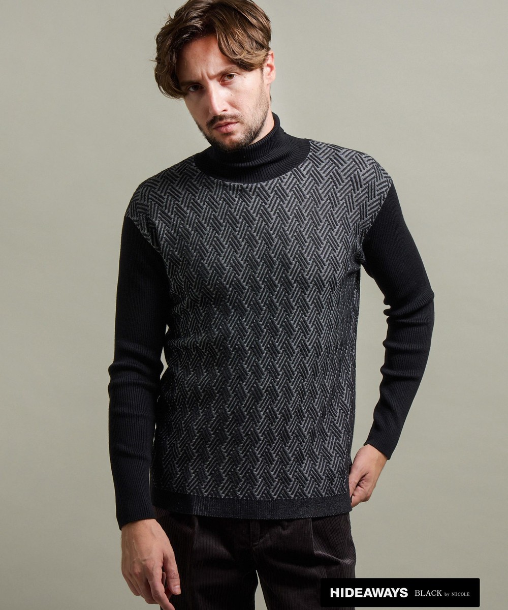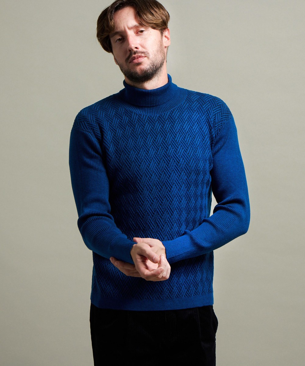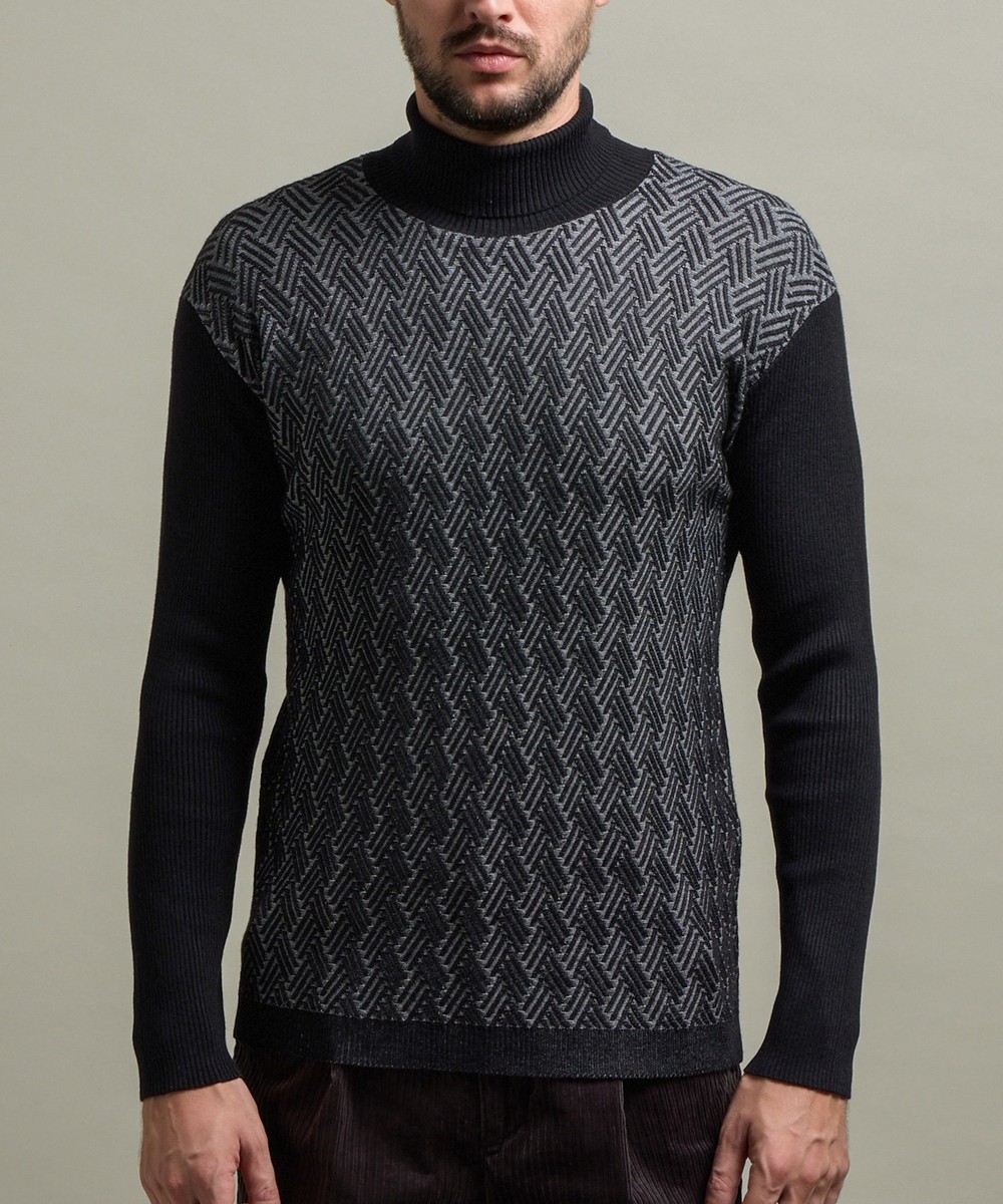 バスケット柄をジャカード編みで表現したタートルネックニットになります。