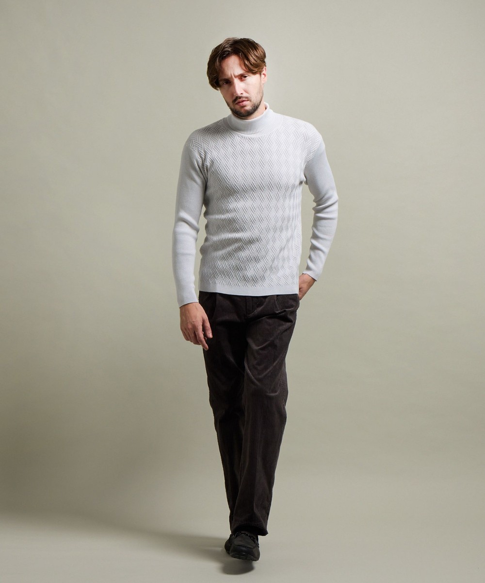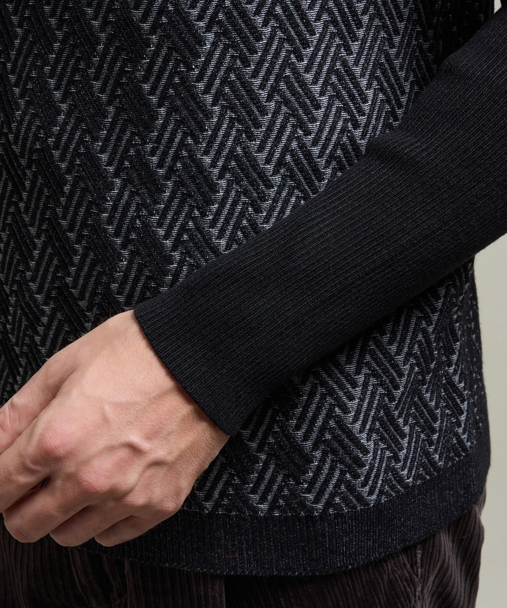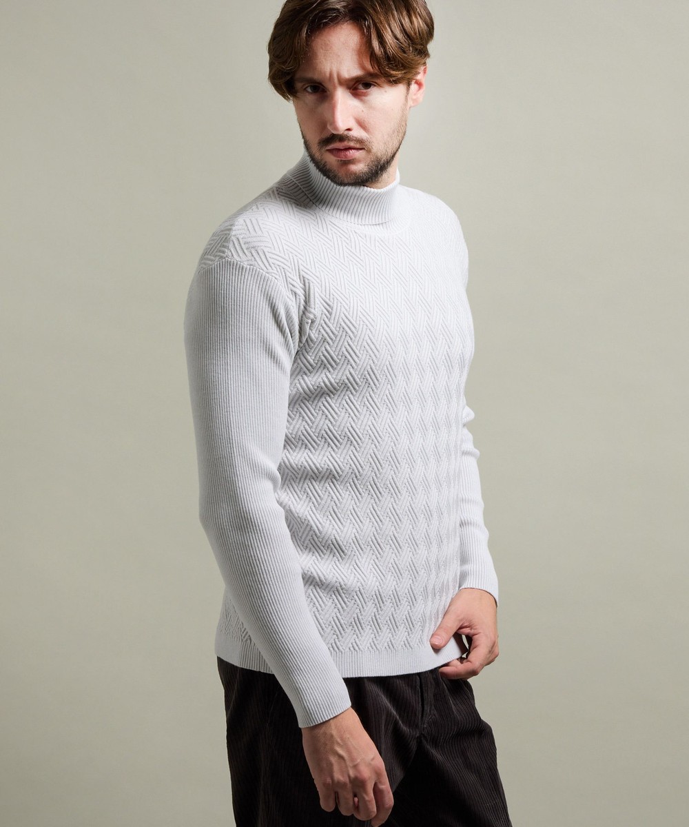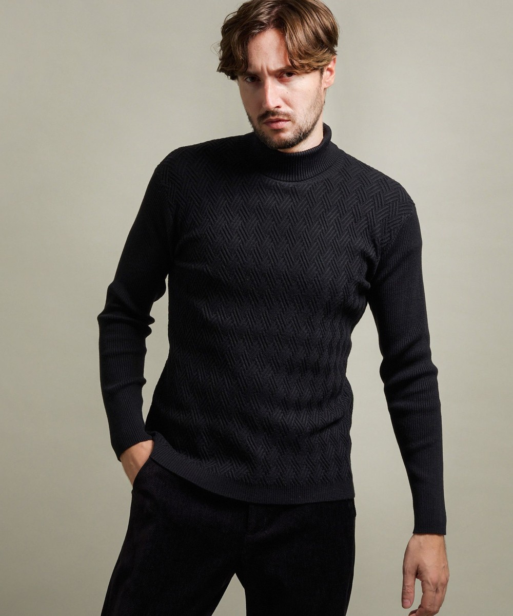 バスケット柄をジャカード編みで表現したタートルネックニットになります。