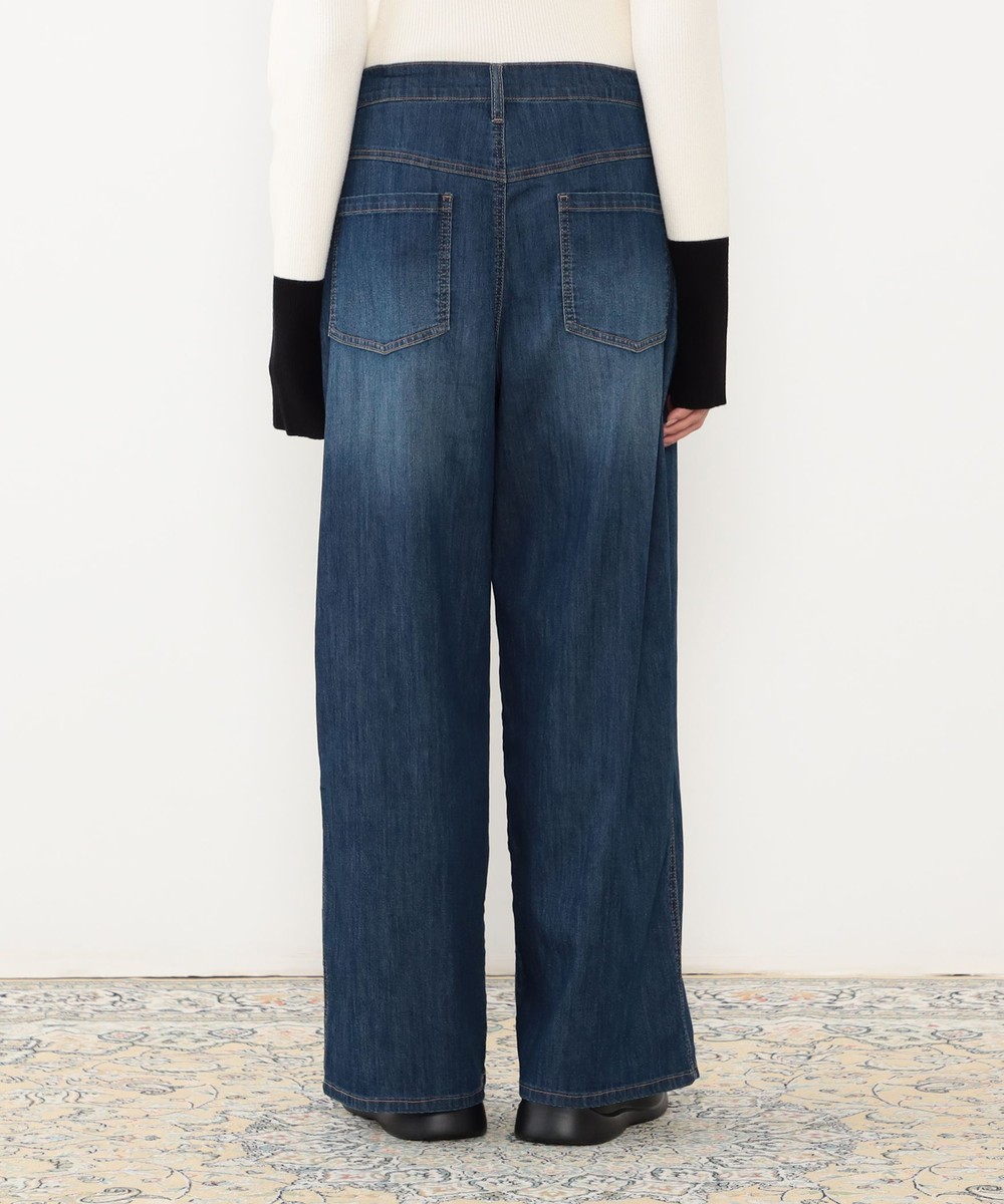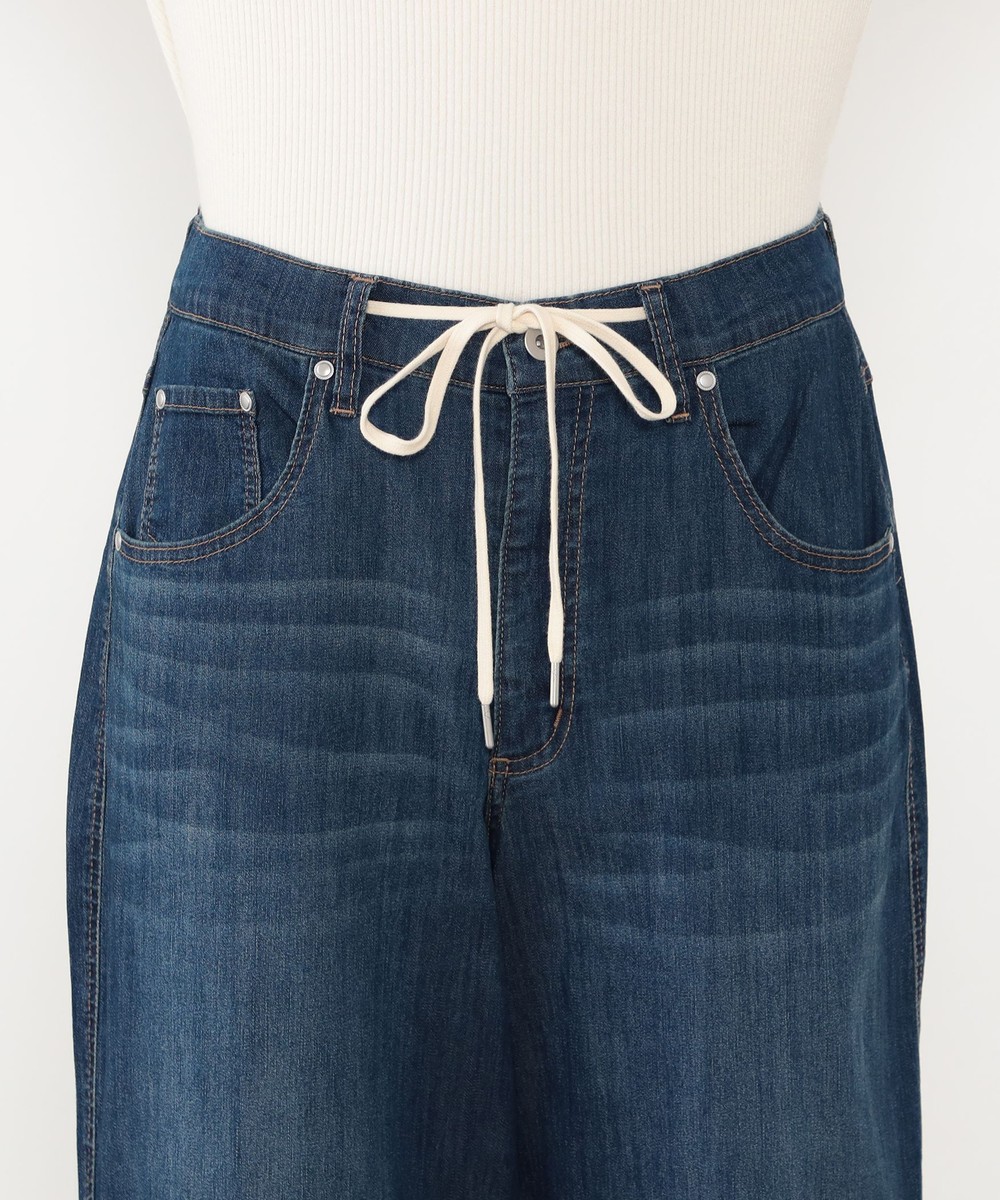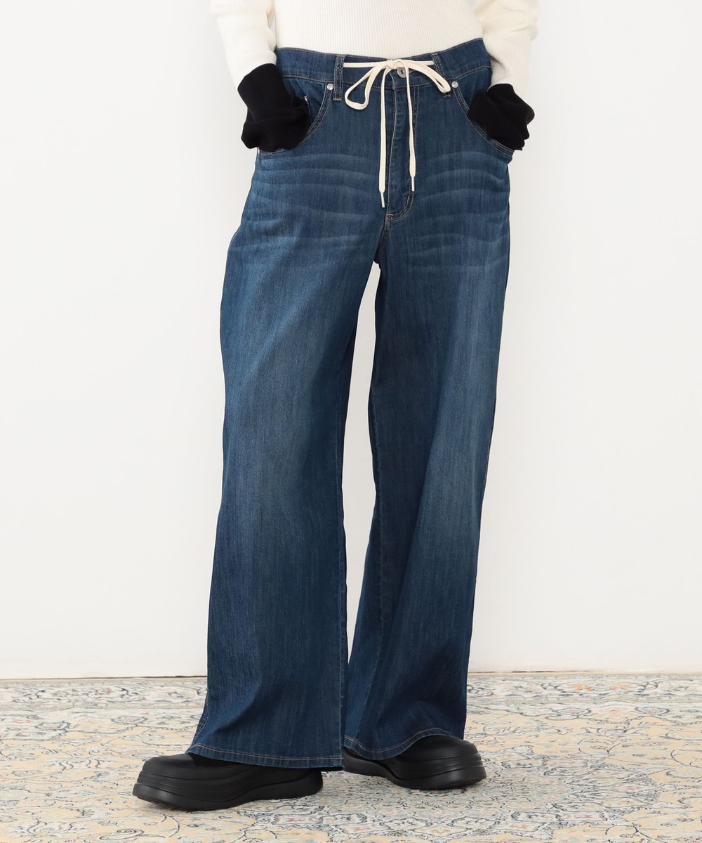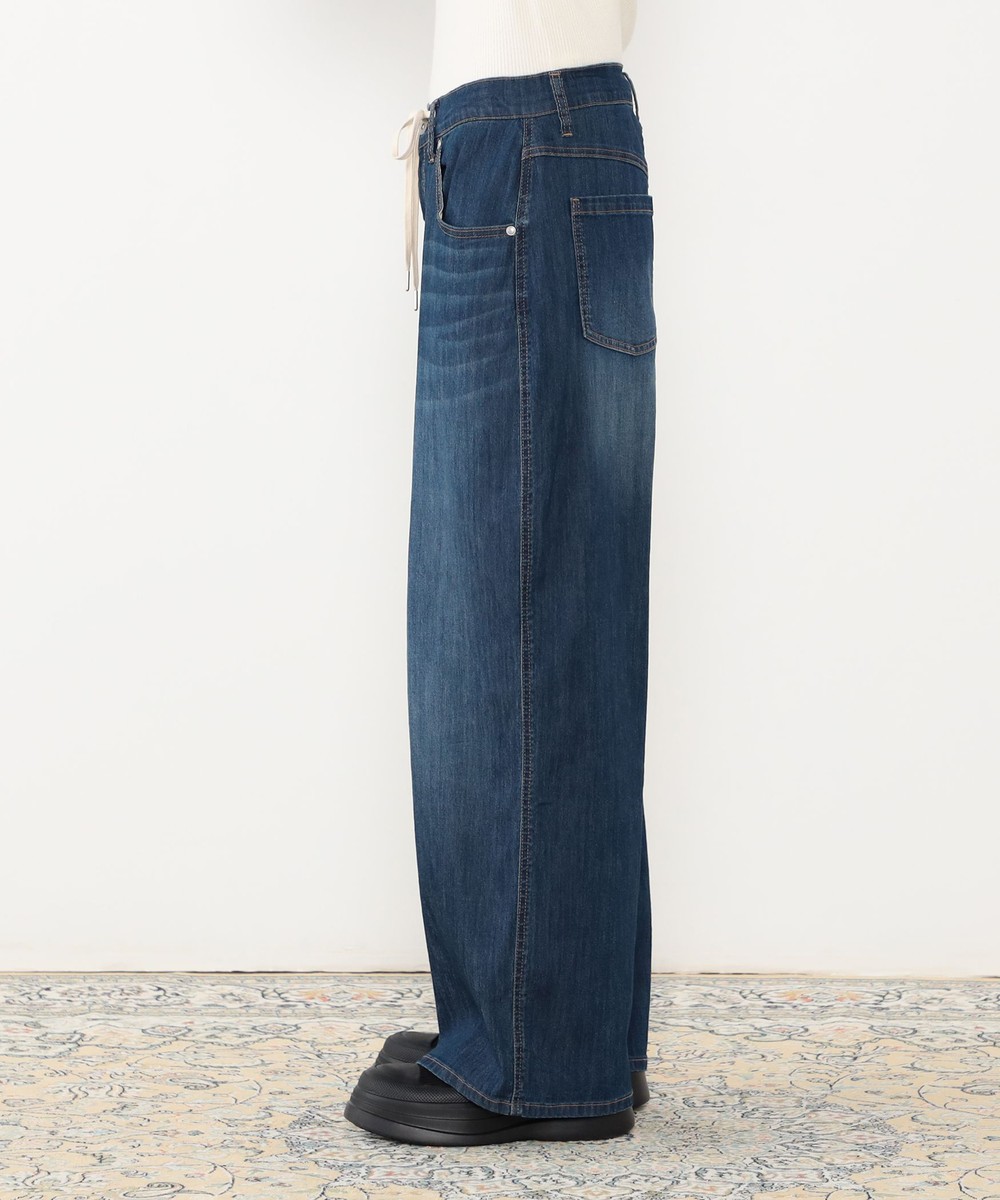 ◆デザインはウエストドロスト使いのワイドデニムパンツ。ゴム仕様ではなくひもで結ぶデザインになっており、ひもを隠す結び方も可能です。パンツ前面のひげがポイントでヴィンテージ感を漂わせます。