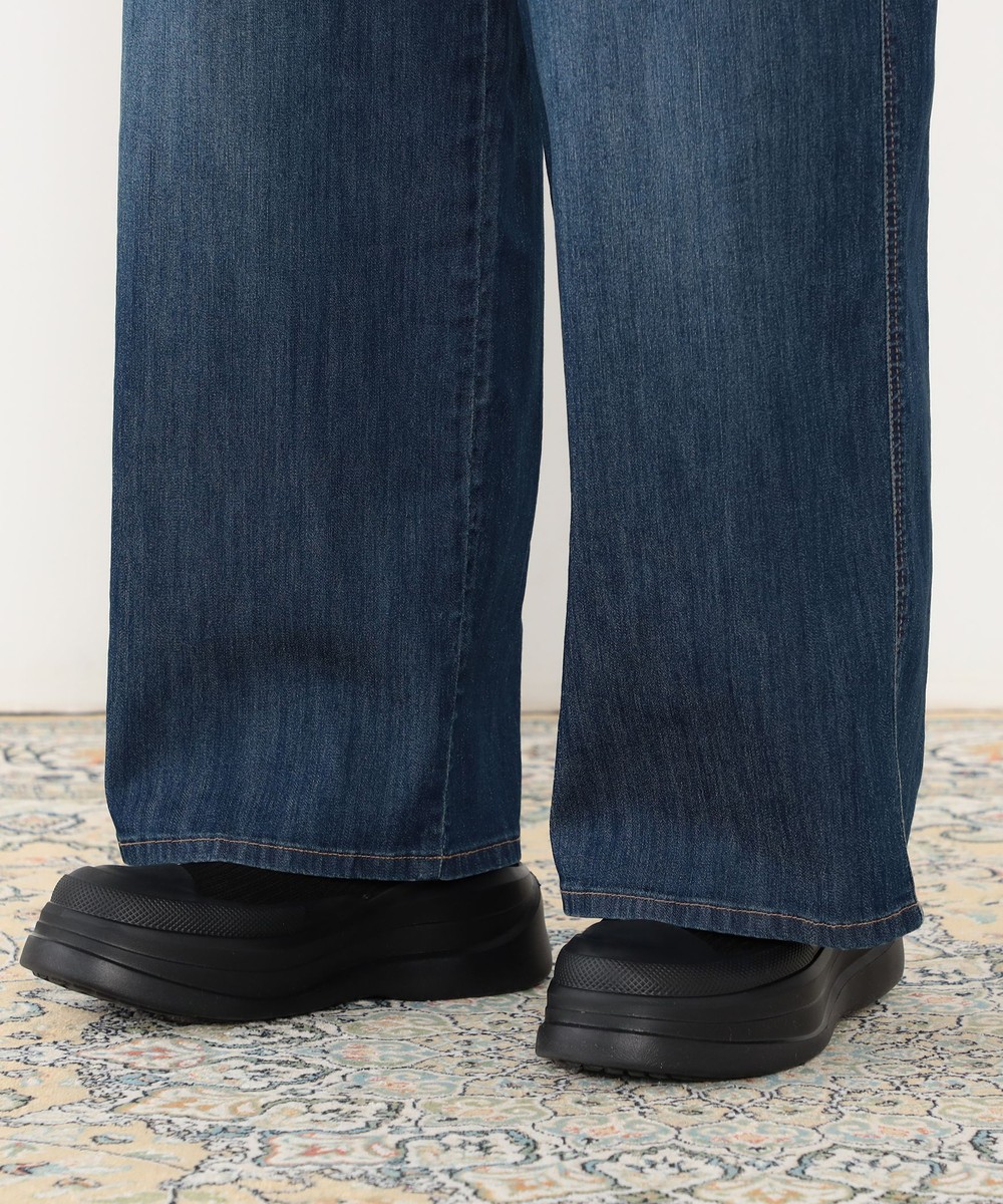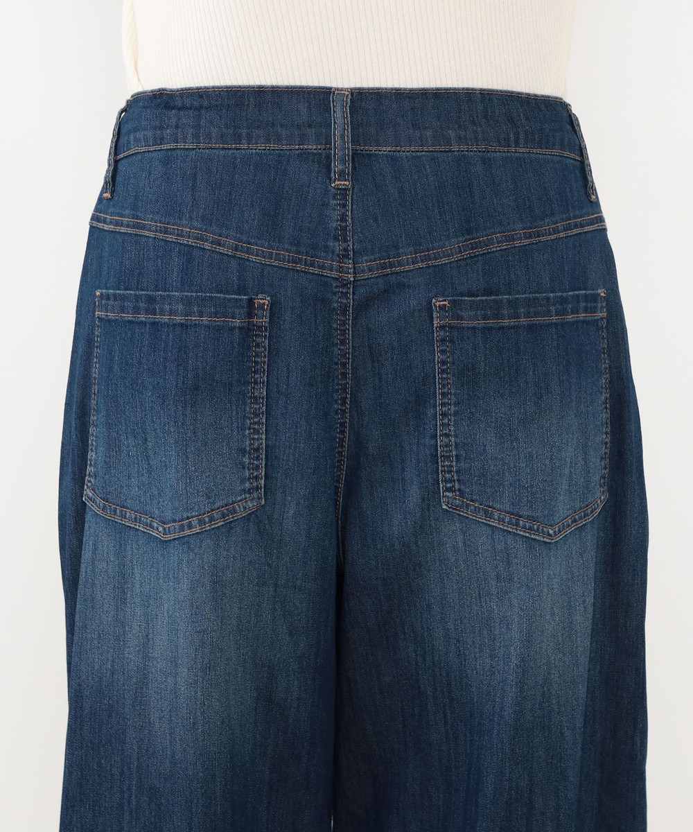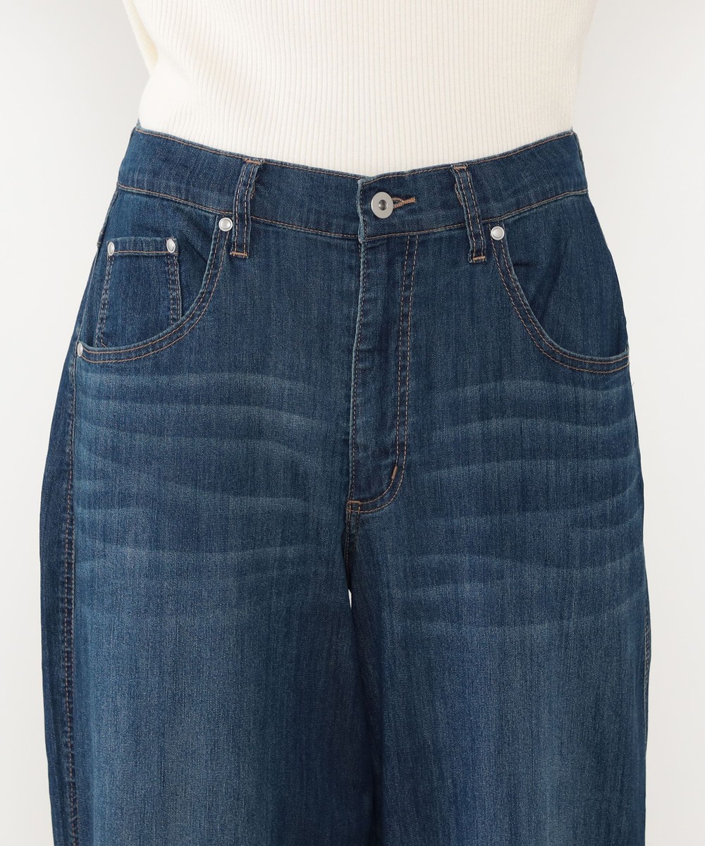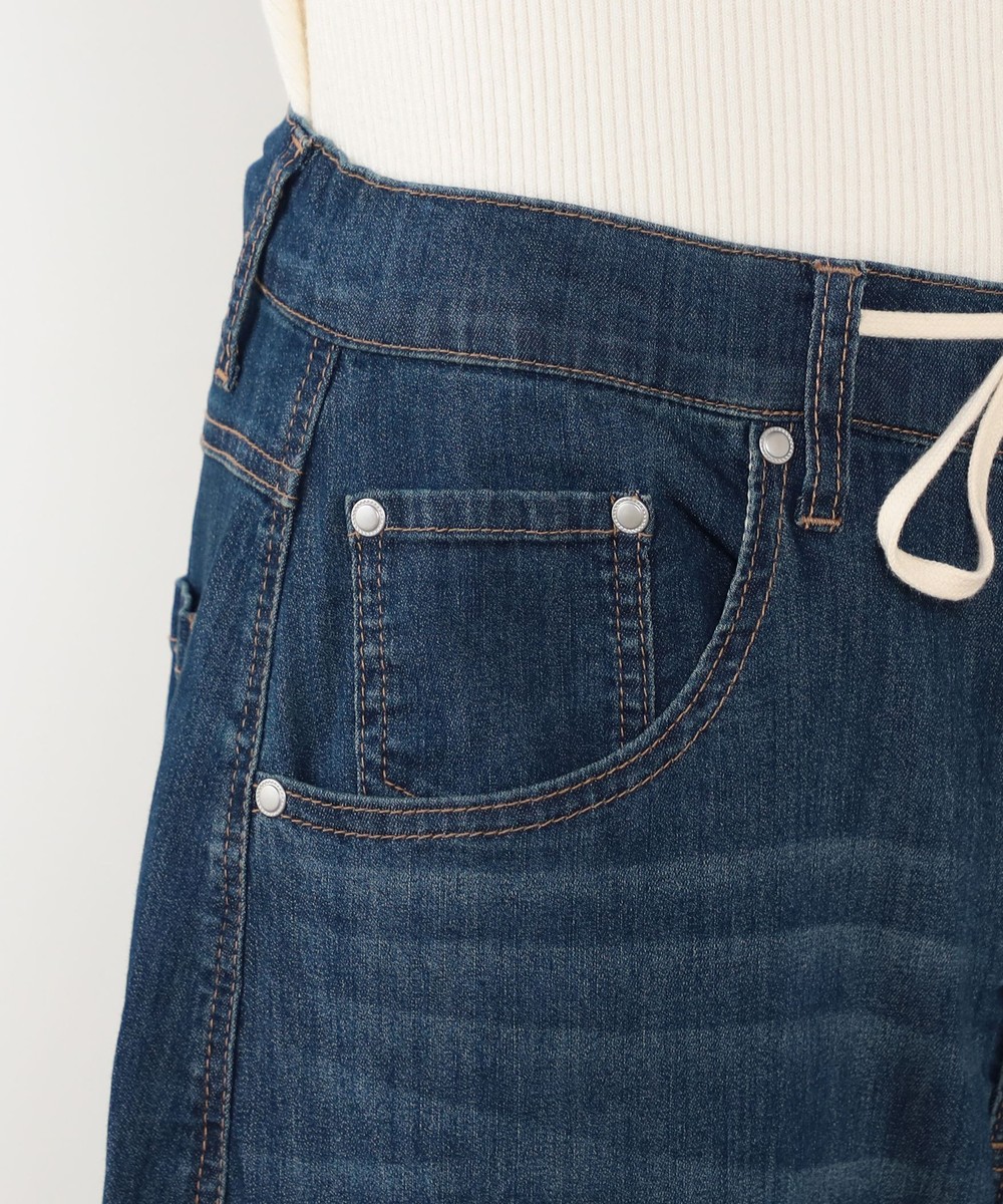 ◆デザインはウエストドロスト使いのワイドデニムパンツ。ゴム仕様ではなくひもで結ぶデザインになっており、ひもを隠す結び方も可能です。パンツ前面のひげがポイントでヴィンテージ感を漂わせます。