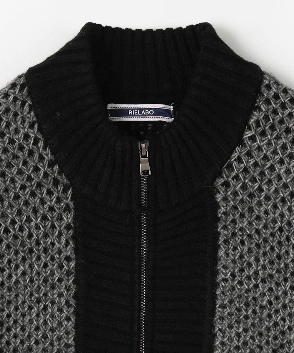 身頃を凹凸感のあるタックステッチで編み立てたドライバーズニット。杢調の色の出方と程よい毛足の長さでシーズン感たっぷりな1着です。フロントの箔転写ファスナーをアクセントポイントに、ラグジュアリーかつモードな印象に仕上げました。部分的に編地を切り替え着用感を高めながらシャープなシルエットを演出。脇前の切替部分にはスラッシュポケットを設け、脇下の縫代部分にはデオドラントテープを叩きつけて機能性もプラスしています。