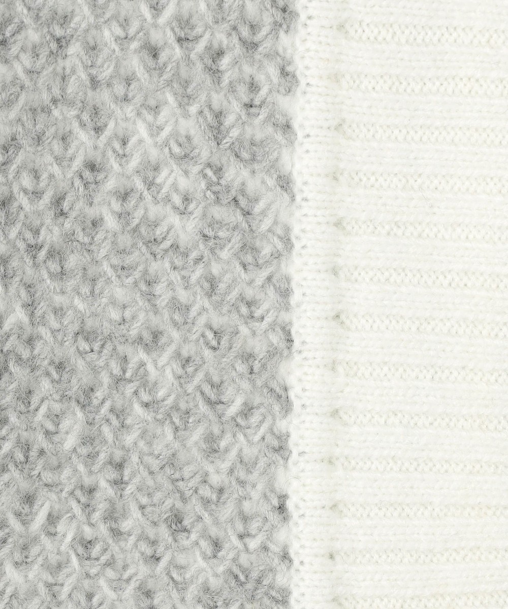 身頃には表に杢調糸、裏に単色糸が出るように引き上げ編みの技法で編み立てたタックステッチ編地。ポコポコとしたふくらみのある編地を程よい毛足の長さがある4者混糸で編み立てることでウォーム感を演出しています。袖は天竺編み、前立てと細腹はリブ編みにすることでメリハリを付けました。ニットならではのストレッチ性は保ちつつ、しっかりめに目付を持たせて保温性も確保した秋冬にピッタリの素材です。