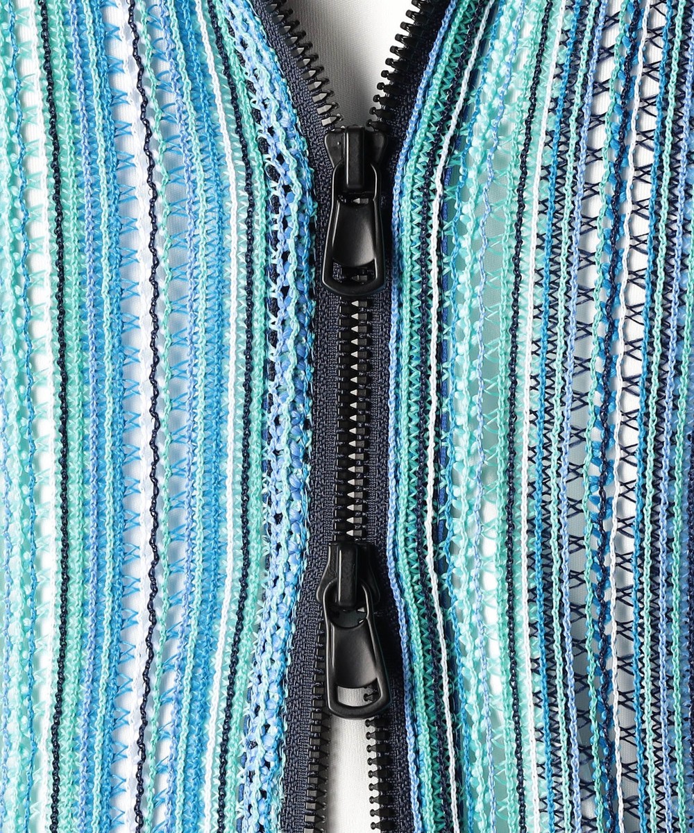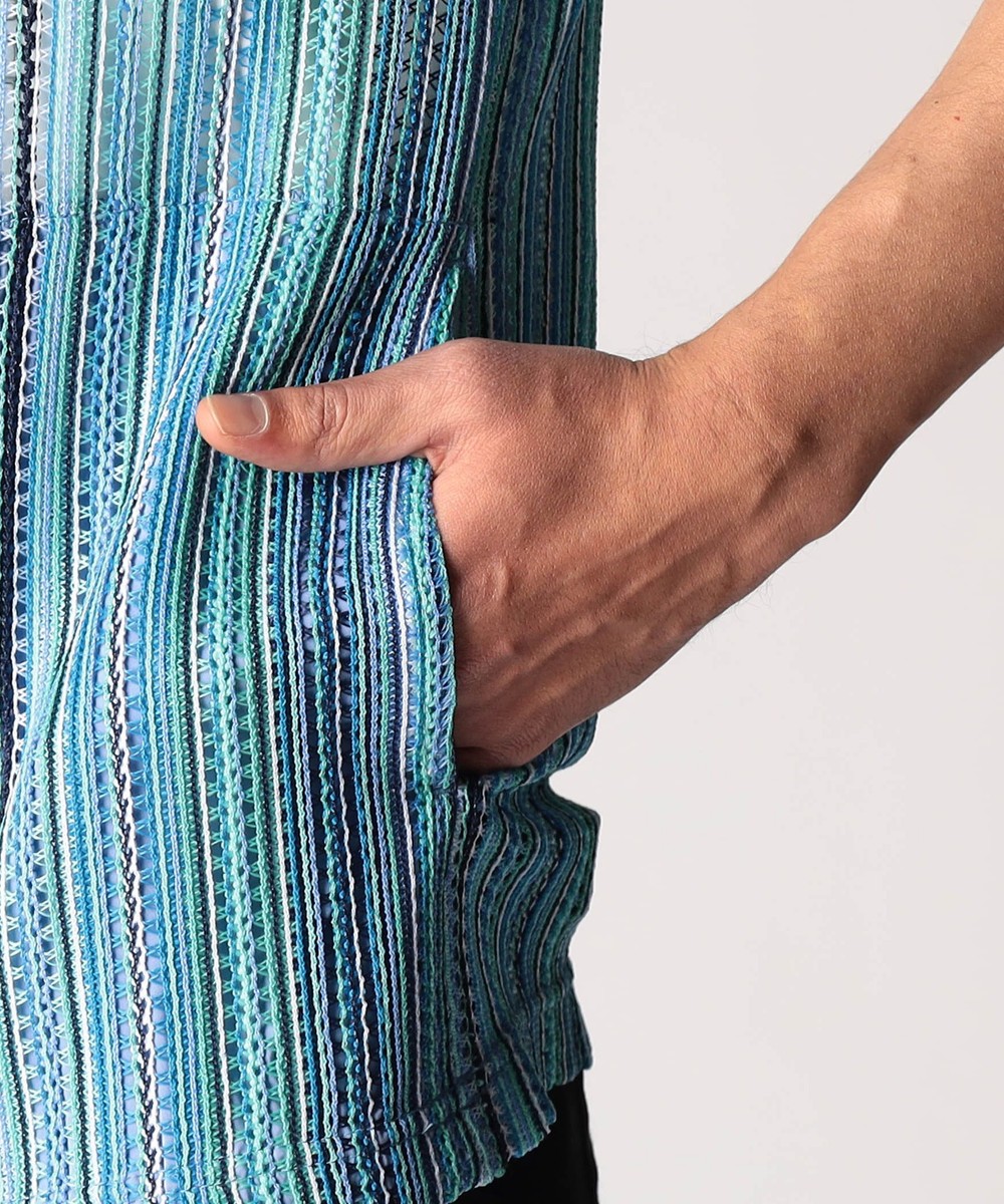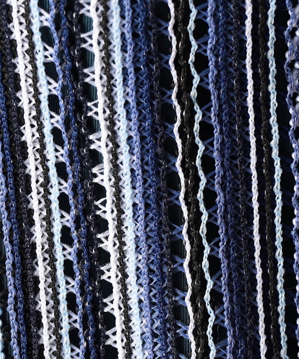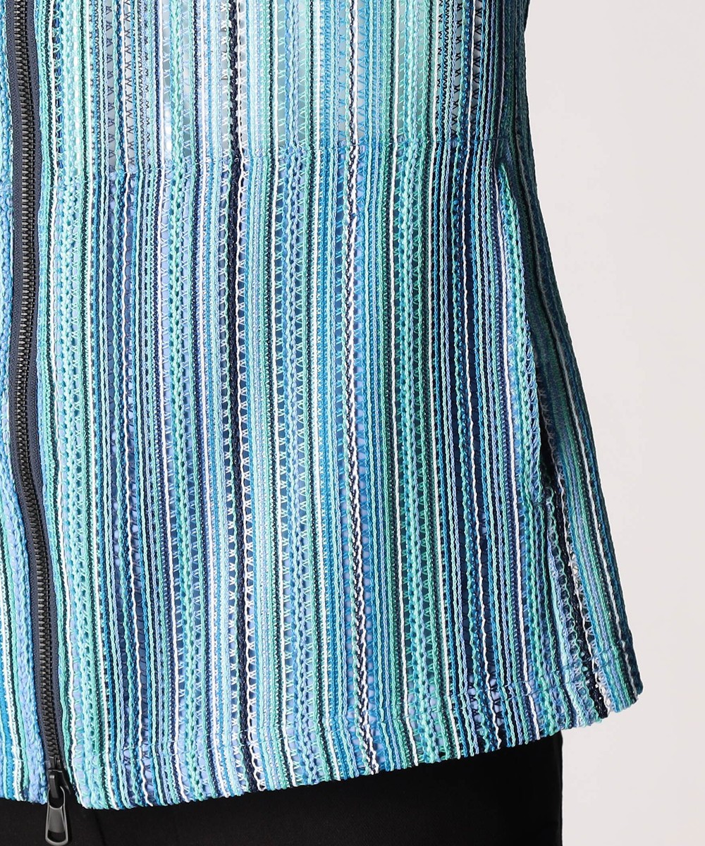 タテ編みに編まれたラッセルレース素材。レースの編み目の透け感は見た目にも涼し気な印象のラッセル編みのニットです。ストレッチ性も高く、着心地は抜群です。マルチストライプ(91グレーストライプ、92ブルーストライプ、93ターコイズストライプ)3色での展開です。
