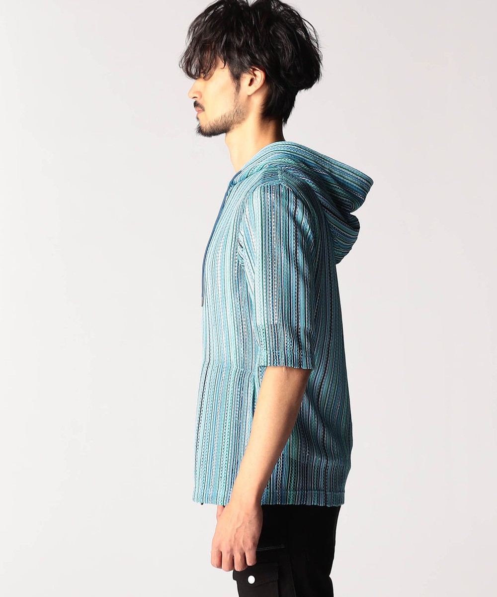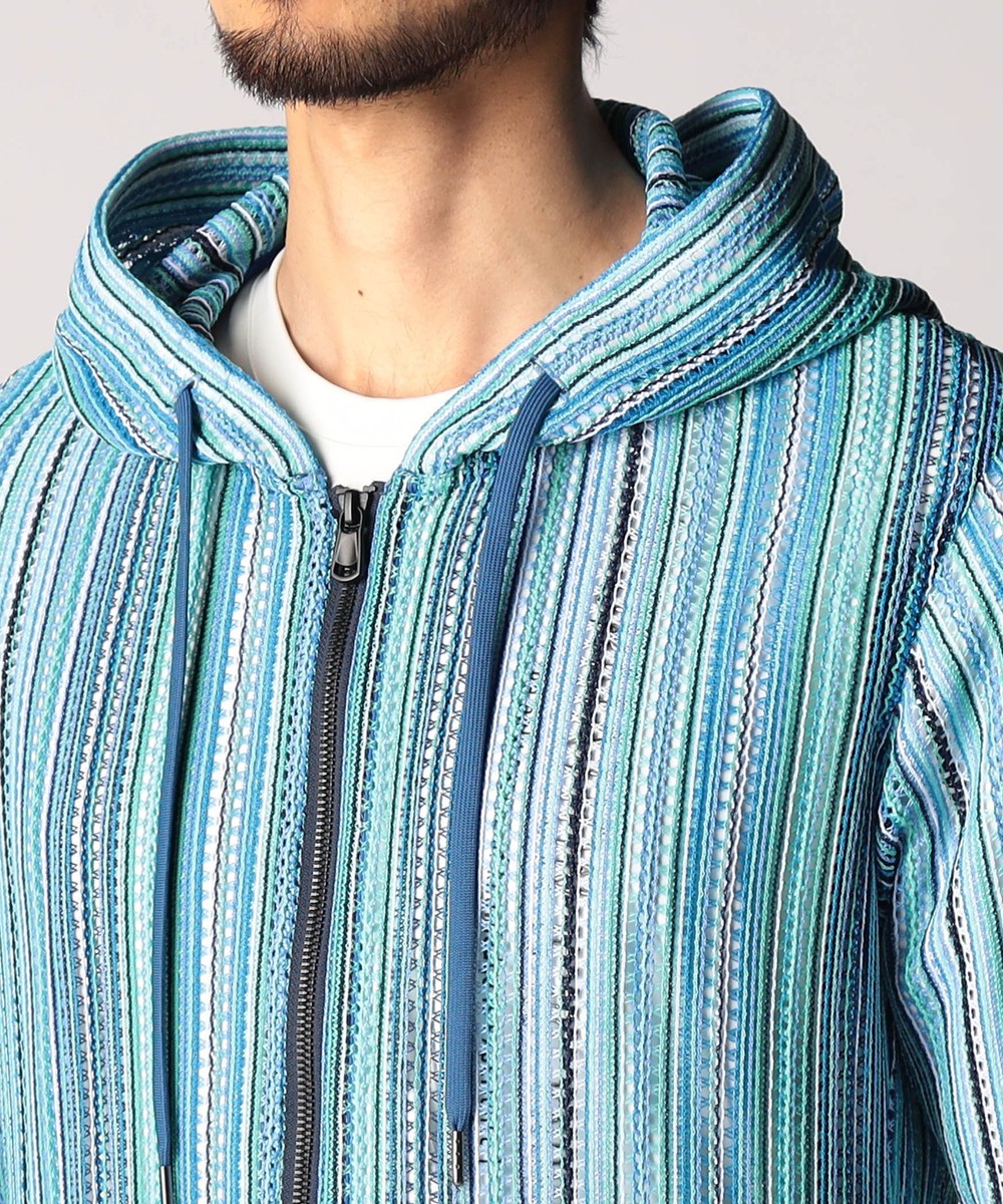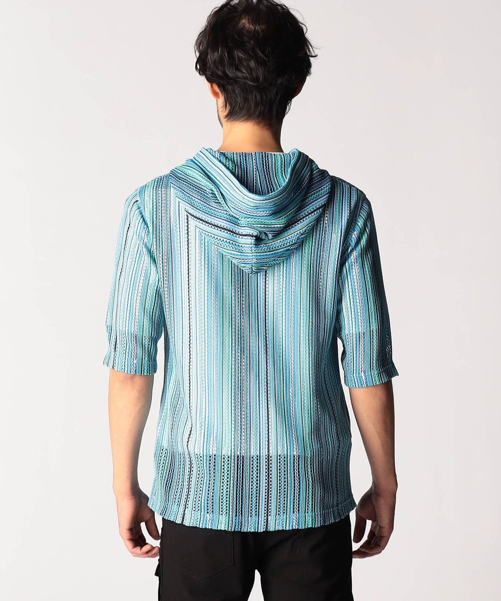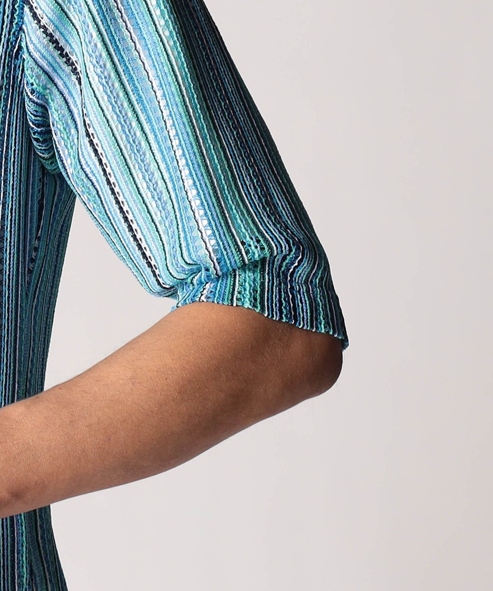 タテ編みに編まれたラッセルレース素材。レースの編み目の透け感は見た目にも涼し気な印象のラッセル編みのニットです。ストレッチ性も高く、着心地は抜群です。マルチストライプ(91グレーストライプ、92ブルーストライプ、93ターコイズストライプ)3色での展開です。