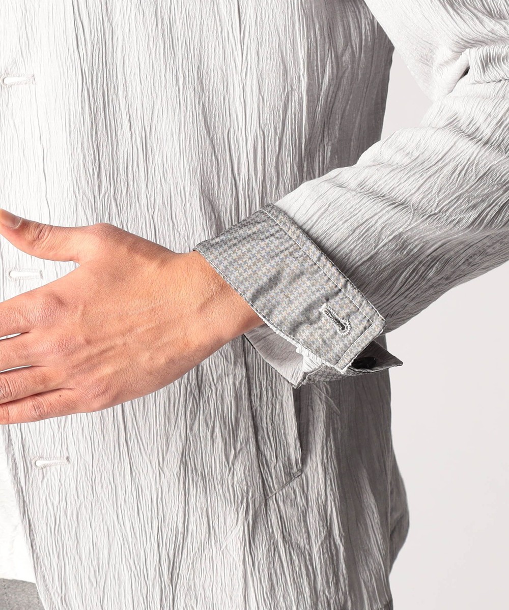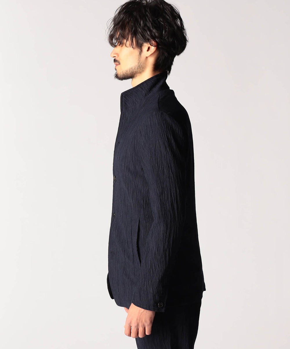 定番スタンドデザインのカヴァーオールジャケット。衿端にワイヤーを入れています。ねかしてラペルにしても収まる設定にしていますので、Vゾーンを綺麗に作れます。一重仕様の軽い仕上がりでシャツ感覚で着用出来ます。前身裏のみ付け、内ポケットを作っています。フロントの一番下の釦は止める設定していませんのでご注意ください。
