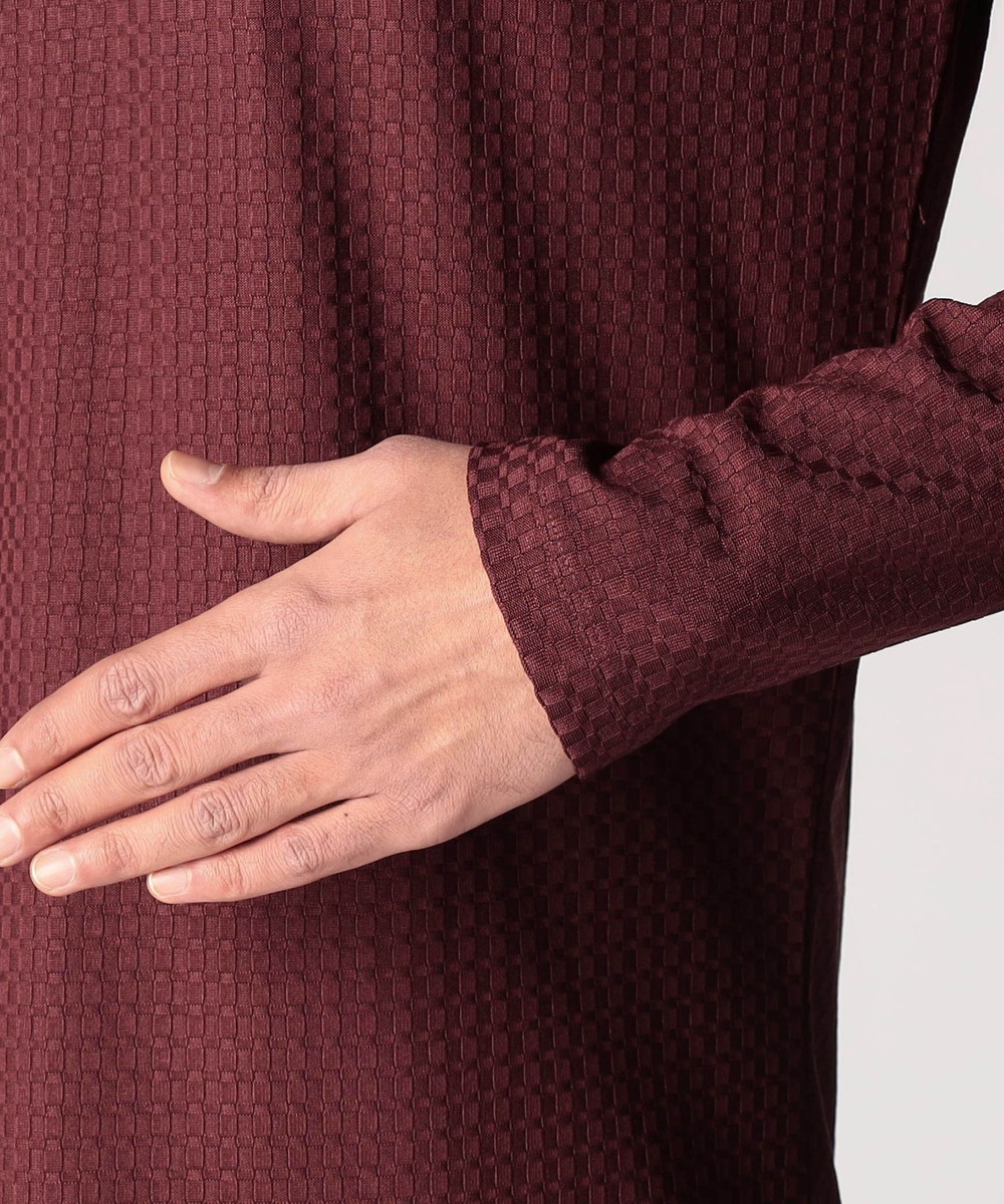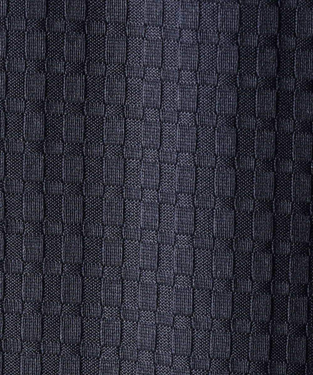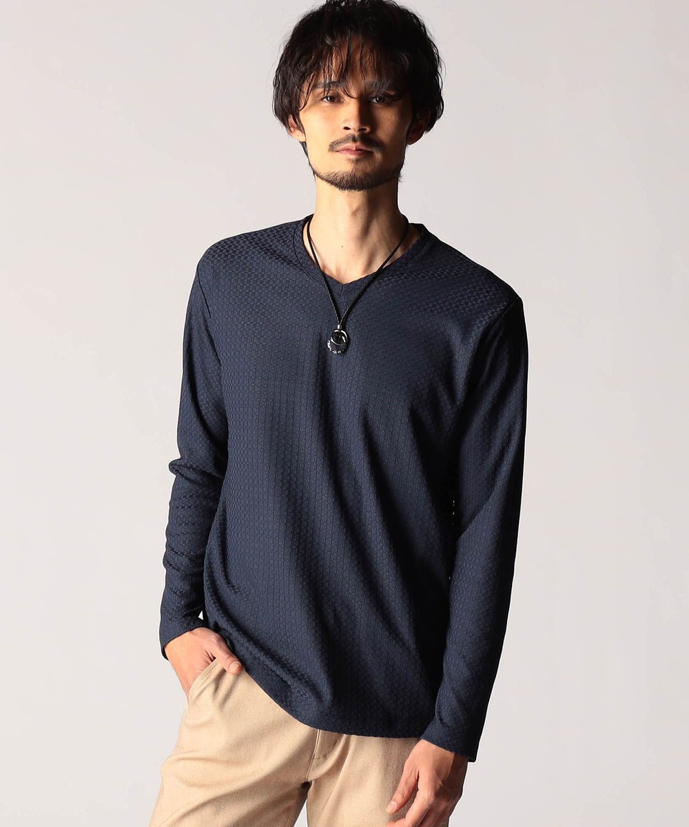 サラッとしたタッチ感と光沢のあるリンクスジャカード生地を使用した浅VネックロンT。凹凸で表現したシックなブロック柄は、セットアップのインナーとしても活躍できる汎用性の高いアイテムです。