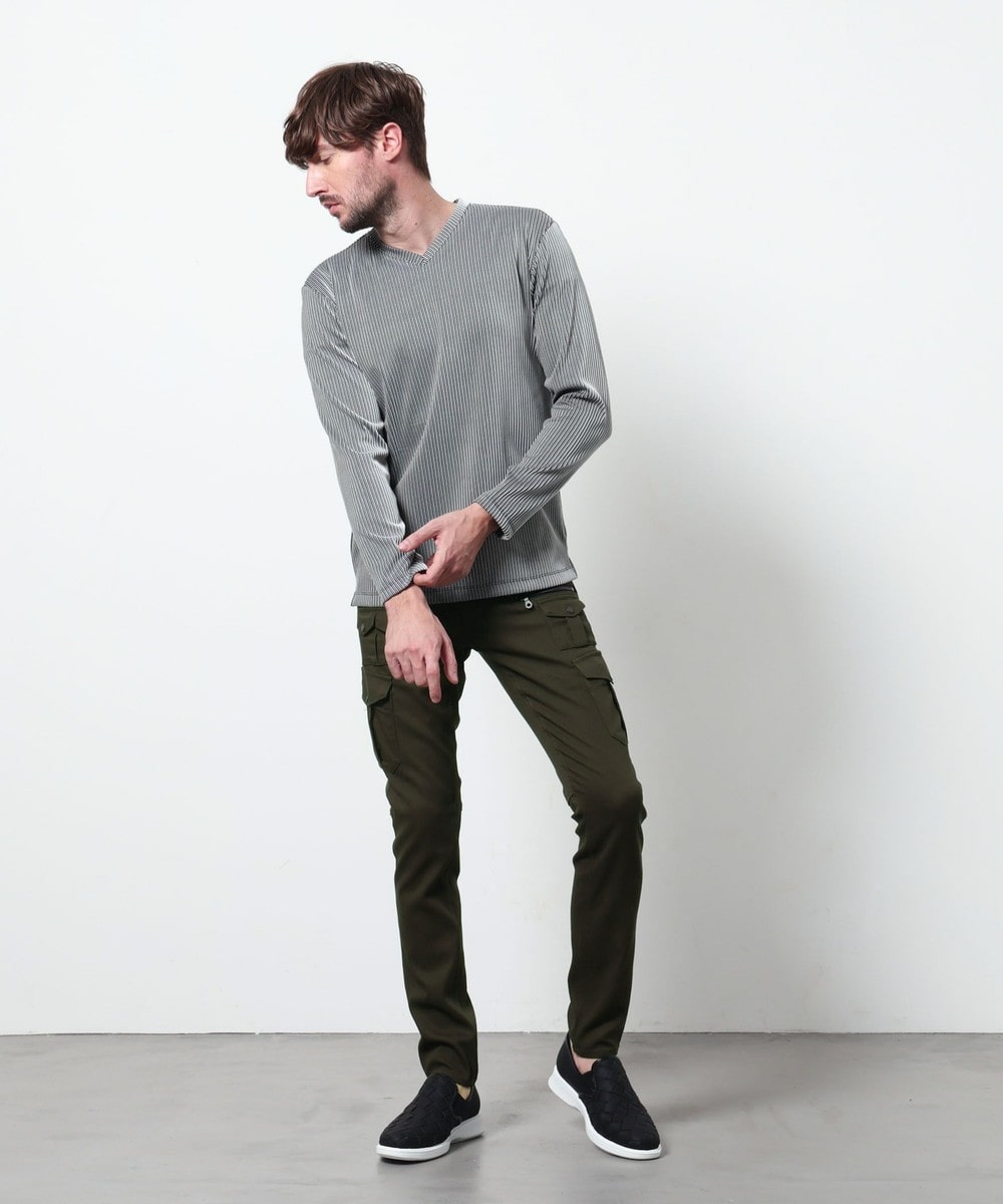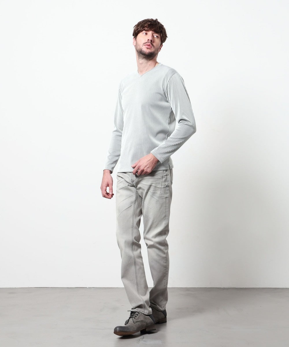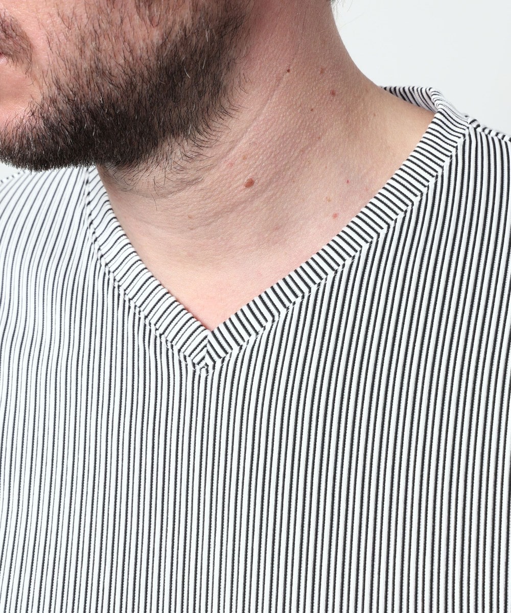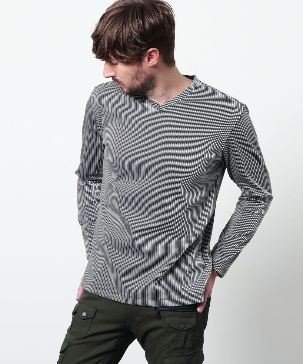 張りのある素材感でインナーとしてもアウターとしても着用できる浅Vネックプルオーバーになります。