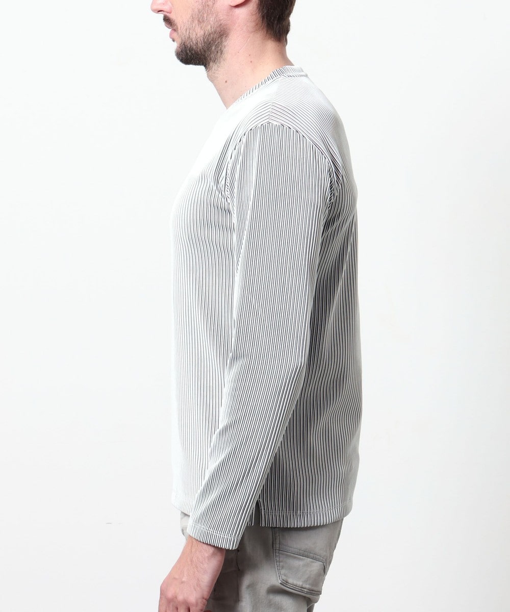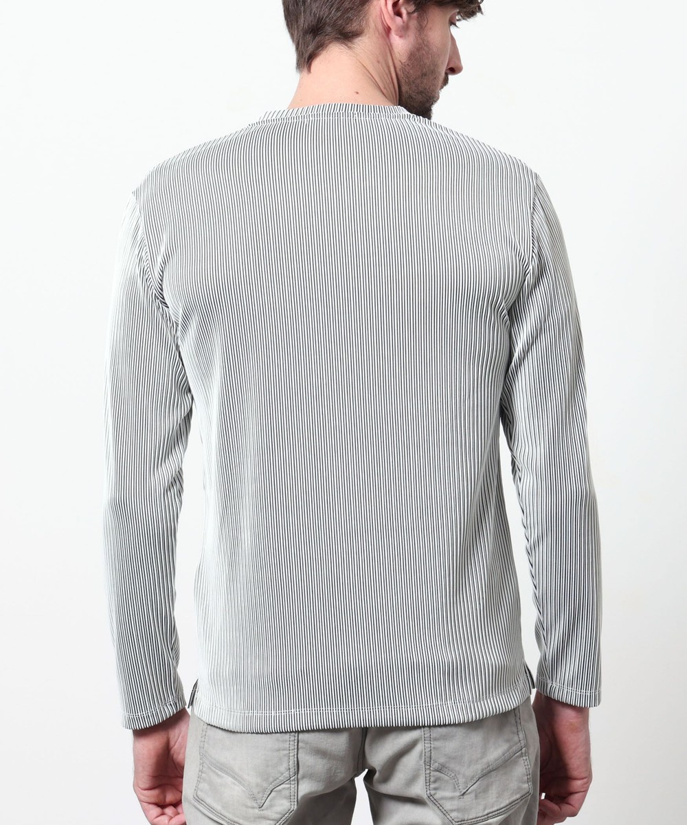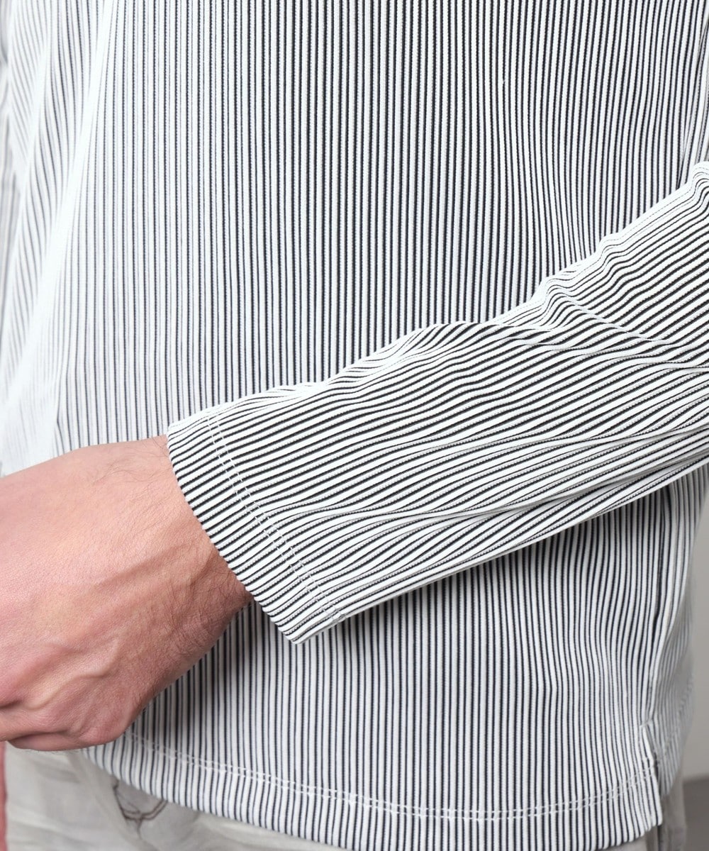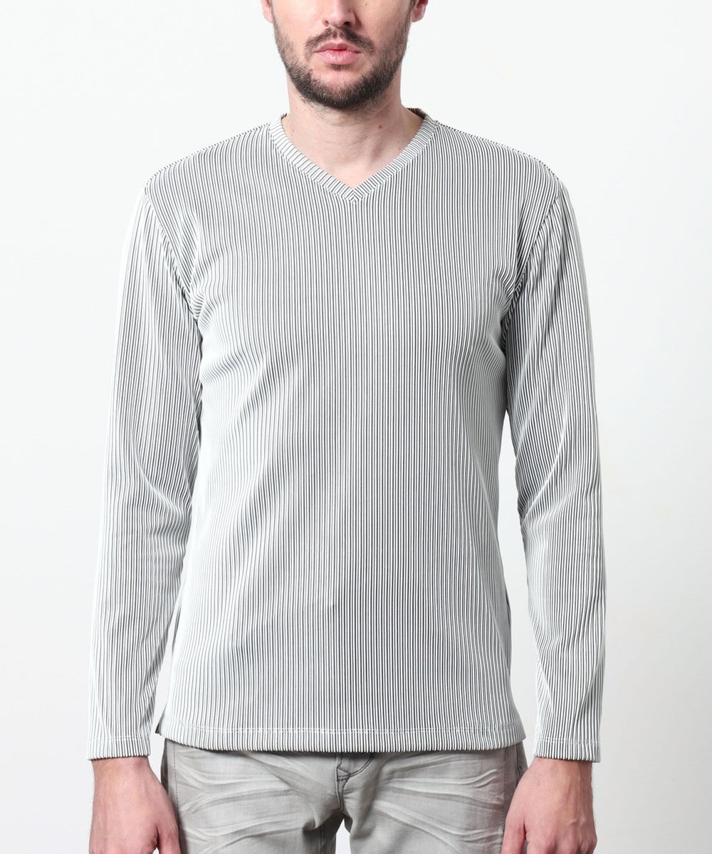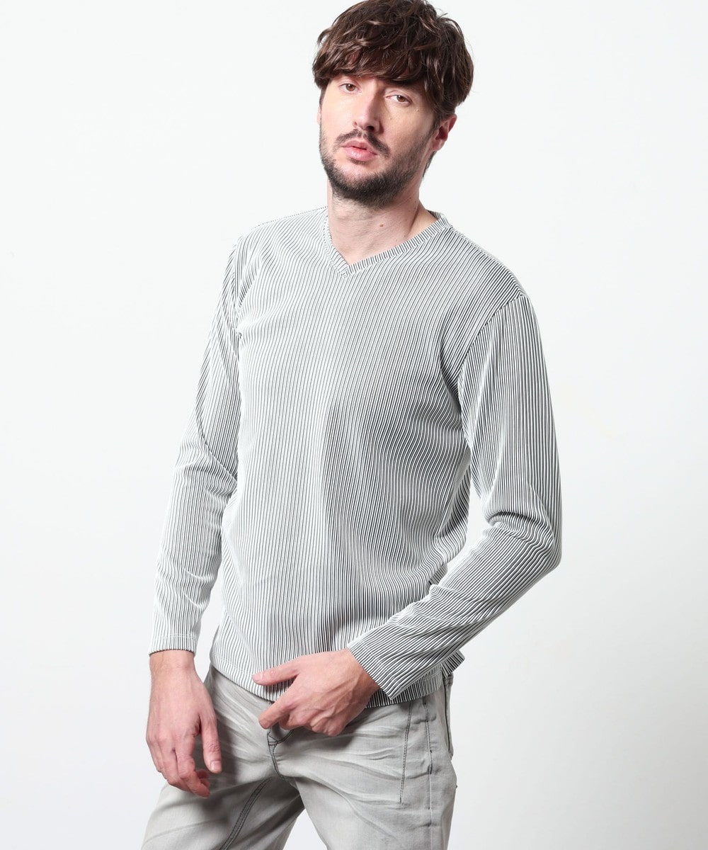 張りのある素材感でインナーとしてもアウターとしても着用できる浅Vネックプルオーバーになります。