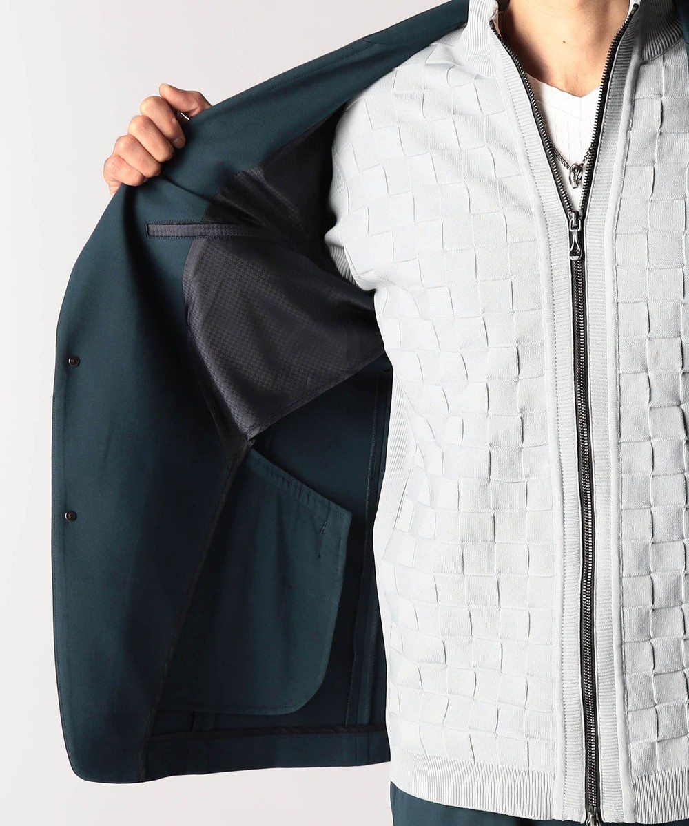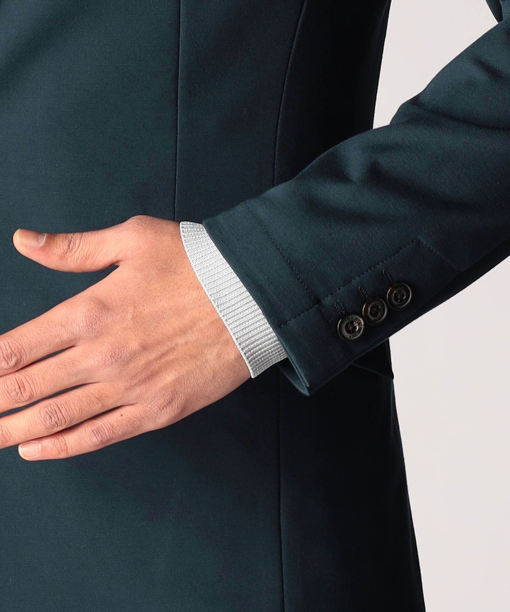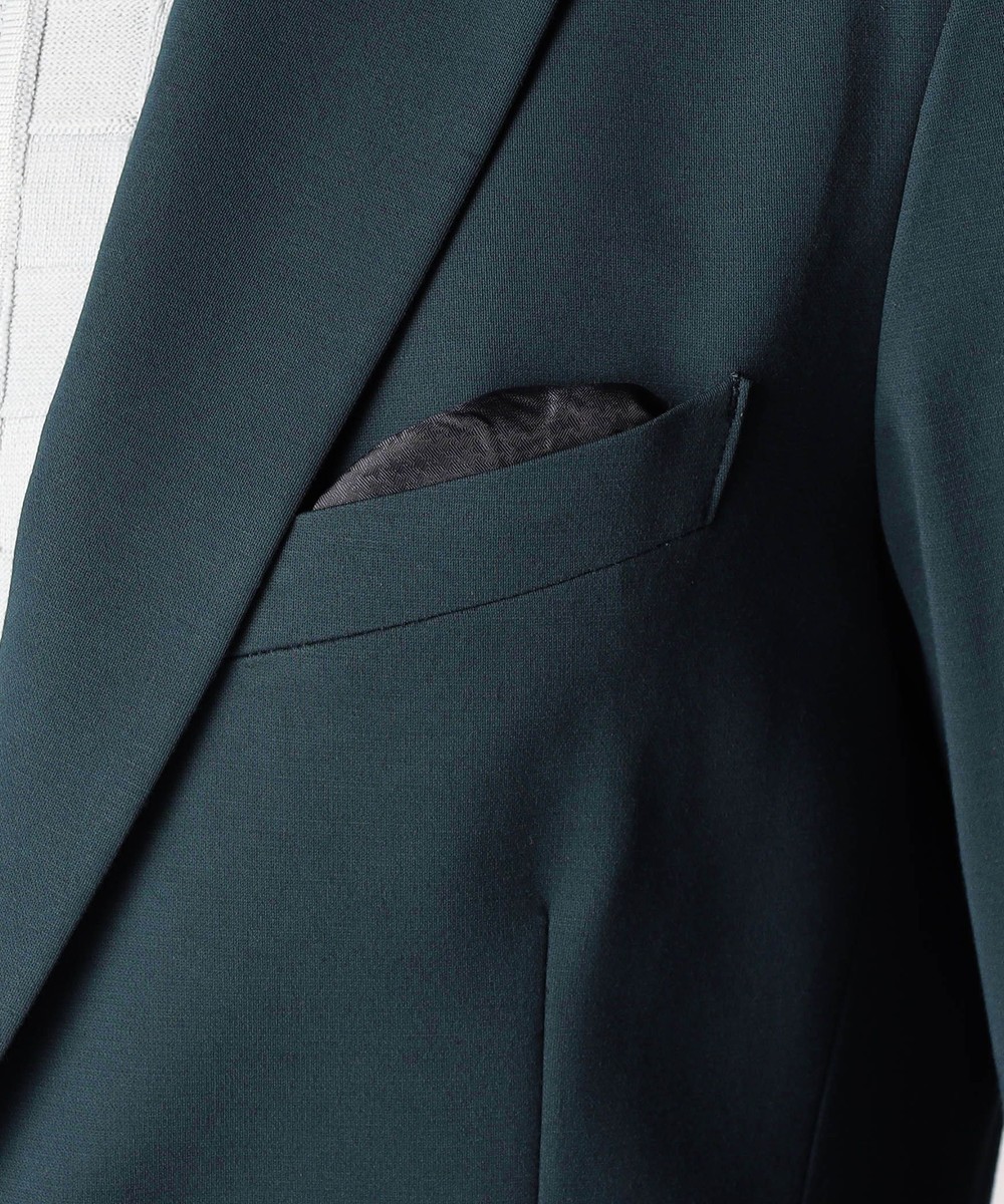 セミピークドラペルの2Bジャケット。少し太めのラペルにスラントポケットでウエストシェイプのシルエットを強調、極力ステッチも入れずシンプルに作りました。左胸はフェイクチーフ仕様、大身返しの半裏仕様でジャカード裏地を採用して高級感ある見え方に作っています。一番下の釦は止める設定になっていません。