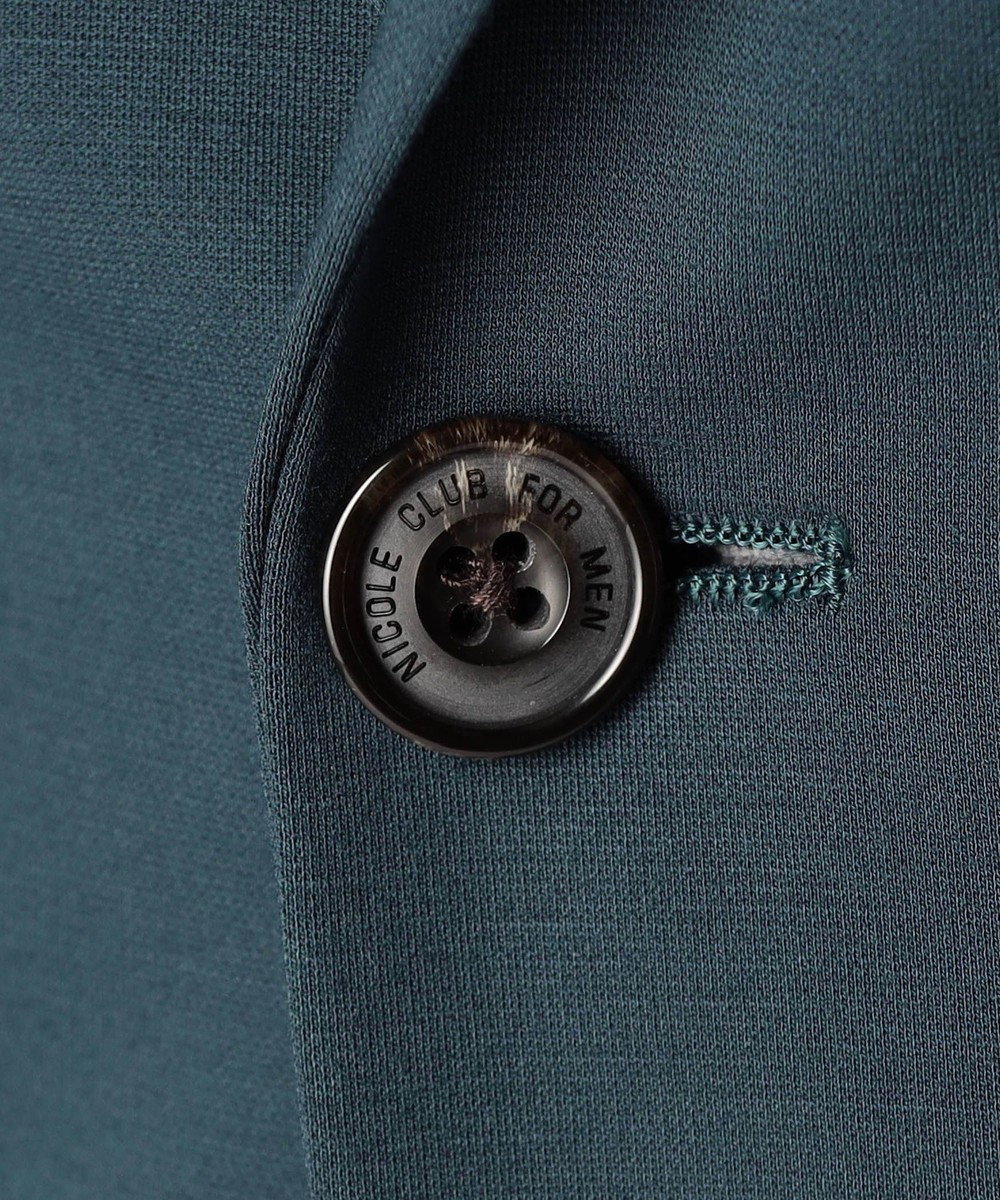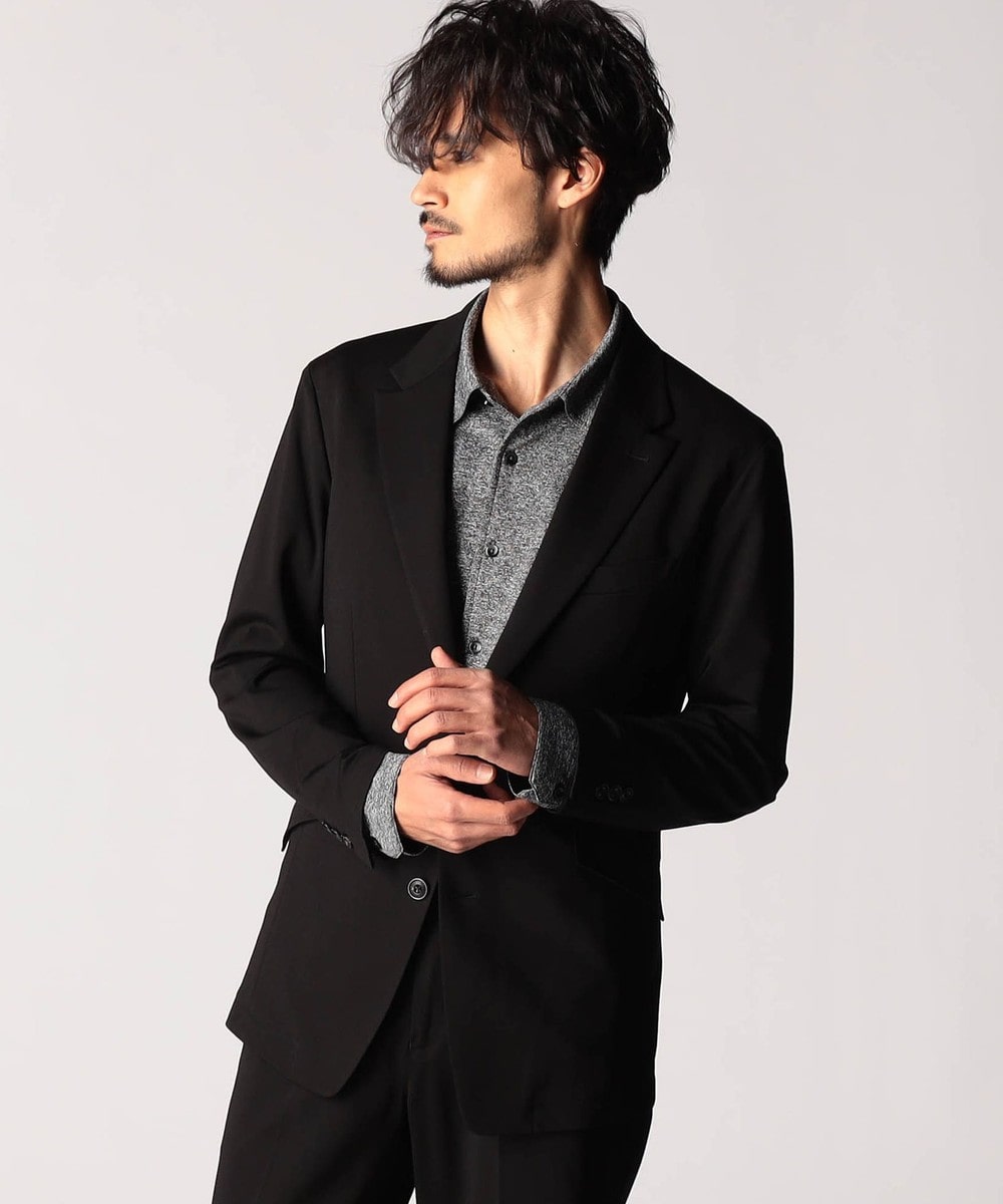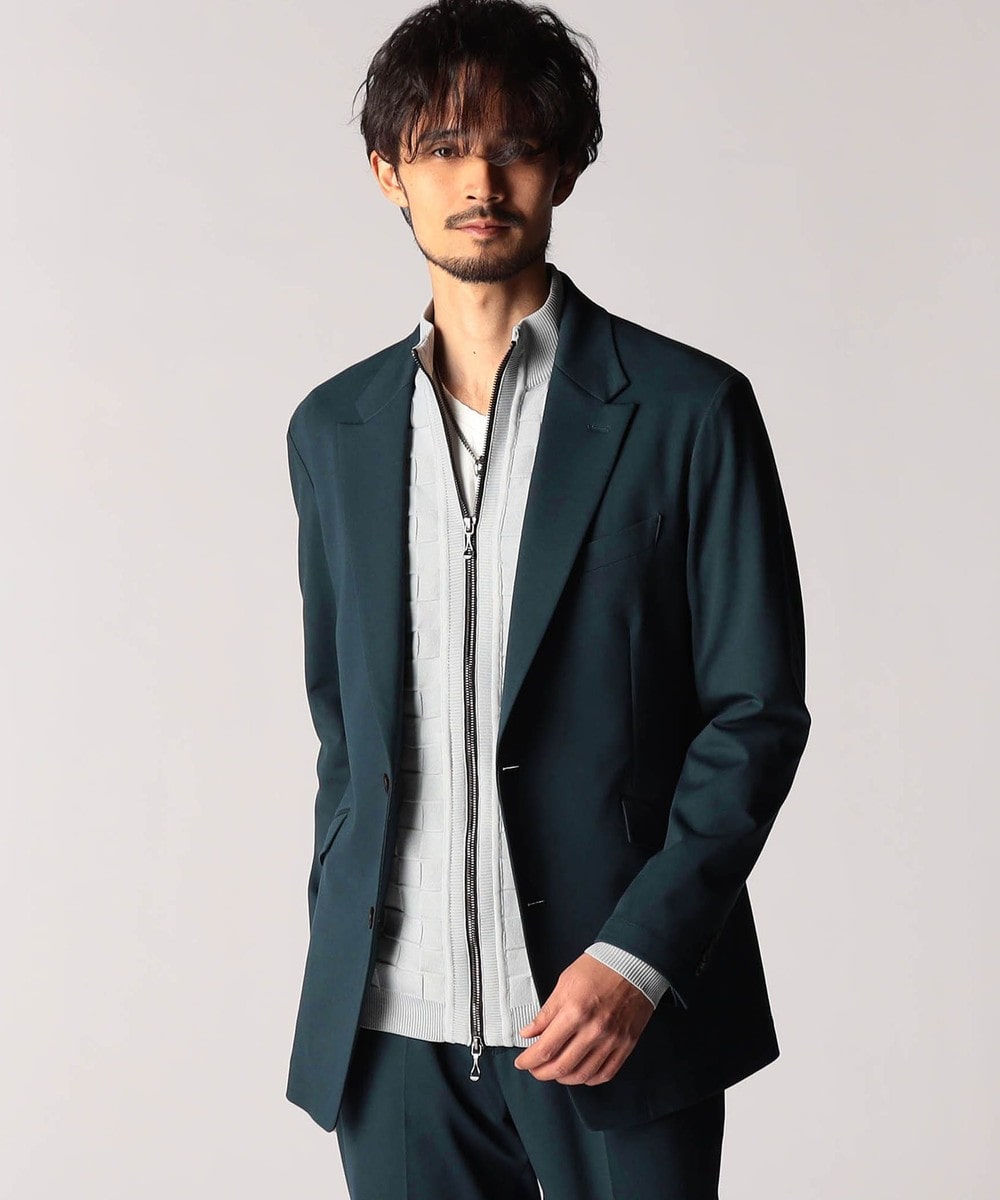 セミピークドラペルの2Bジャケット。少し太めのラペルにスラントポケットでウエストシェイプのシルエットを強調、極力ステッチも入れずシンプルに作りました。左胸はフェイクチーフ仕様、大身返しの半裏仕様でジャカード裏地を採用して高級感ある見え方に作っています。一番下の釦は止める設定になっていません。