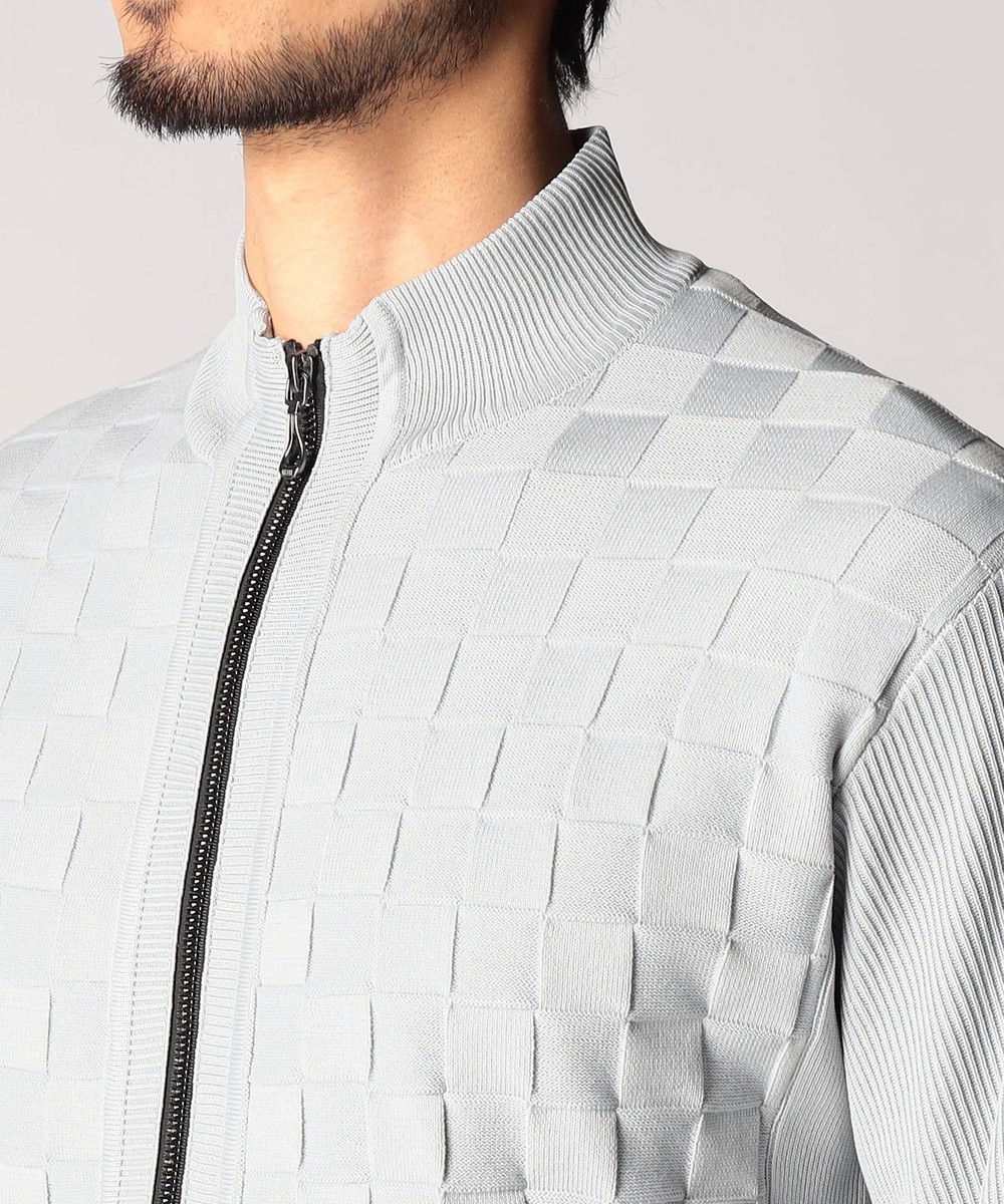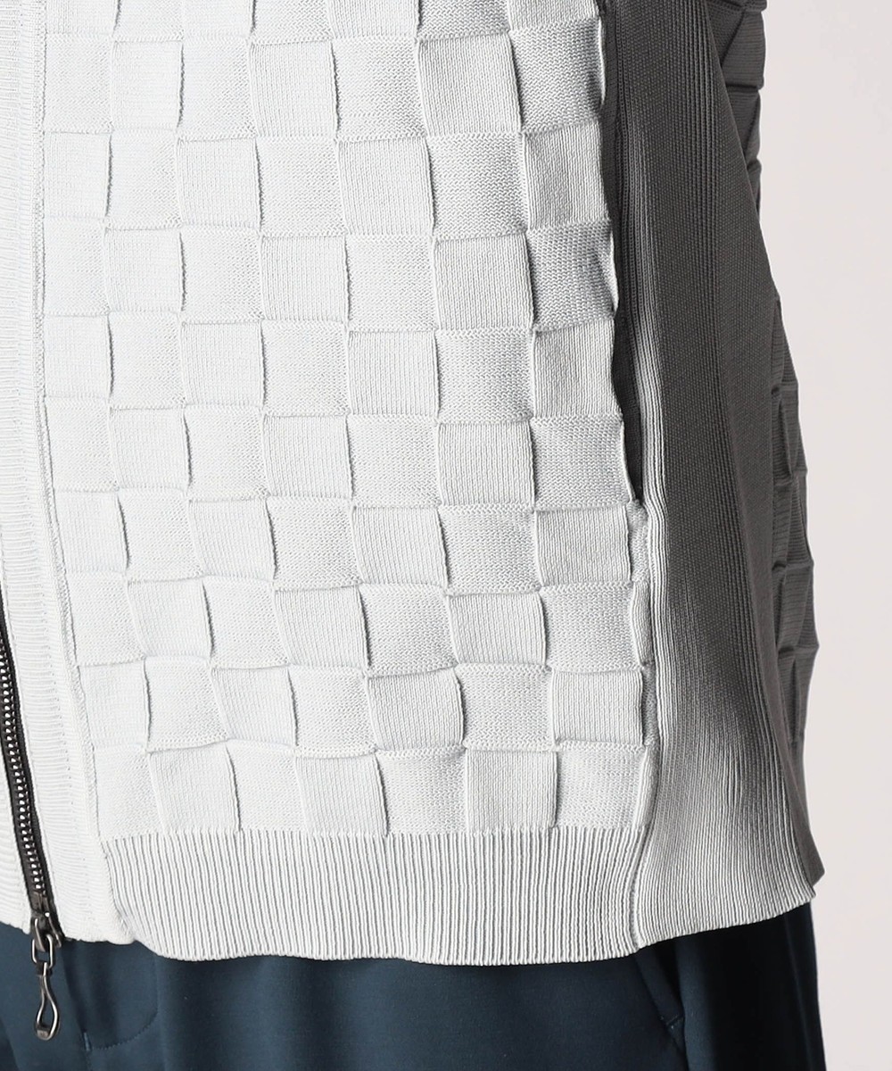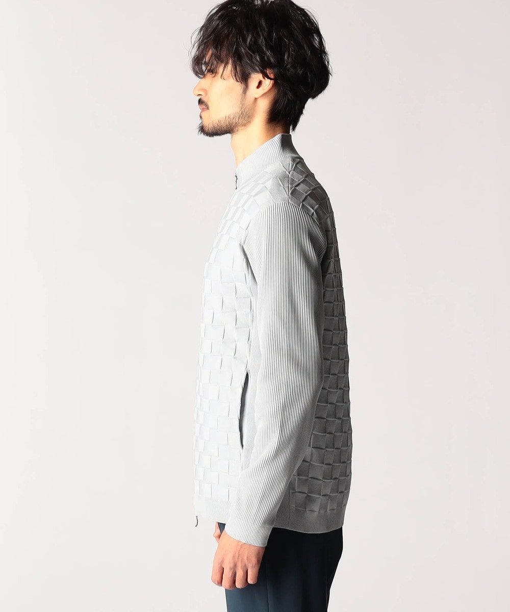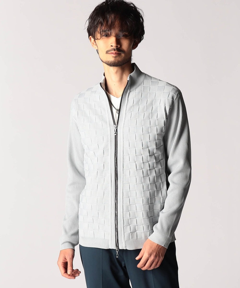 身頃をシャープなブロック柄に編み立てたフルジップタイプのスタンドニットブルゾン。細番手を使用したハイゲージの編地が柄の凹凸感を引き立てています。箔転写ファスナーをアクセントに、ラグジュアリーかつモードな印象に仕上げています。袖と細腹の編地はリブに切り替え、着用感を高めながらシャープなシルエットを演出。脇前の切替部分にはスラッシュポケットを設け、機能性もプラスしています。