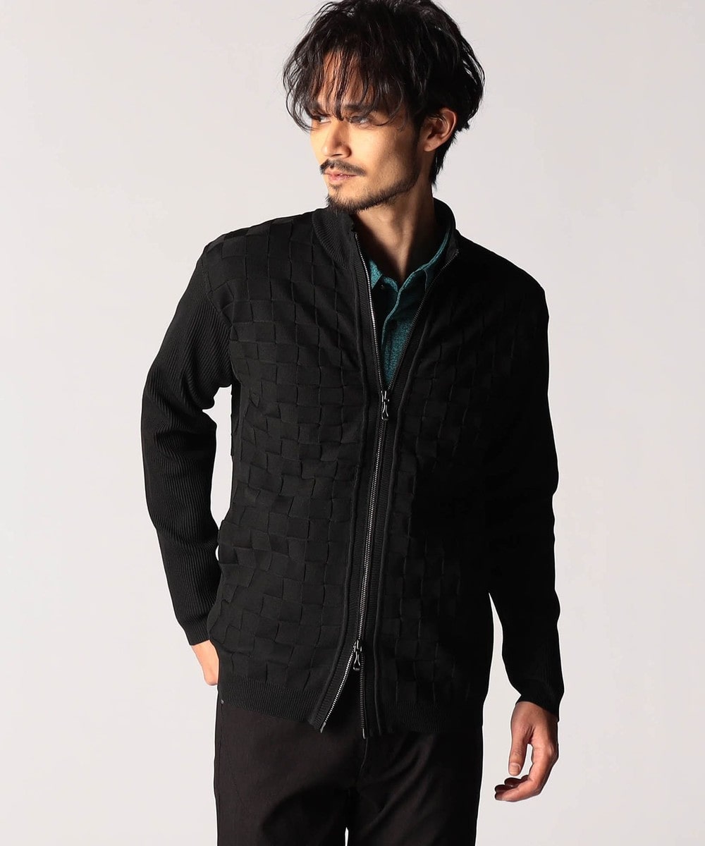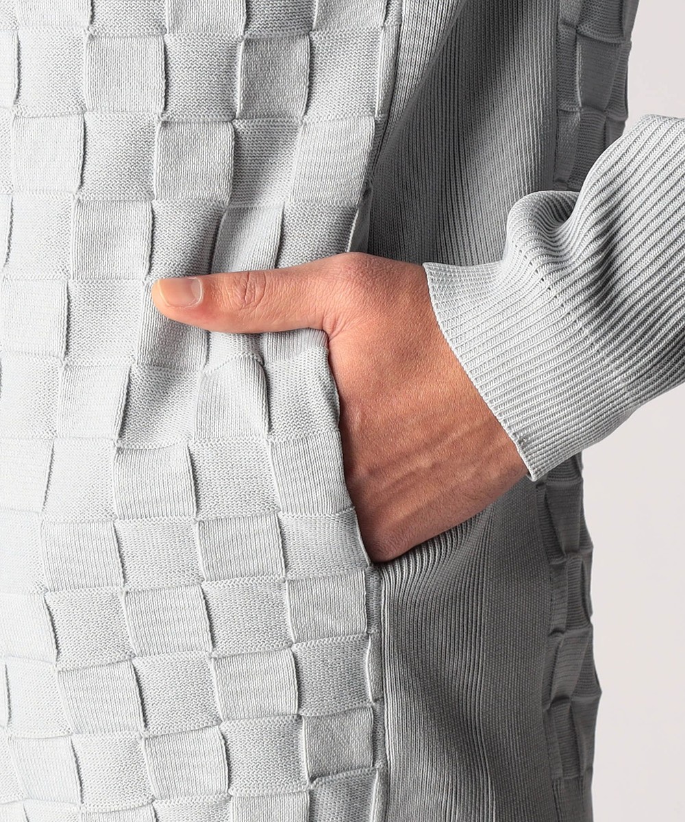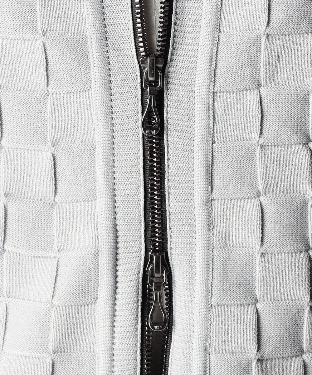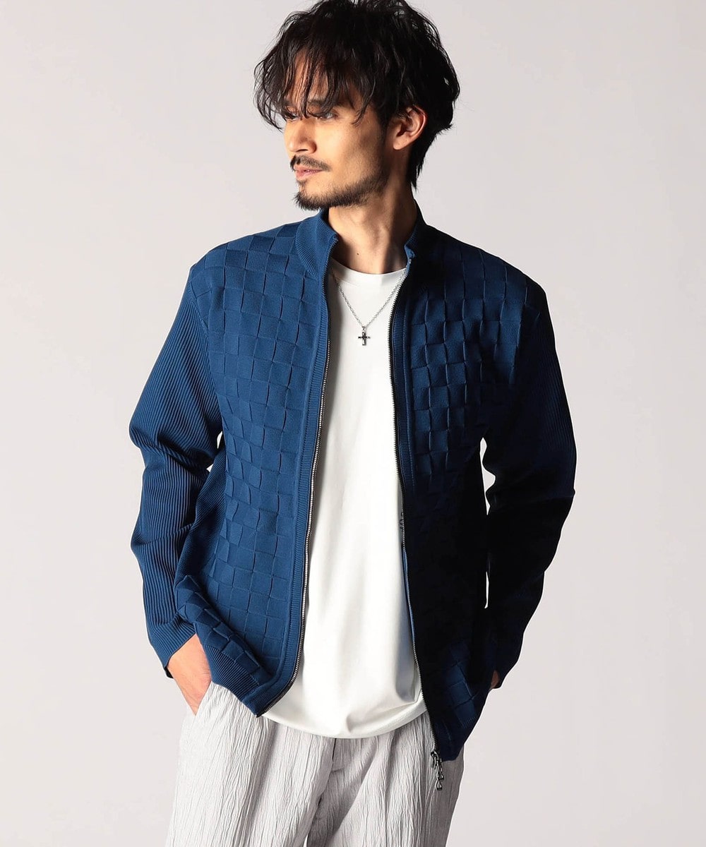 身頃をシャープなブロック柄に編み立てたフルジップタイプのスタンドニットブルゾン。細番手を使用したハイゲージの編地が柄の凹凸感を引き立てています。箔転写ファスナーをアクセントに、ラグジュアリーかつモードな印象に仕上げています。袖と細腹の編地はリブに切り替え、着用感を高めながらシャープなシルエットを演出。脇前の切替部分にはスラッシュポケットを設け、機能性もプラスしています。