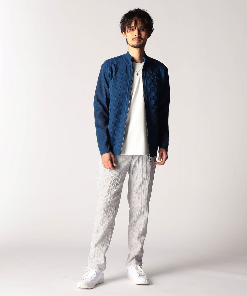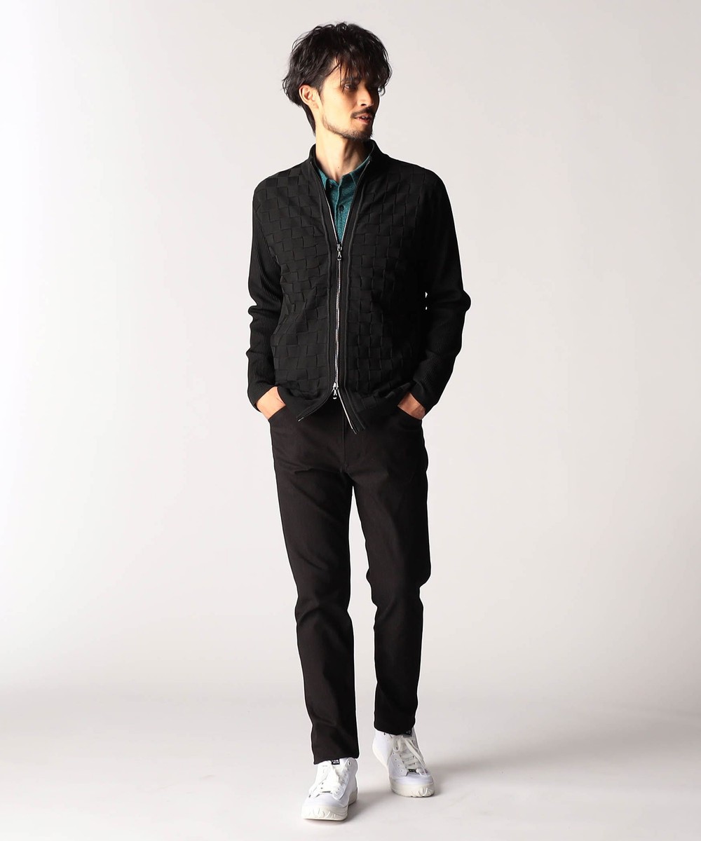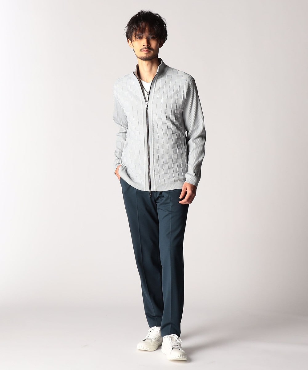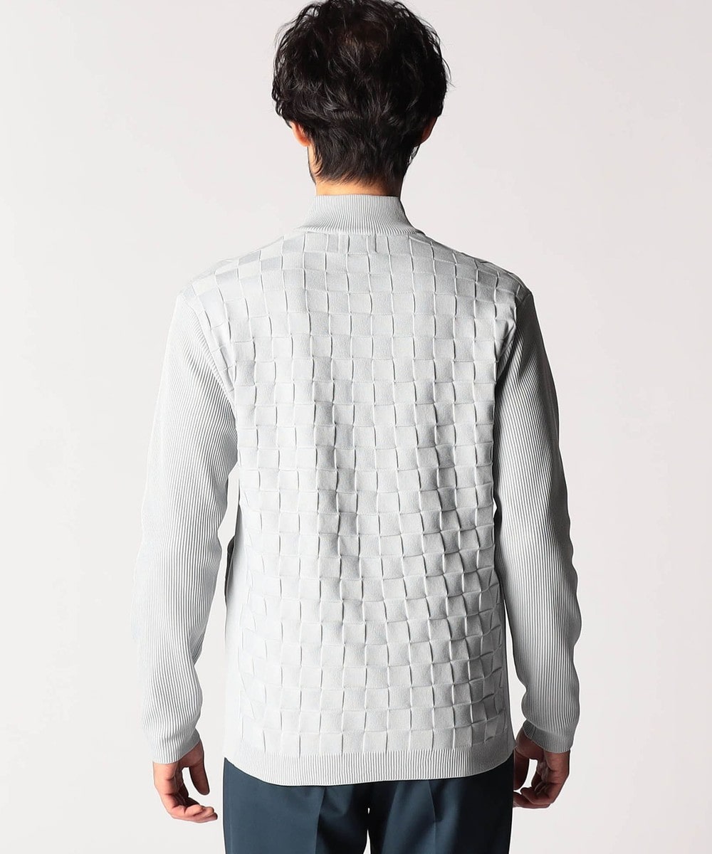 身頃をシャープなブロック柄に編み立てたフルジップタイプのスタンドニットブルゾン。細番手を使用したハイゲージの編地が柄の凹凸感を引き立てています。箔転写ファスナーをアクセントに、ラグジュアリーかつモードな印象に仕上げています。袖と細腹の編地はリブに切り替え、着用感を高めながらシャープなシルエットを演出。脇前の切替部分にはスラッシュポケットを設け、機能性もプラスしています。