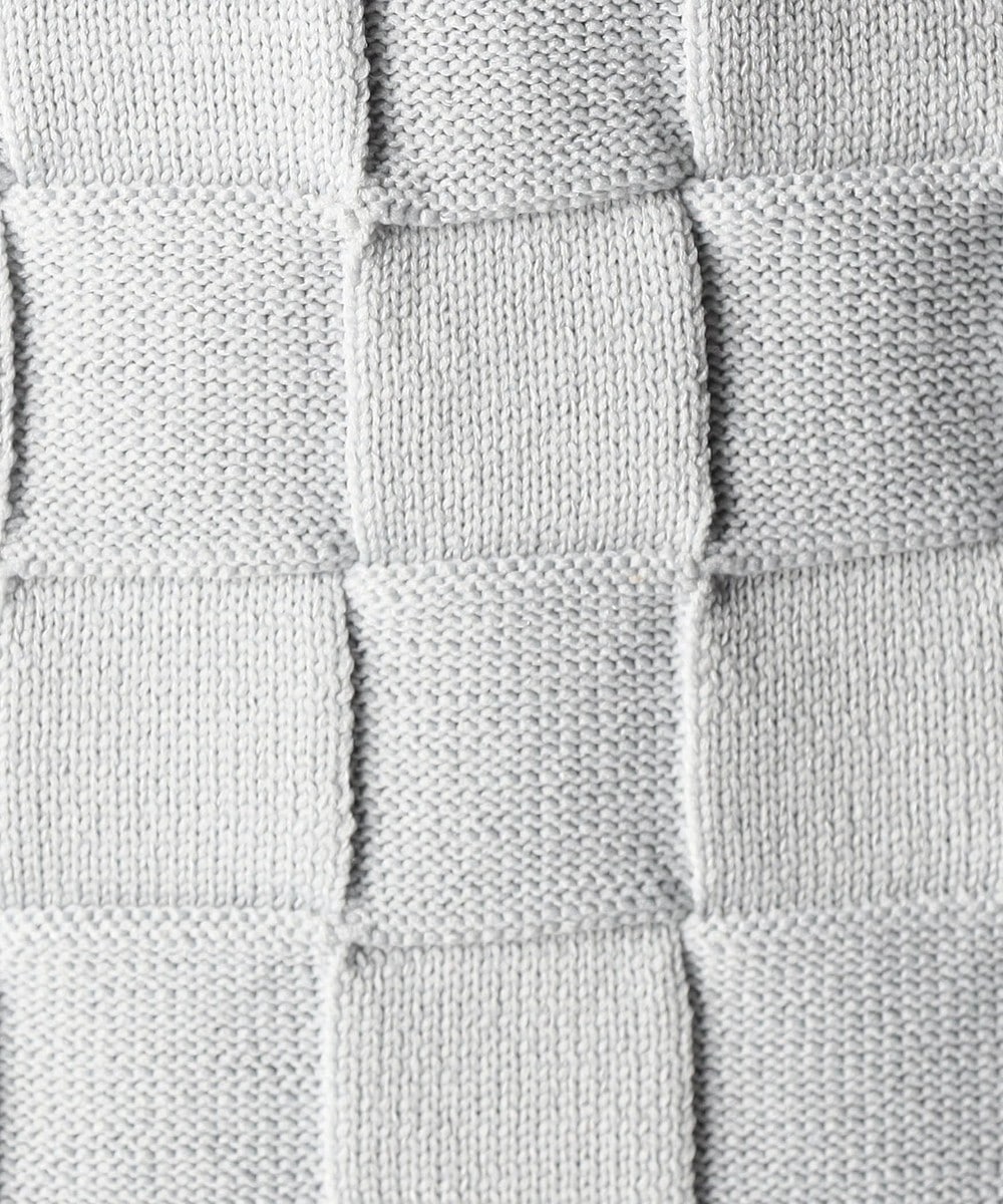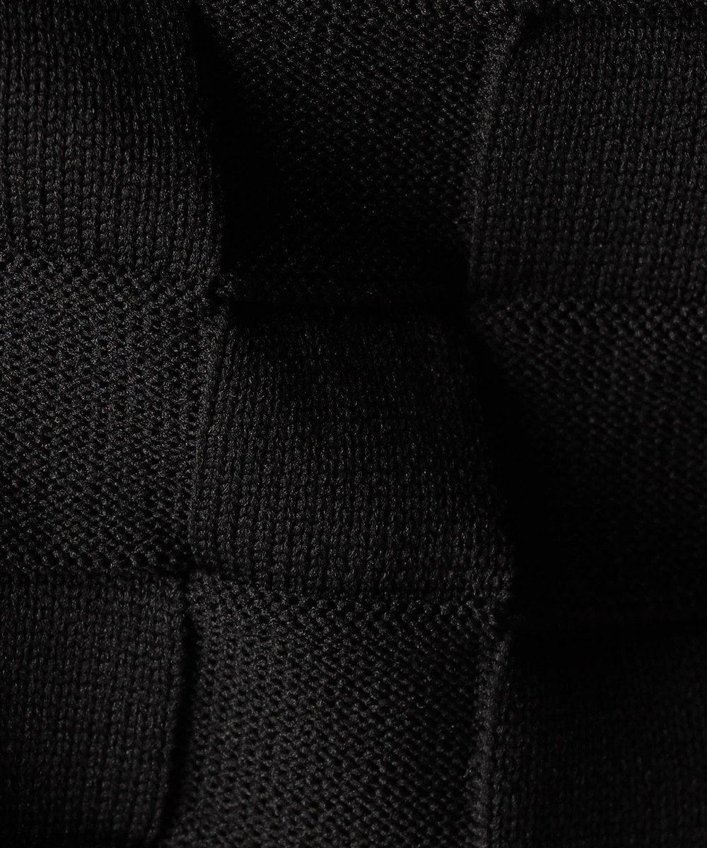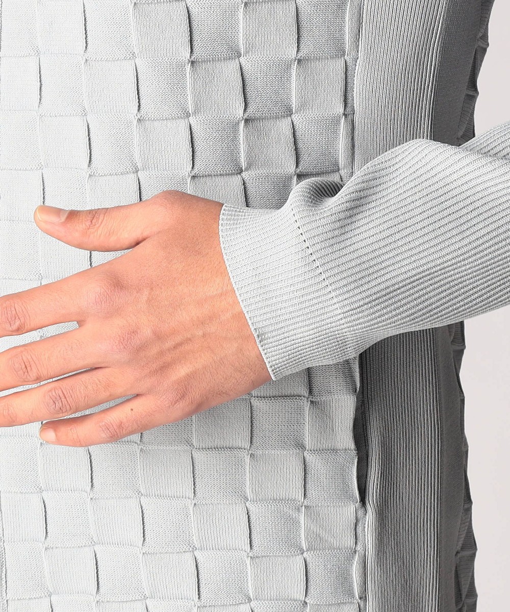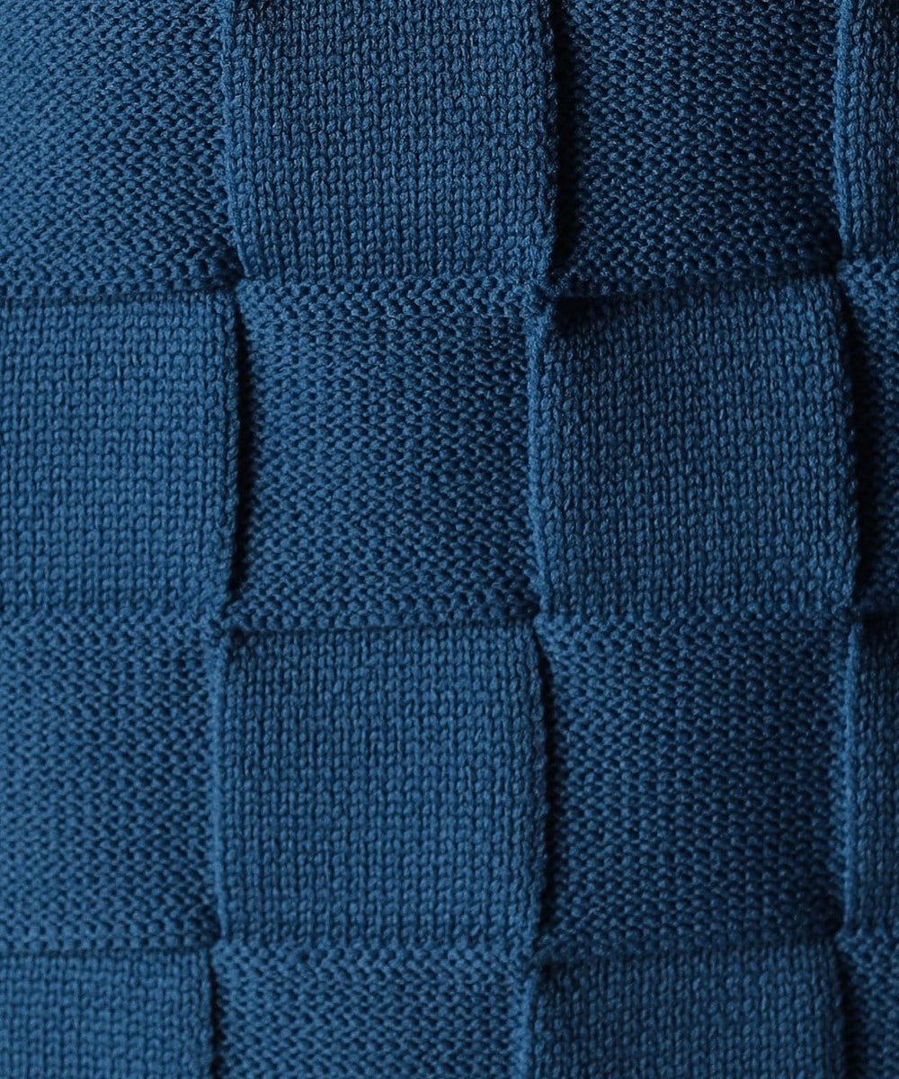 身頃をシャープなブロック柄に編み立てたフルジップタイプのスタンドニットブルゾン。細番手を使用したハイゲージの編地が柄の凹凸感を引き立てています。箔転写ファスナーをアクセントに、ラグジュアリーかつモードな印象に仕上げています。袖と細腹の編地はリブに切り替え、着用感を高めながらシャープなシルエットを演出。脇前の切替部分にはスラッシュポケットを設け、機能性もプラスしています。