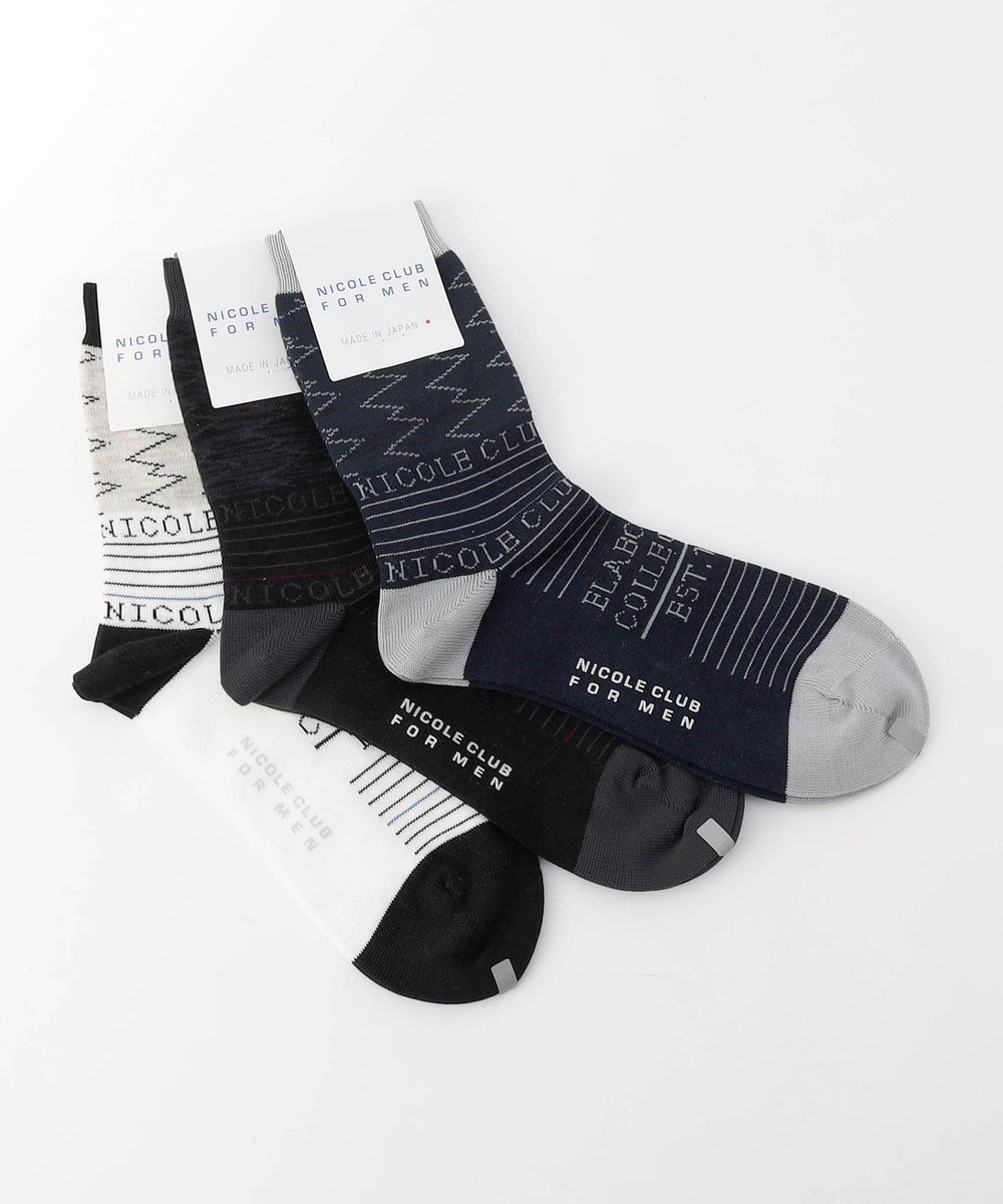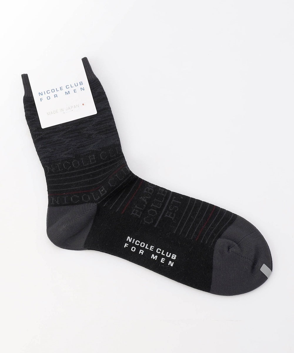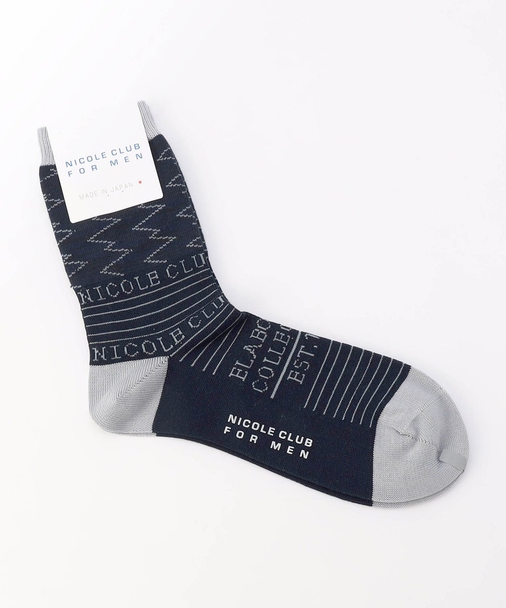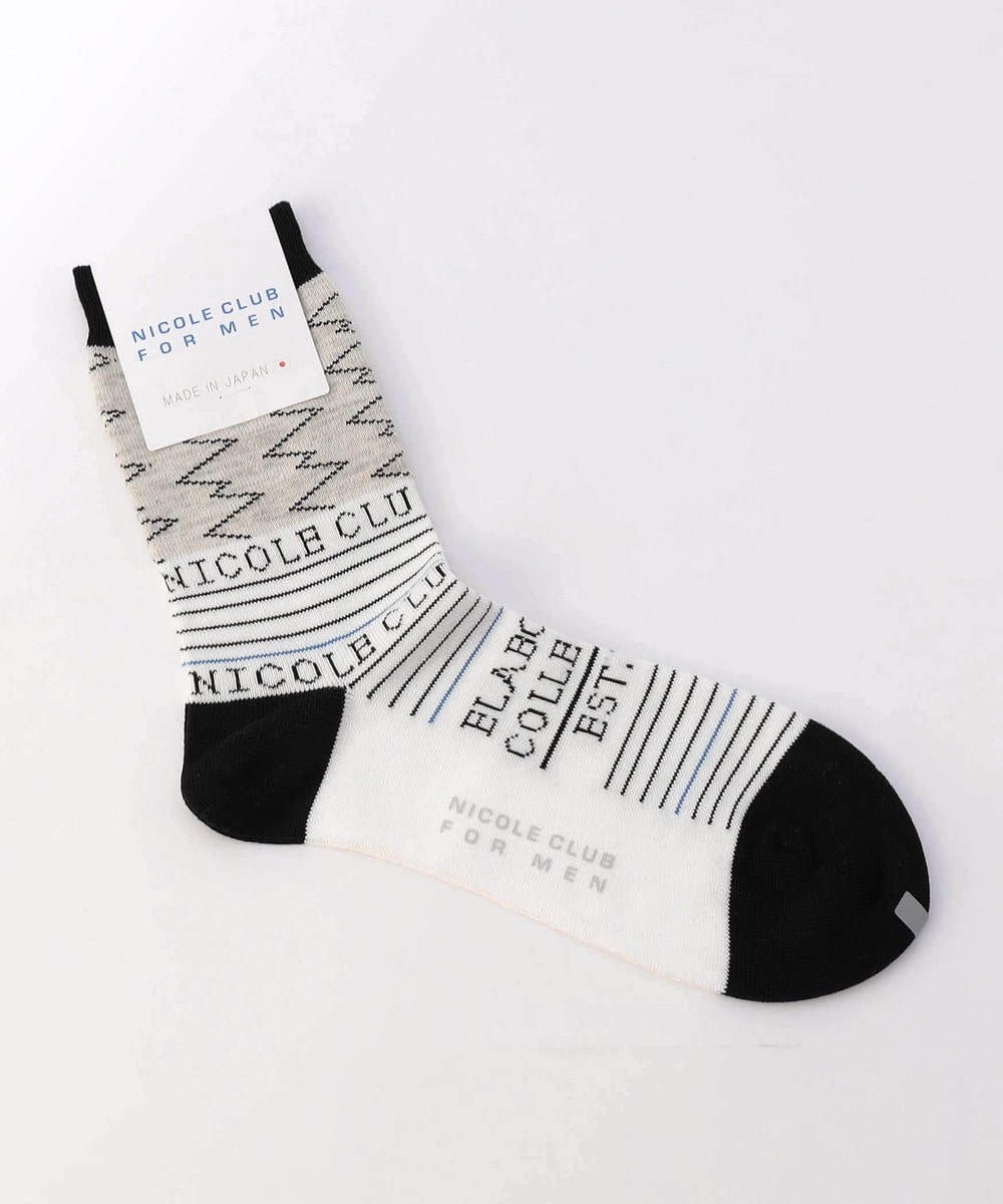 ロゴ×ボーダーデザインのクルー丈ソックス。国内工場で編み上げた上質な仕上がりの日本製ソックスです。履き口付近の大胆なジグザグライン柄をはじめ、ロゴとボーダー部分を配色にしたメリハリのあるデザインが特徴です。甲部分にもジャカードロゴを入れて一層オリジナリティを高めました。パンツの裾口からデザインを少し覗かせてのスタイリングも楽しめます。ブランドネーム入りの口紙付き包装なので、ちょっとしたギフトにもおすすめです。