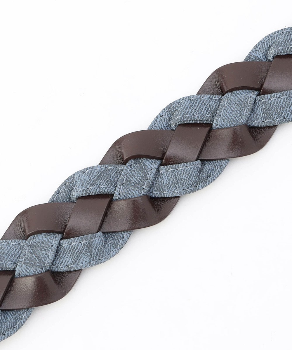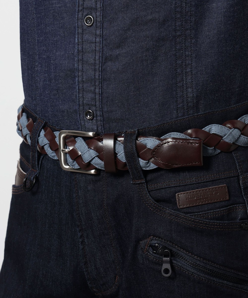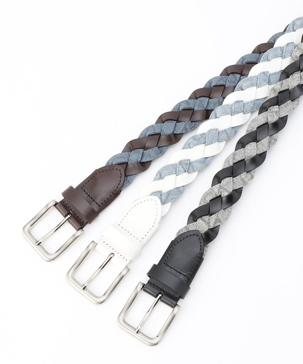 帯部分は皮革繊維再生複合材とウォッシュドデニム調の合成皮革をテープ使いした異素材合わせで編み込んでいます。