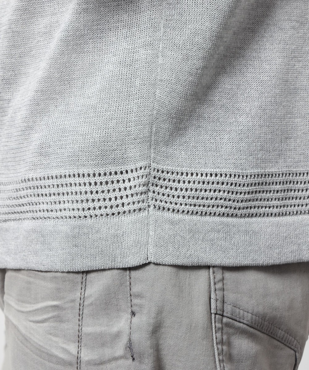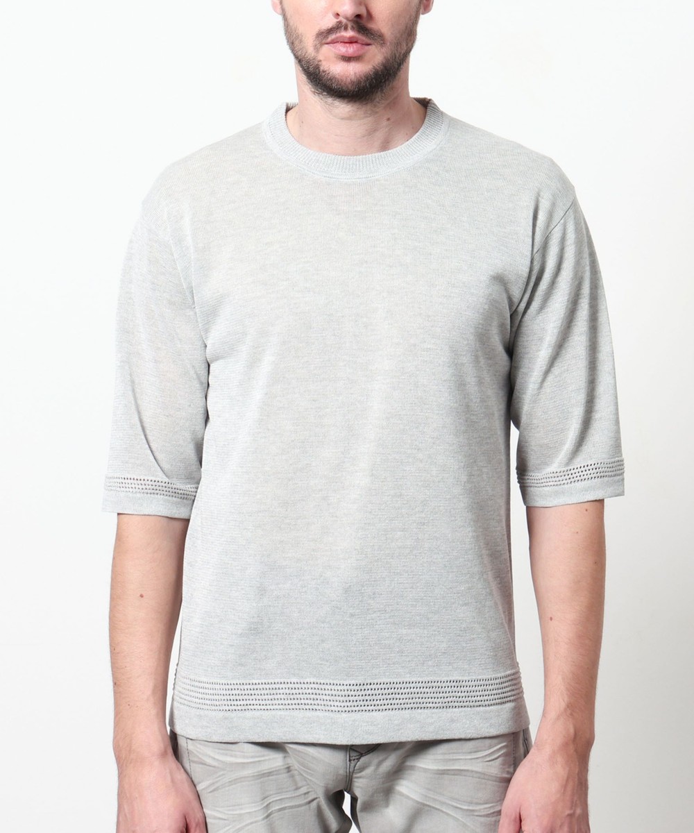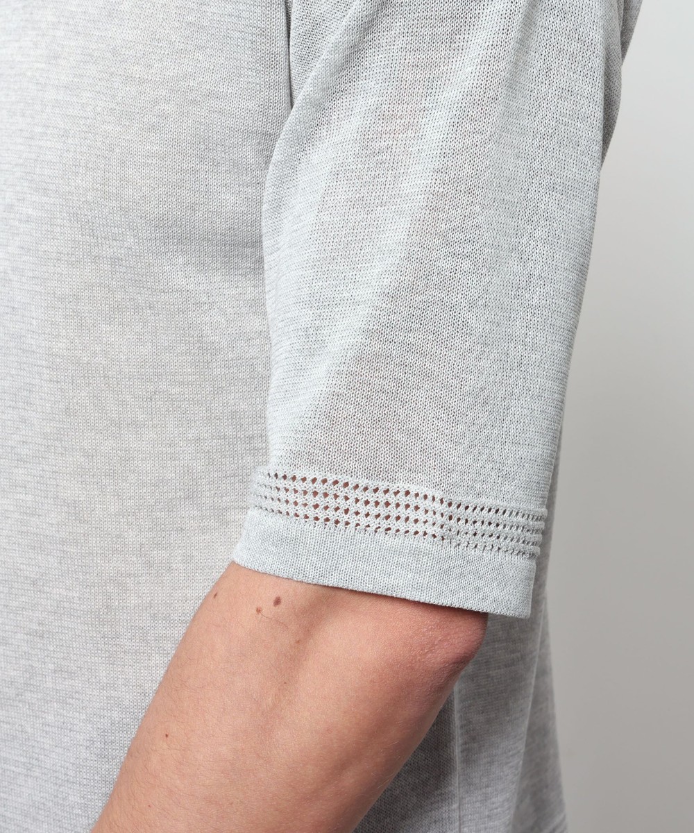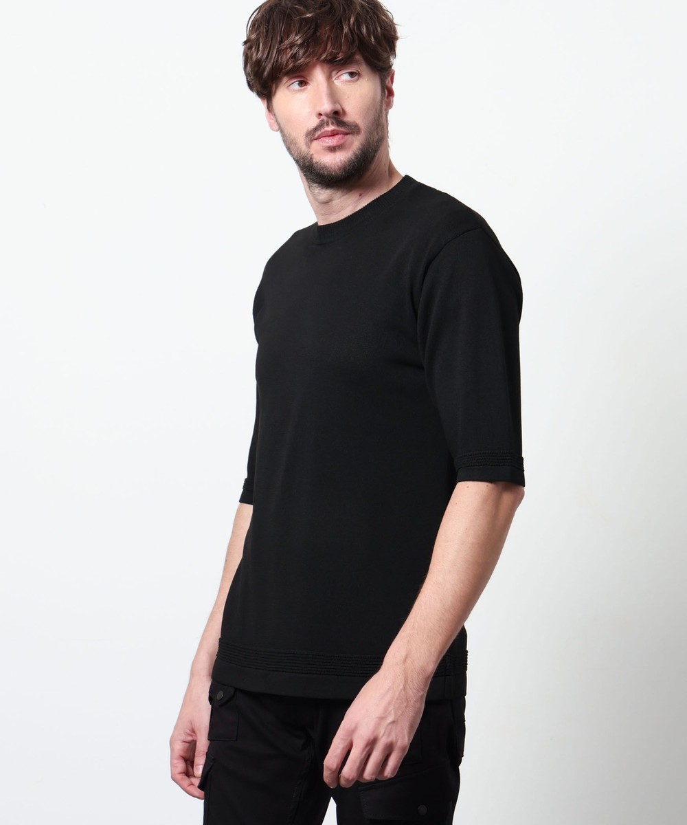 レーヨンポリエステル糸を使用して、12Gのハイゲージで編み立てた半袖天竺編みニットになります。