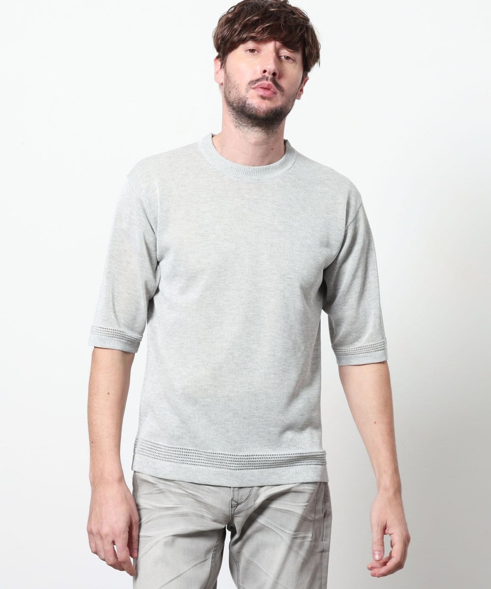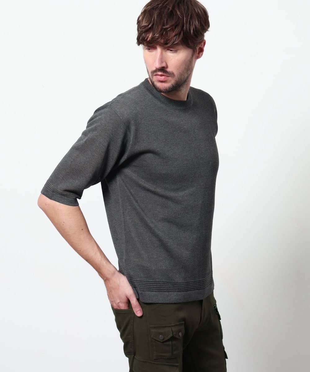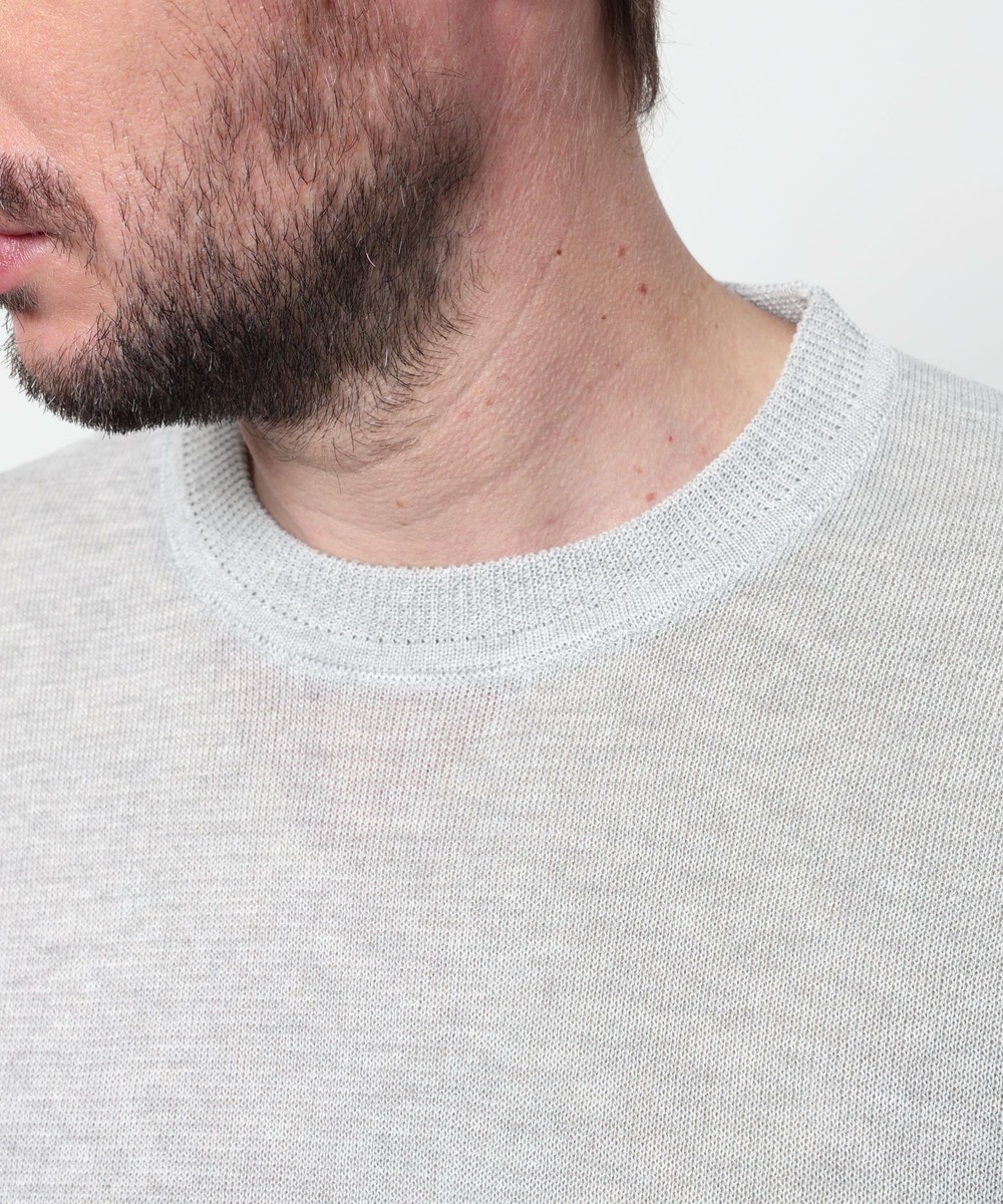 レーヨンポリエステル糸を使用して、12Gのハイゲージで編み立てた半袖天竺編みニットになります。