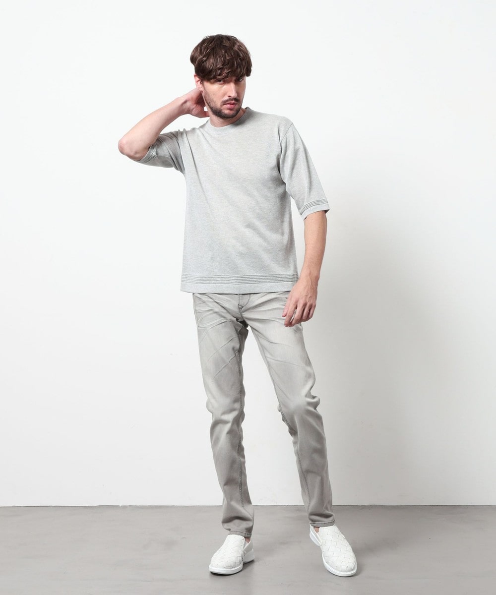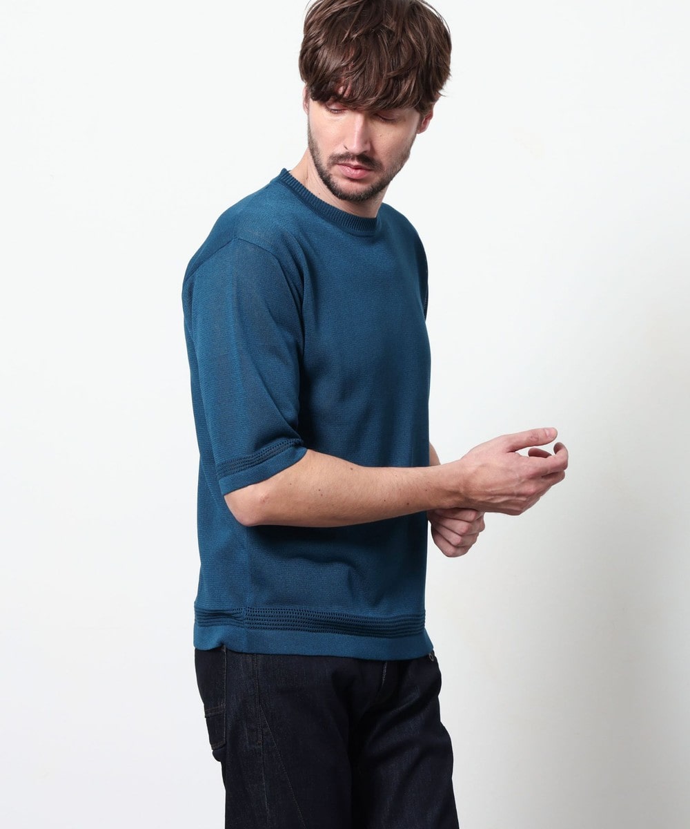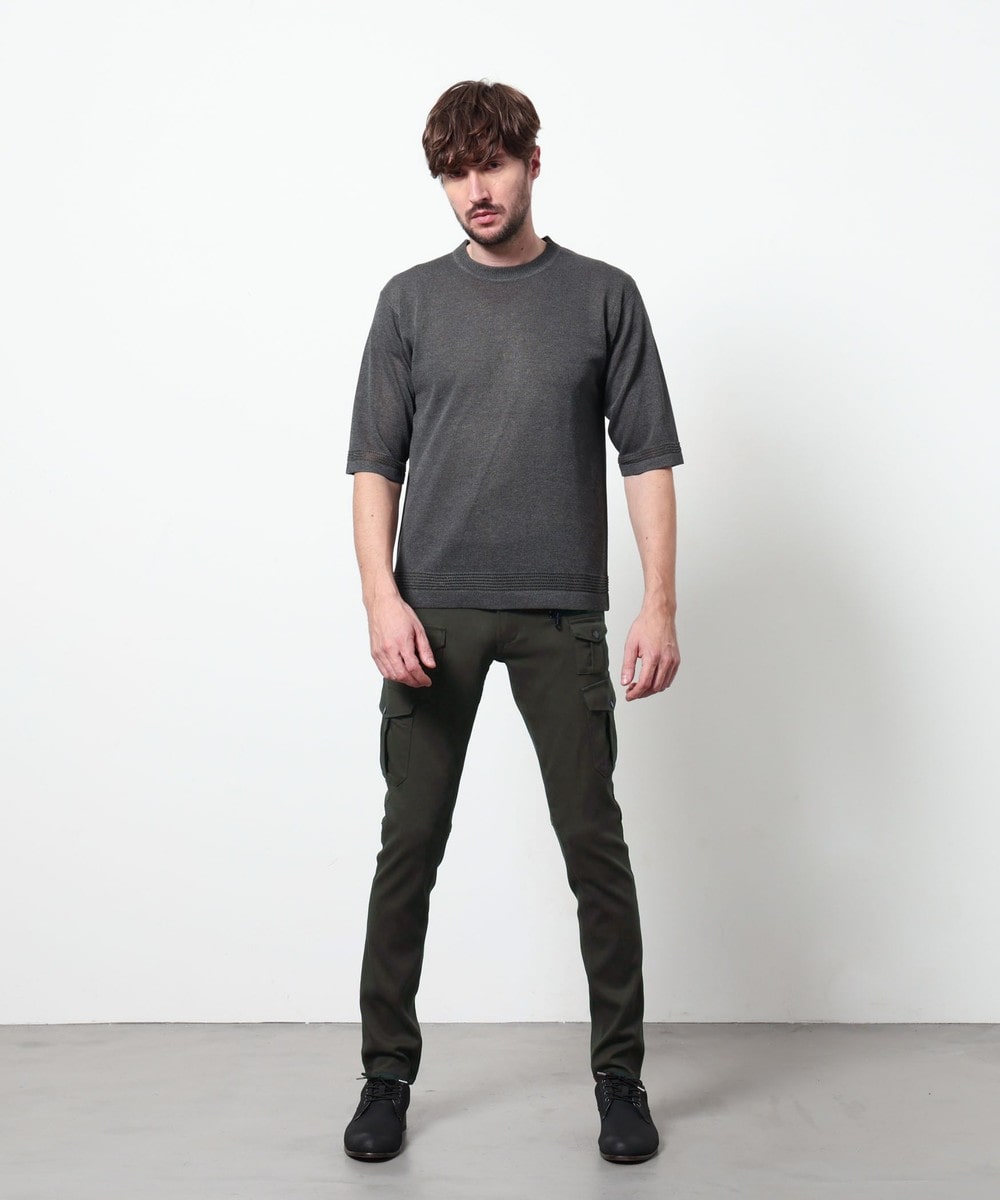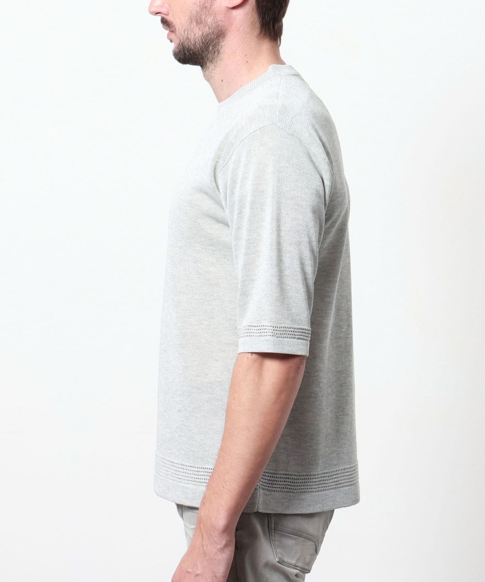 レーヨンポリエステル糸を使用して、12Gのハイゲージで編み立てた半袖天竺編みニットになります。