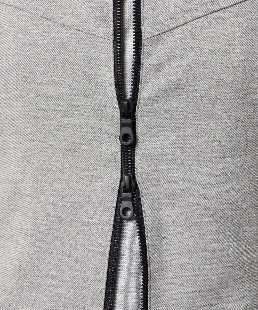 脇の切り替えを出来るだけ前に持って来ることでシャープな印象に仕上げ、衿端にワイヤーを入れることで、衿部分は立てた状態でも、折り返した状態でも着用出来る様にしています。