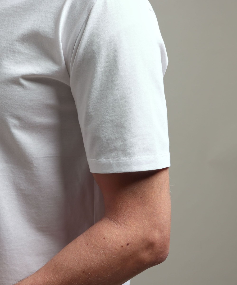前身頃胸と前身頃左裾にロゴプリントを施した、スッキリと見える上品なVネックTシャツに仕上げています。
