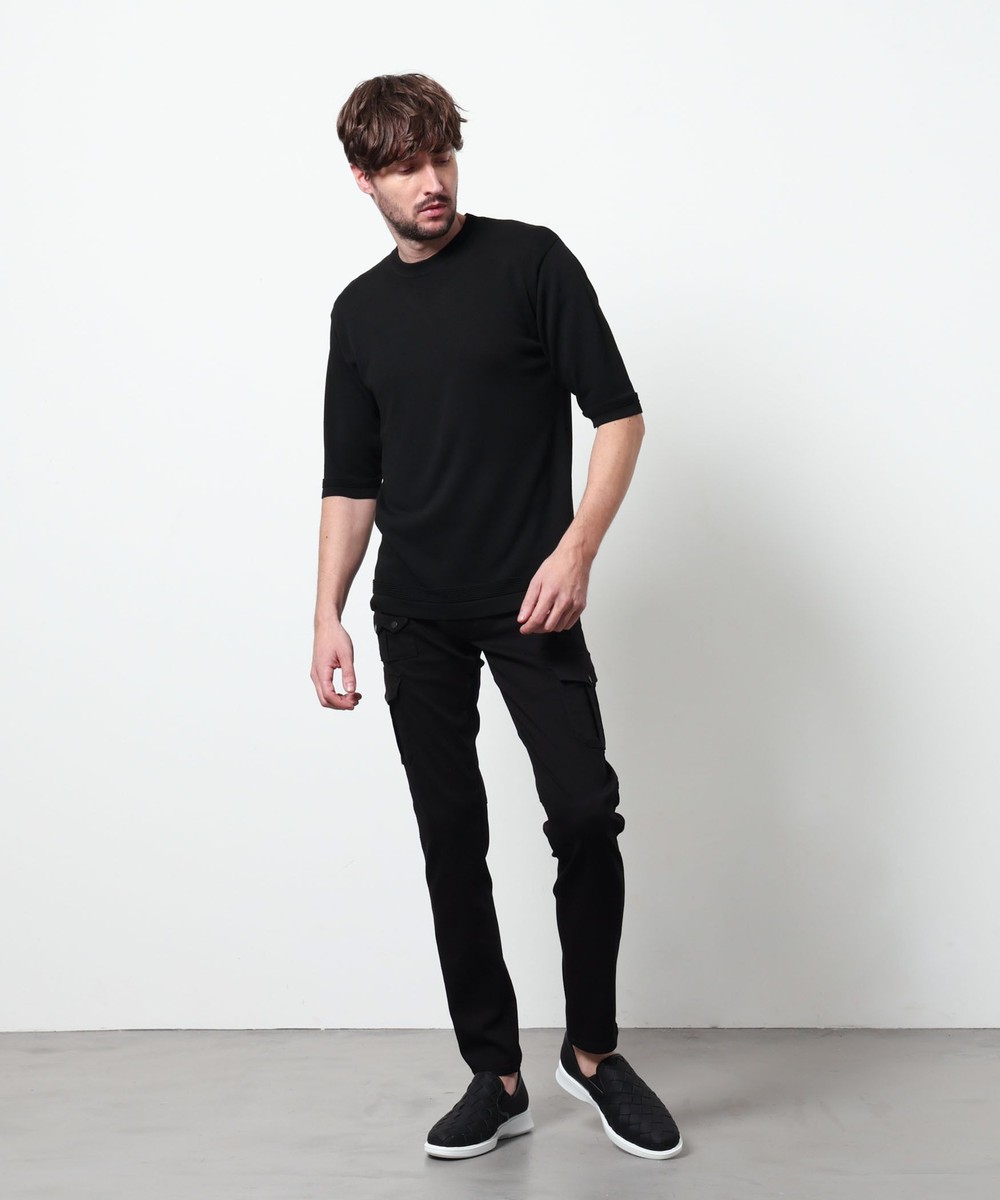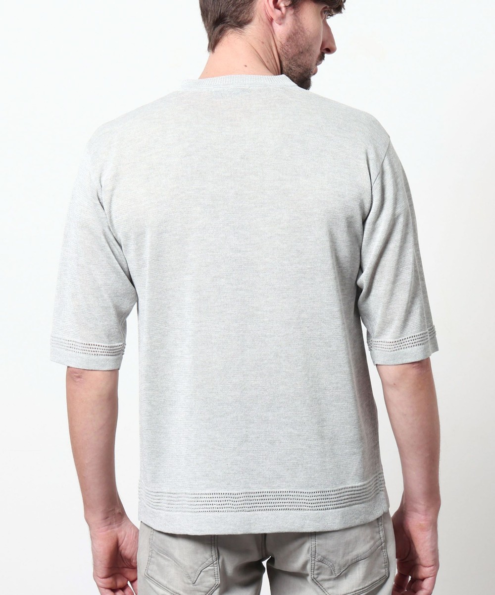 レーヨンポリエステル糸を使用して、12Gのハイゲージで編み立てた半袖天竺編みニットになります。