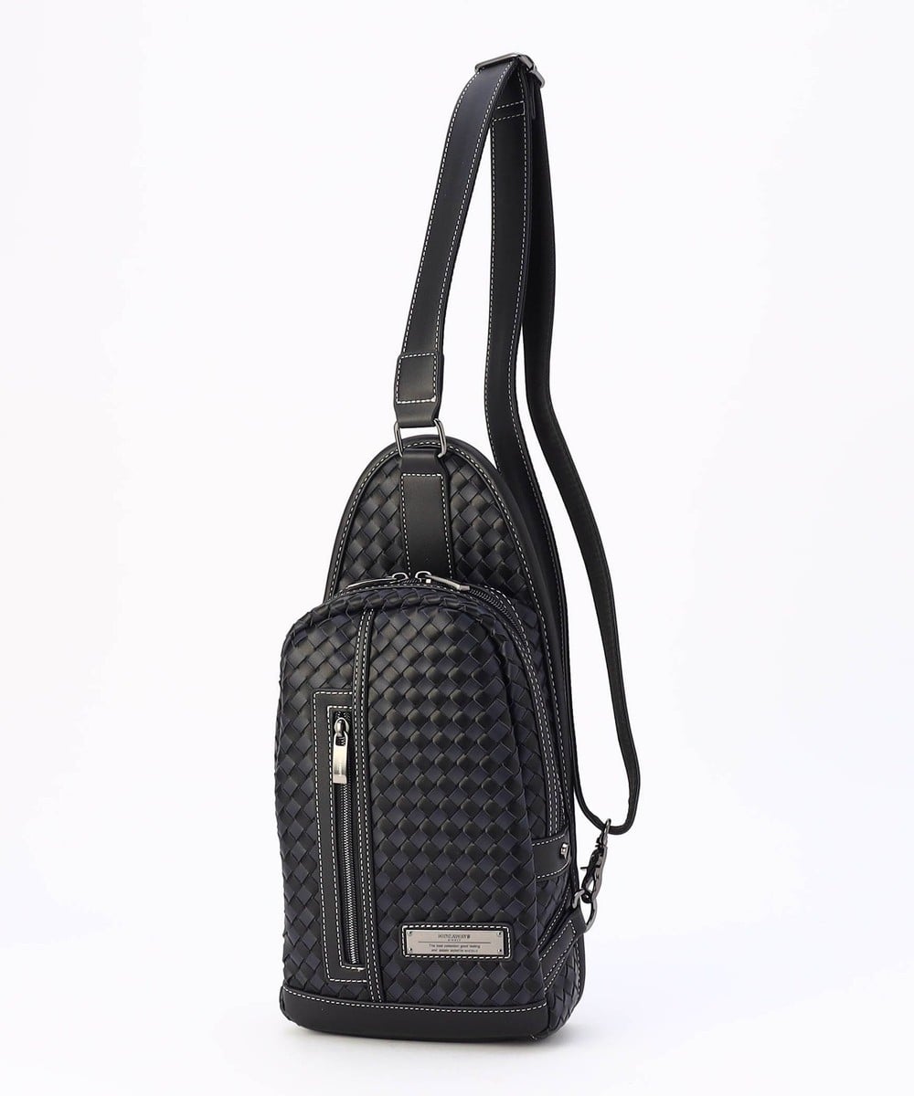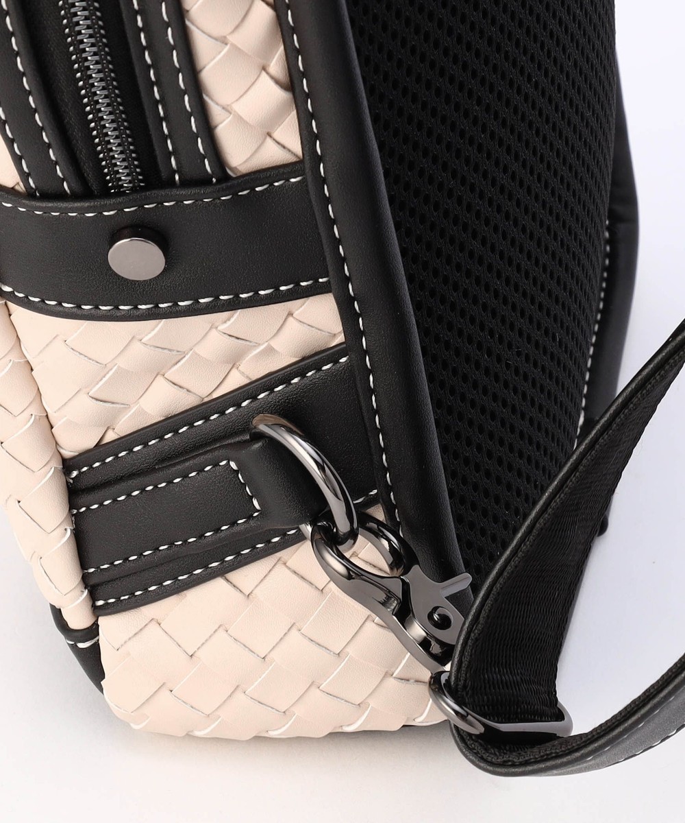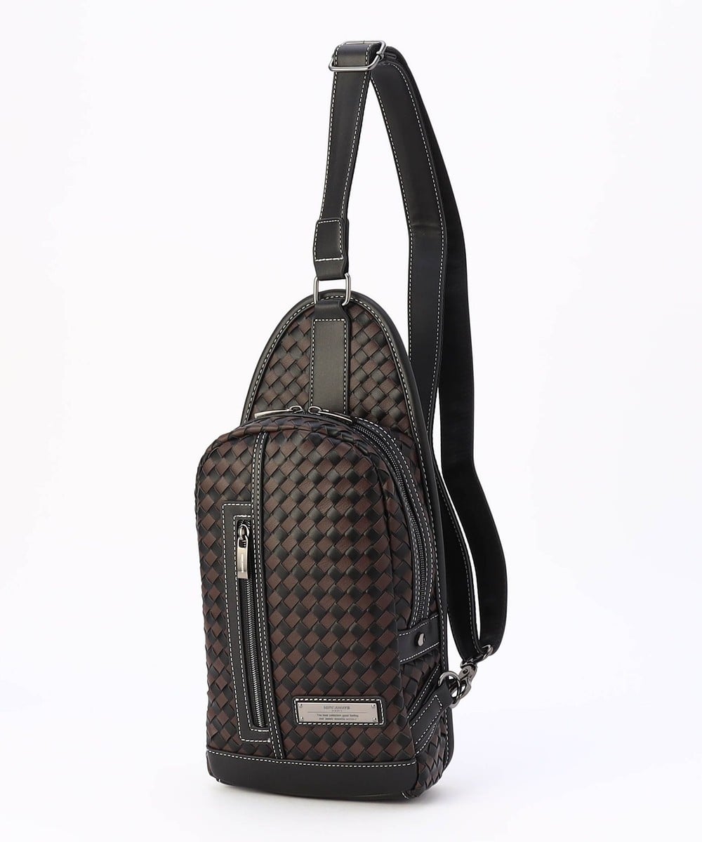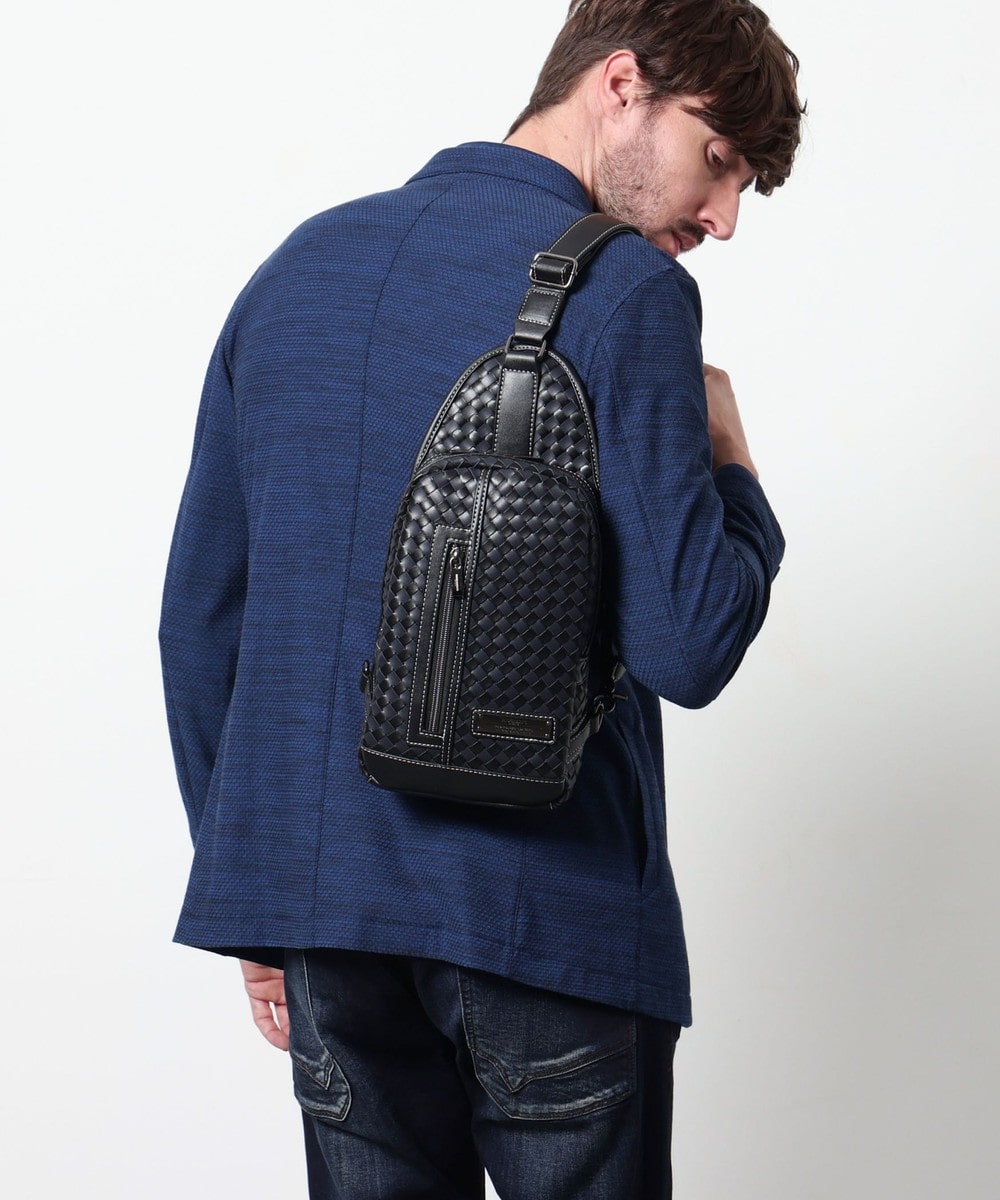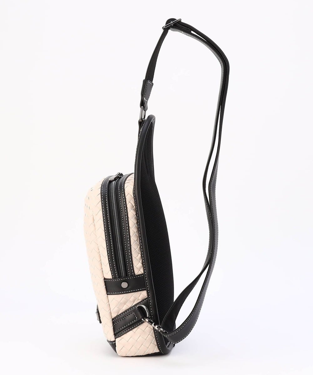 本体部分にツヤ感のある合成皮革をメッシュ調に編み込んだ、高級感溢れるボディバッグ。