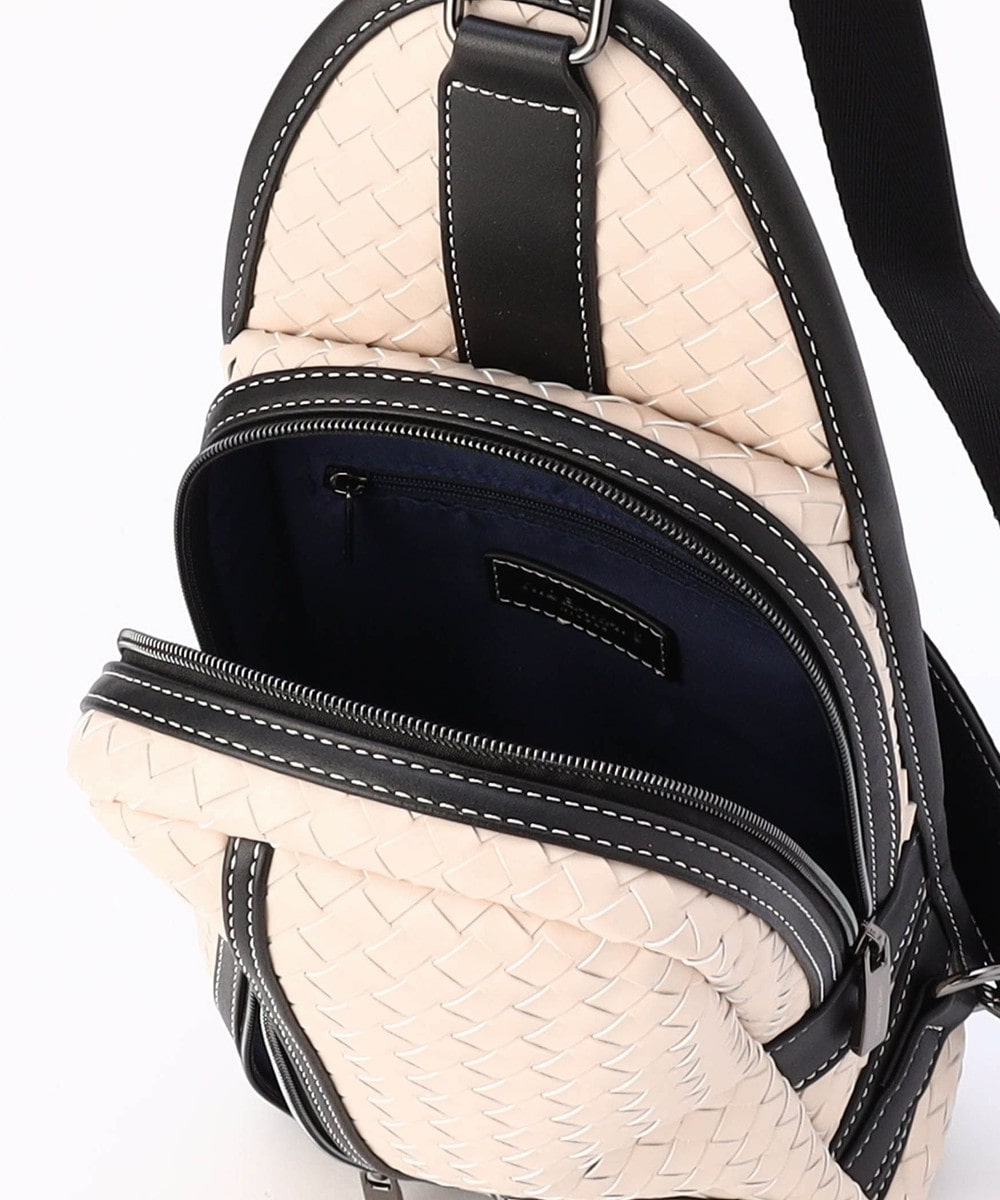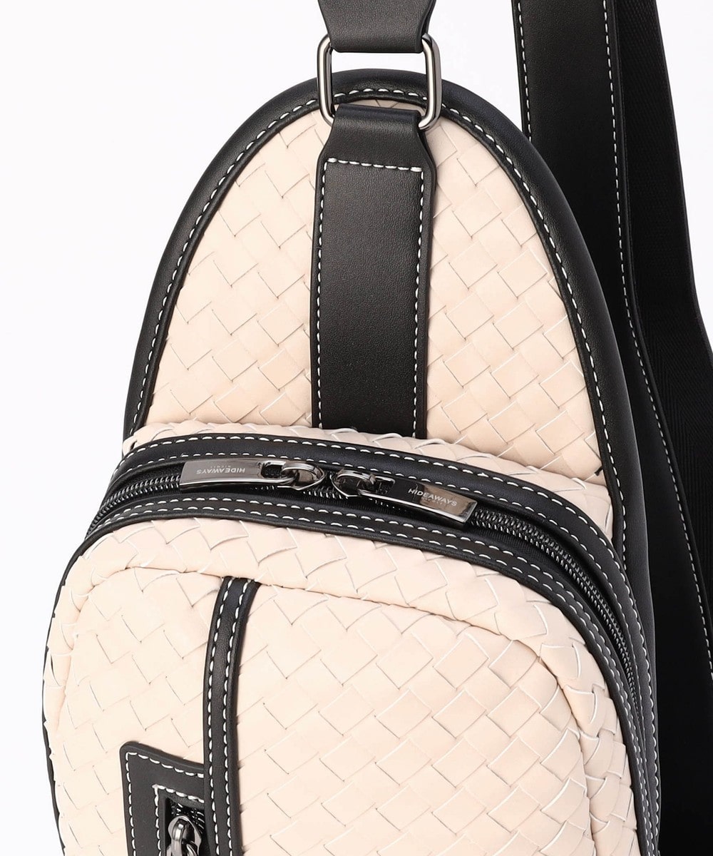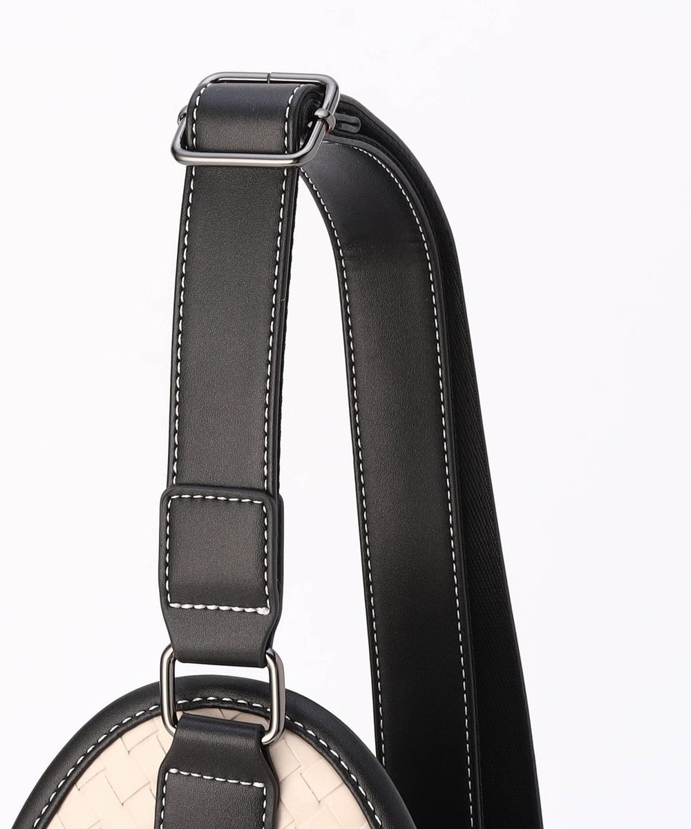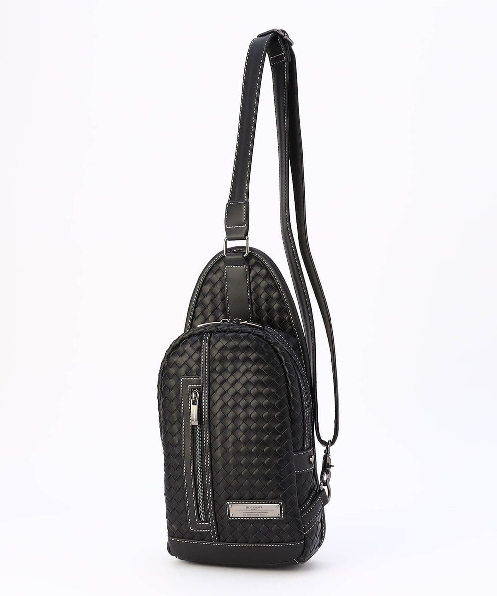 本体部分にツヤ感のある合成皮革をメッシュ調に編み込んだ、高級感溢れるボディバッグ。