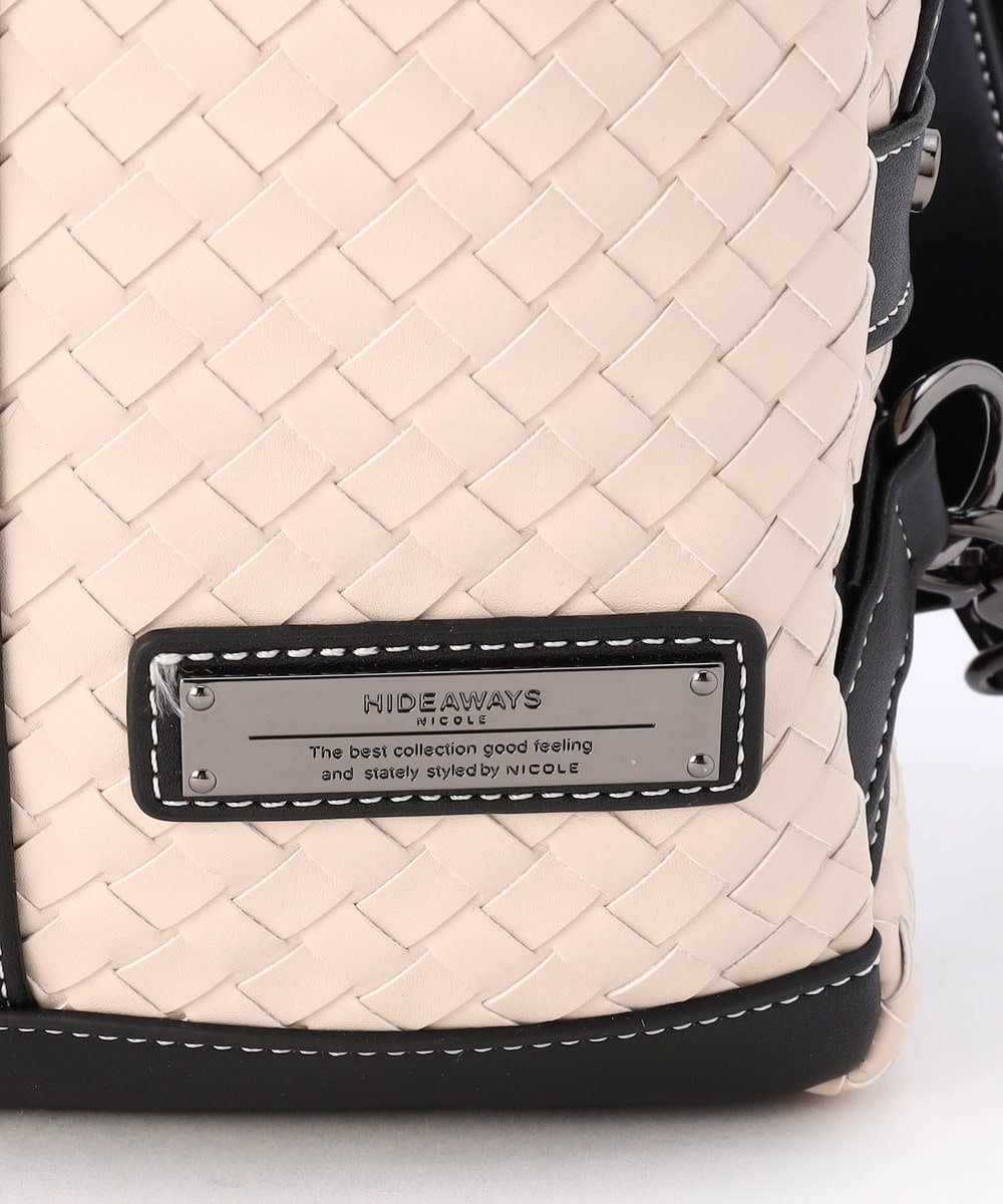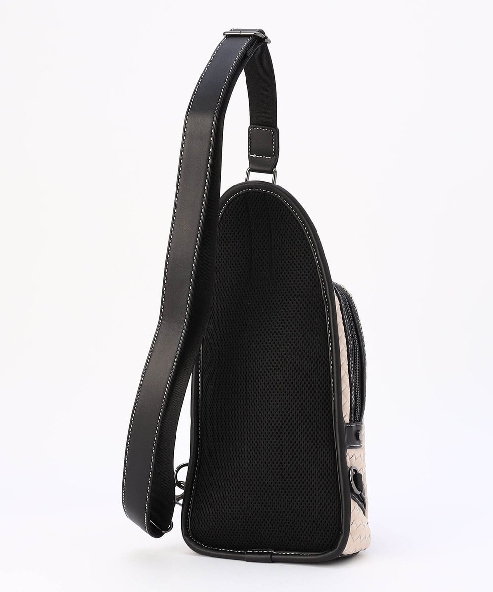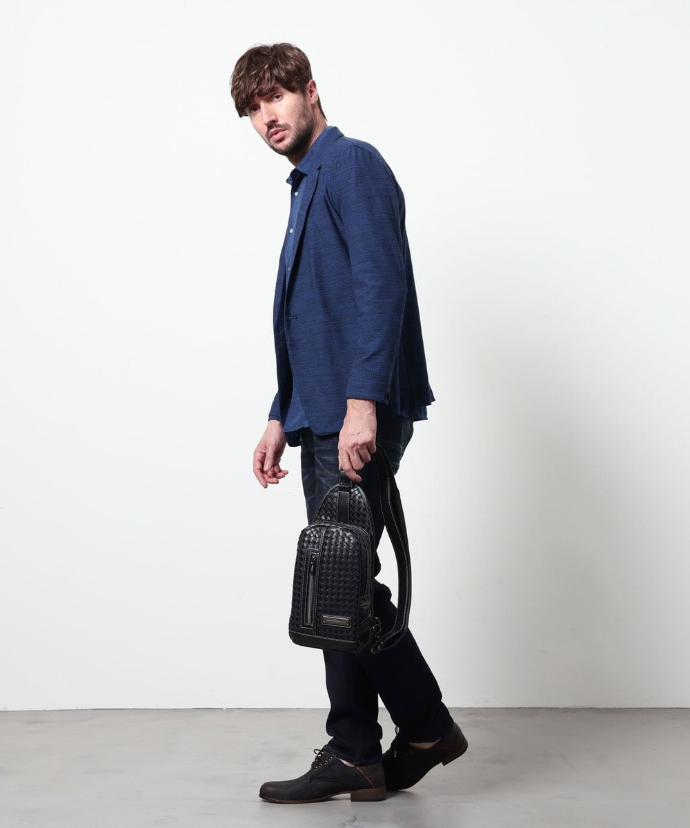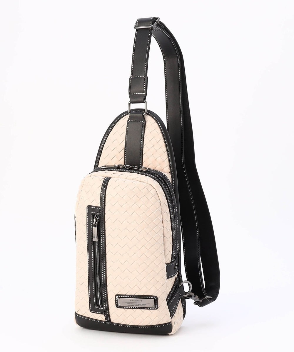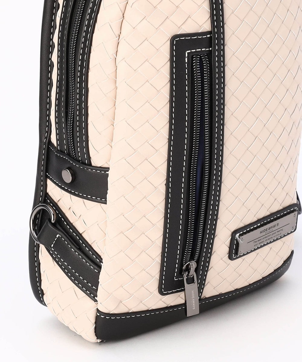 本体部分にツヤ感のある合成皮革をメッシュ調に編み込んだ、高級感溢れるボディバッグ。