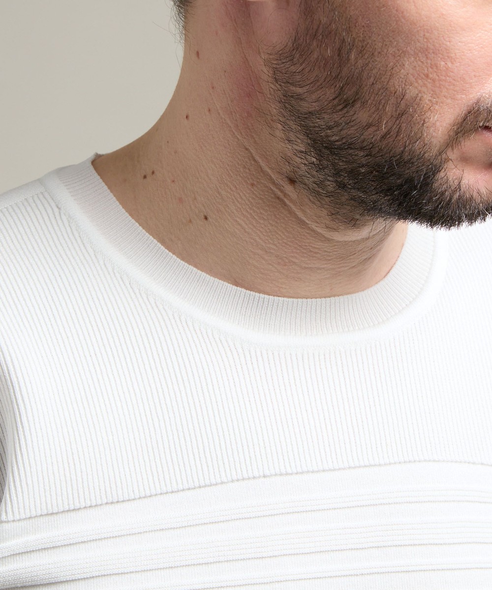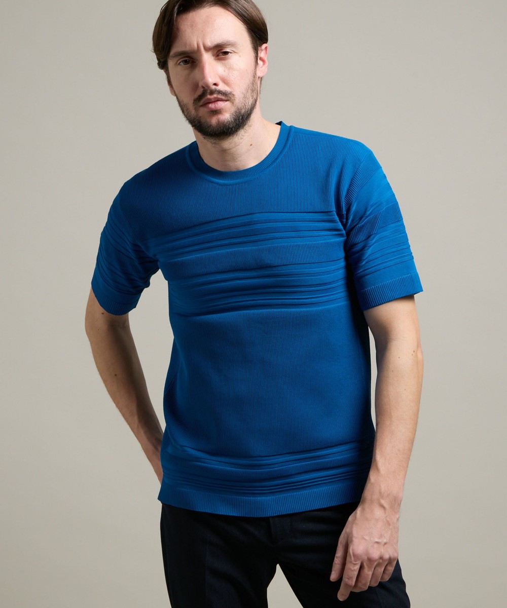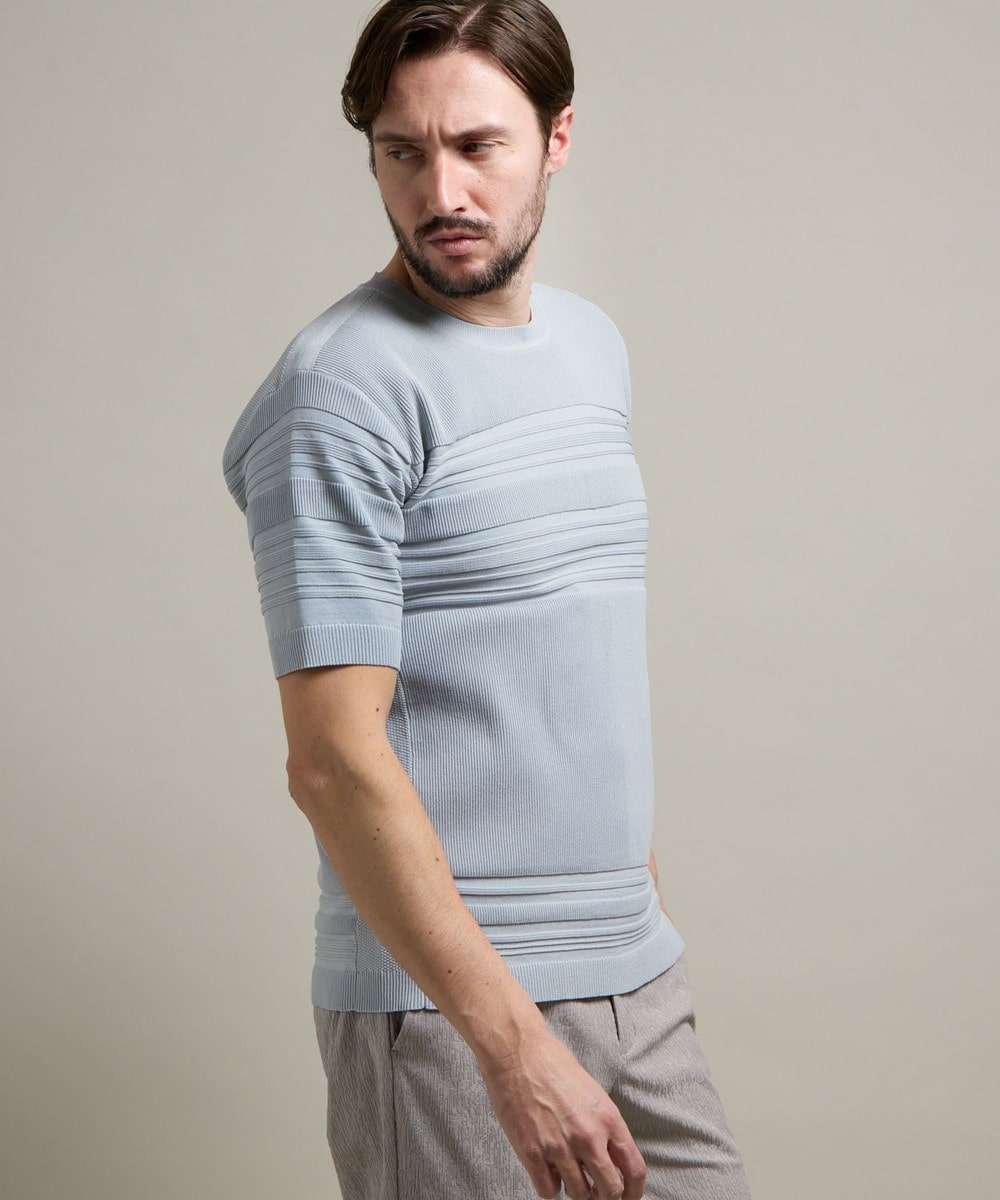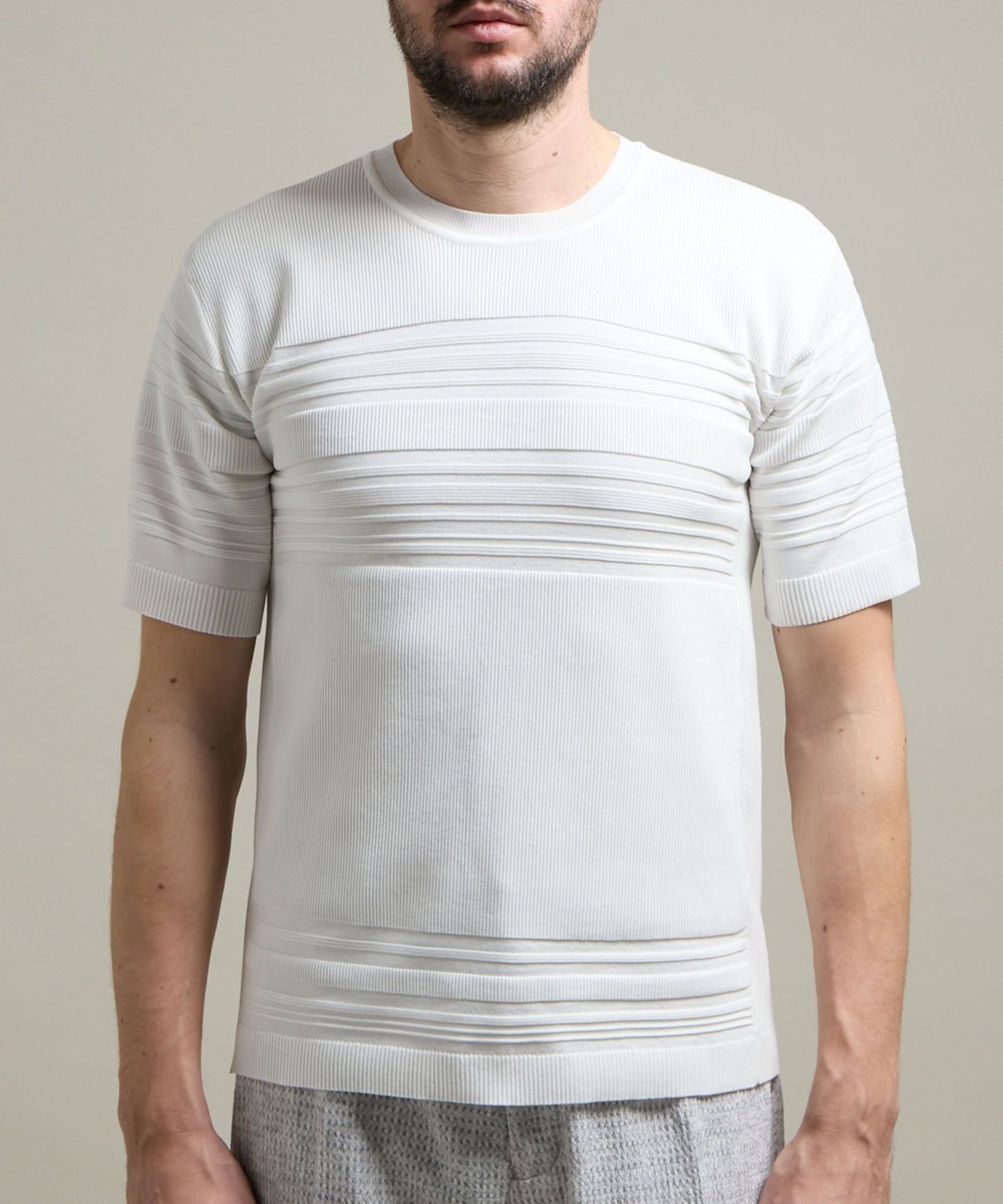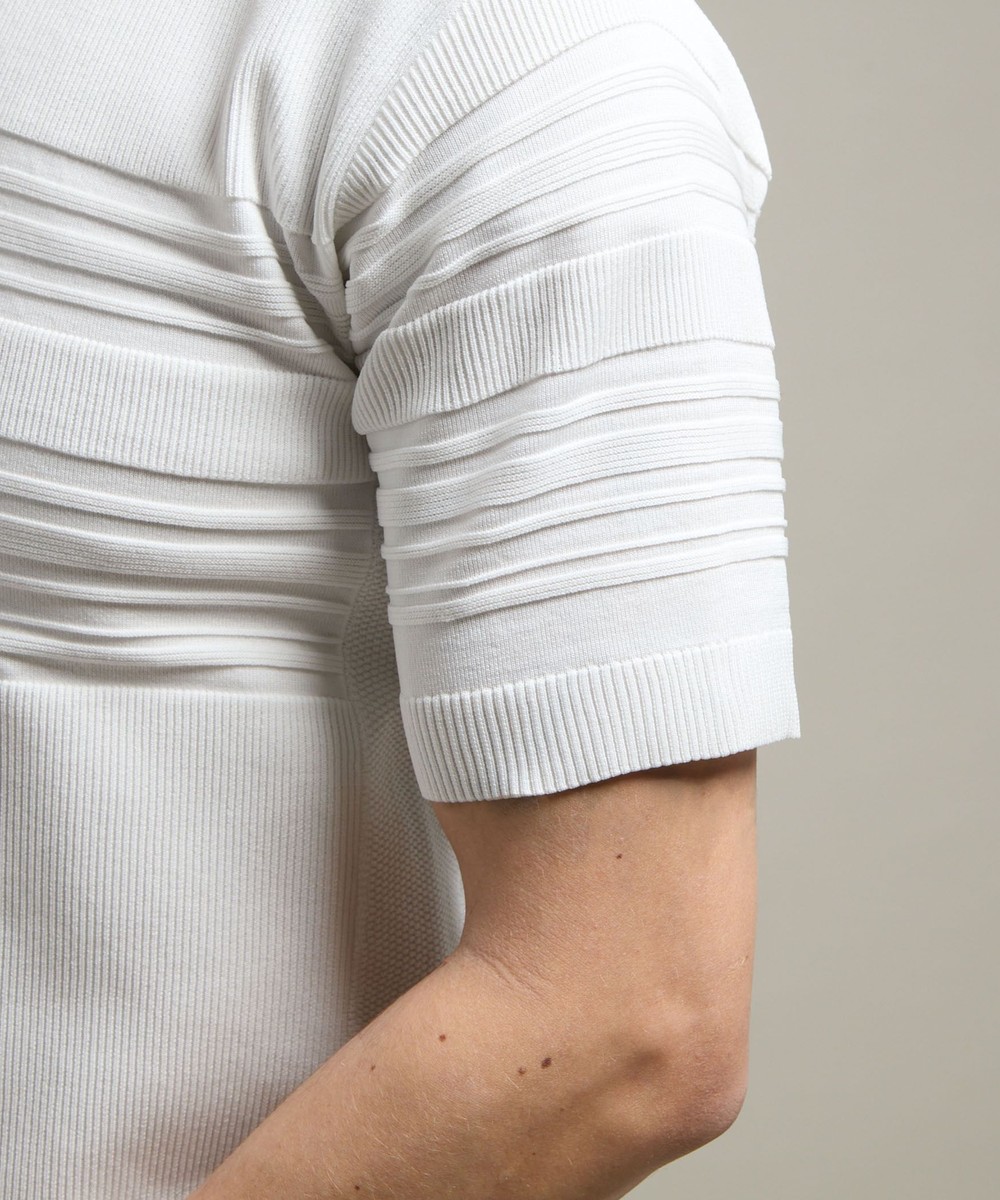 高収縮ポリエステル糸を使用し、14Gのハイゲージで高密度に編みたてた半袖ランダムタックボーダージャカードニットになります。