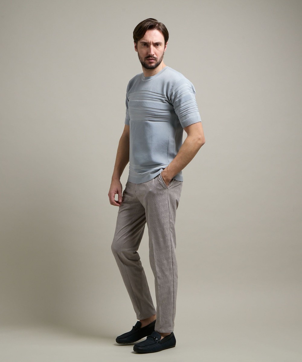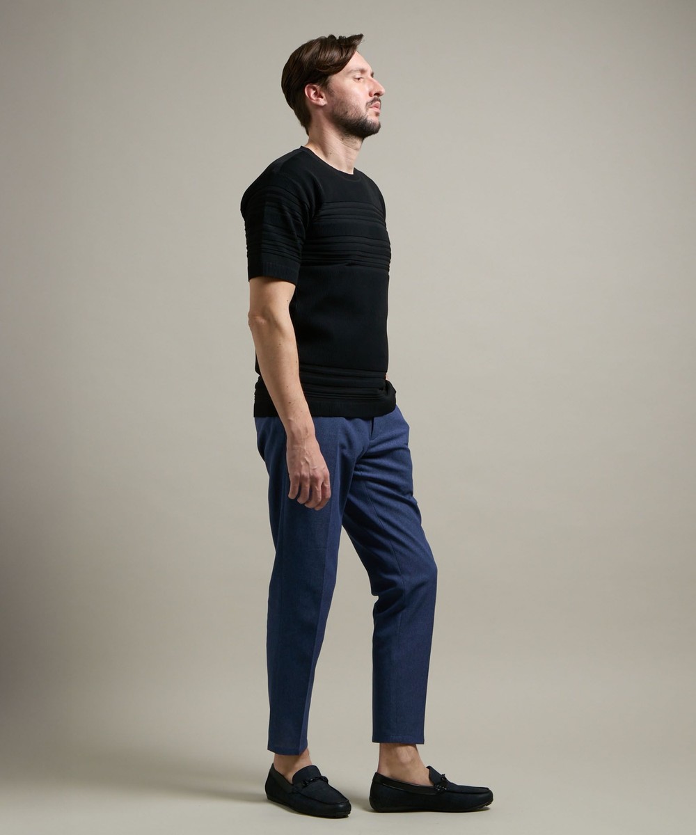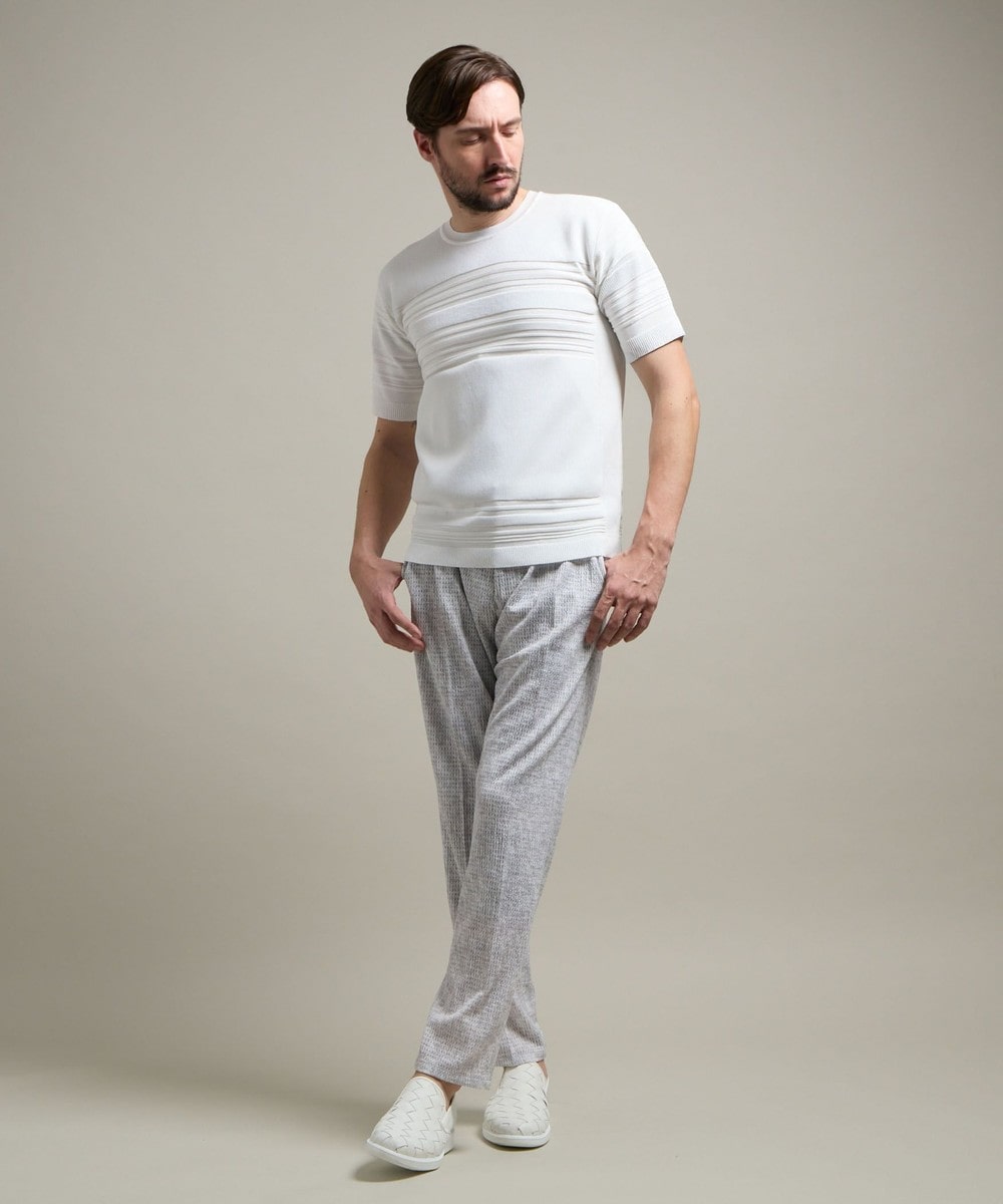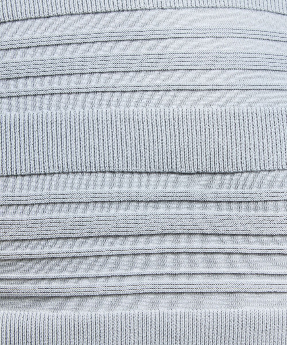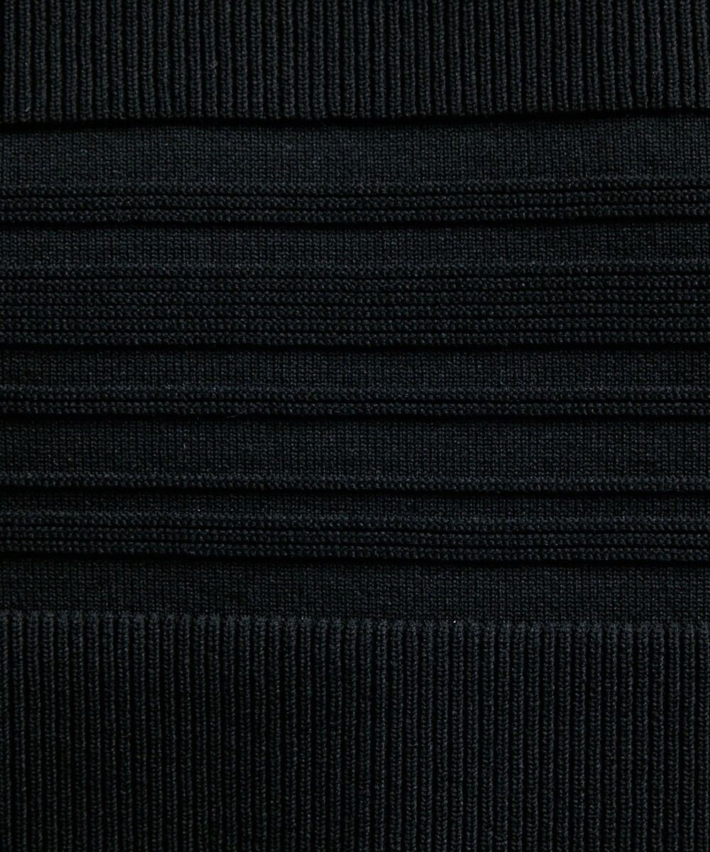 高収縮ポリエステル糸を使用し、14Gのハイゲージで高密度に編みたてた半袖ランダムタックボーダージャカードニットになります。